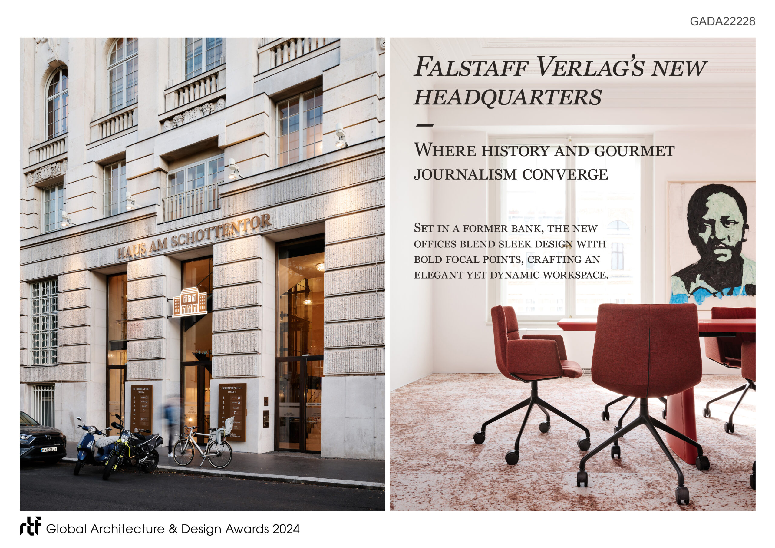 The new headquarters for Falstaff Verlag: gourmet journalism in a historic bank building In the search for a new joint location for the company divisions based in Vienna, Falstaff found what they were looking for in the former headquarters of Creditanstalt-Bankverein – now called “Haus am Schottentor” – at Schottengasse 6-8.