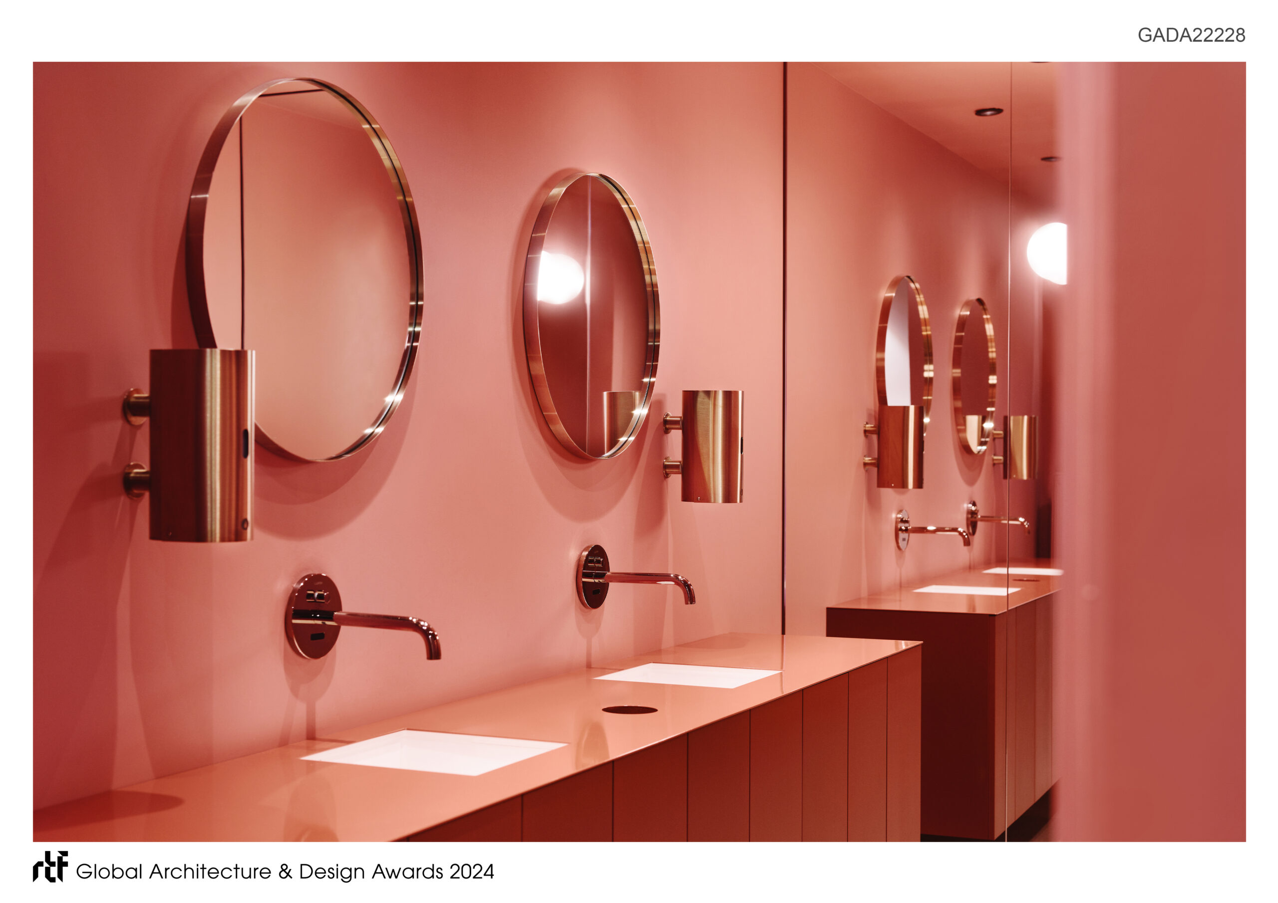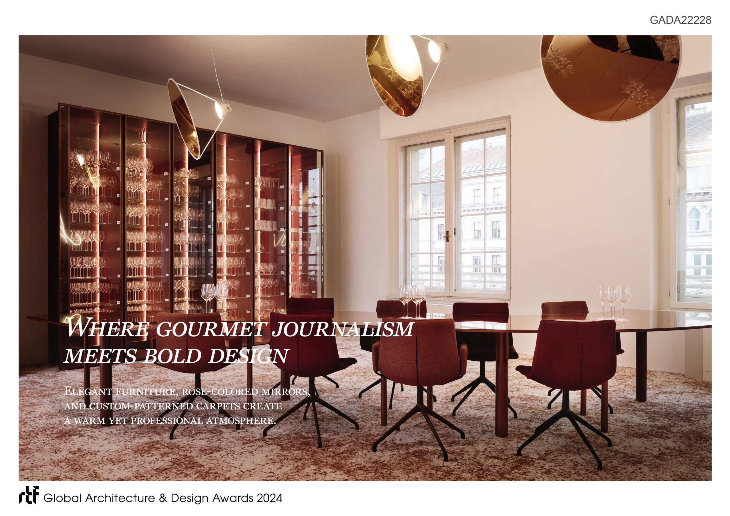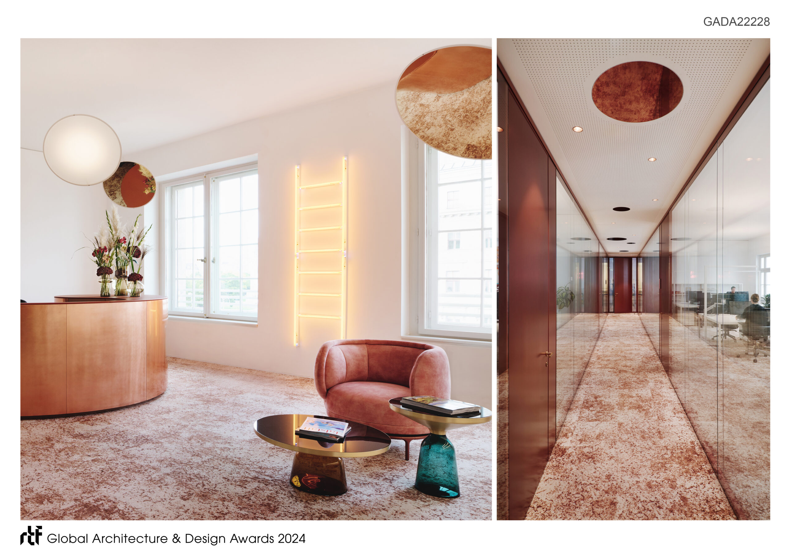 The design of the “points of interest” emphasizes the identity of the publishing house and offers inspiring spaces for employees and visitors to experience the themes of the publishing house – culinary, travel and design. The central design elements are white furniture fronts, some of which have a perforated pattern that echoes the acoustic ceilings of the corridors. Rose-colored mirrors on the walls and ceilings, office partitions in glass with bordeaux-red profiles and the carpet in a specially designed pattern to match the color concept create a clear, bright and warm atmosphere.