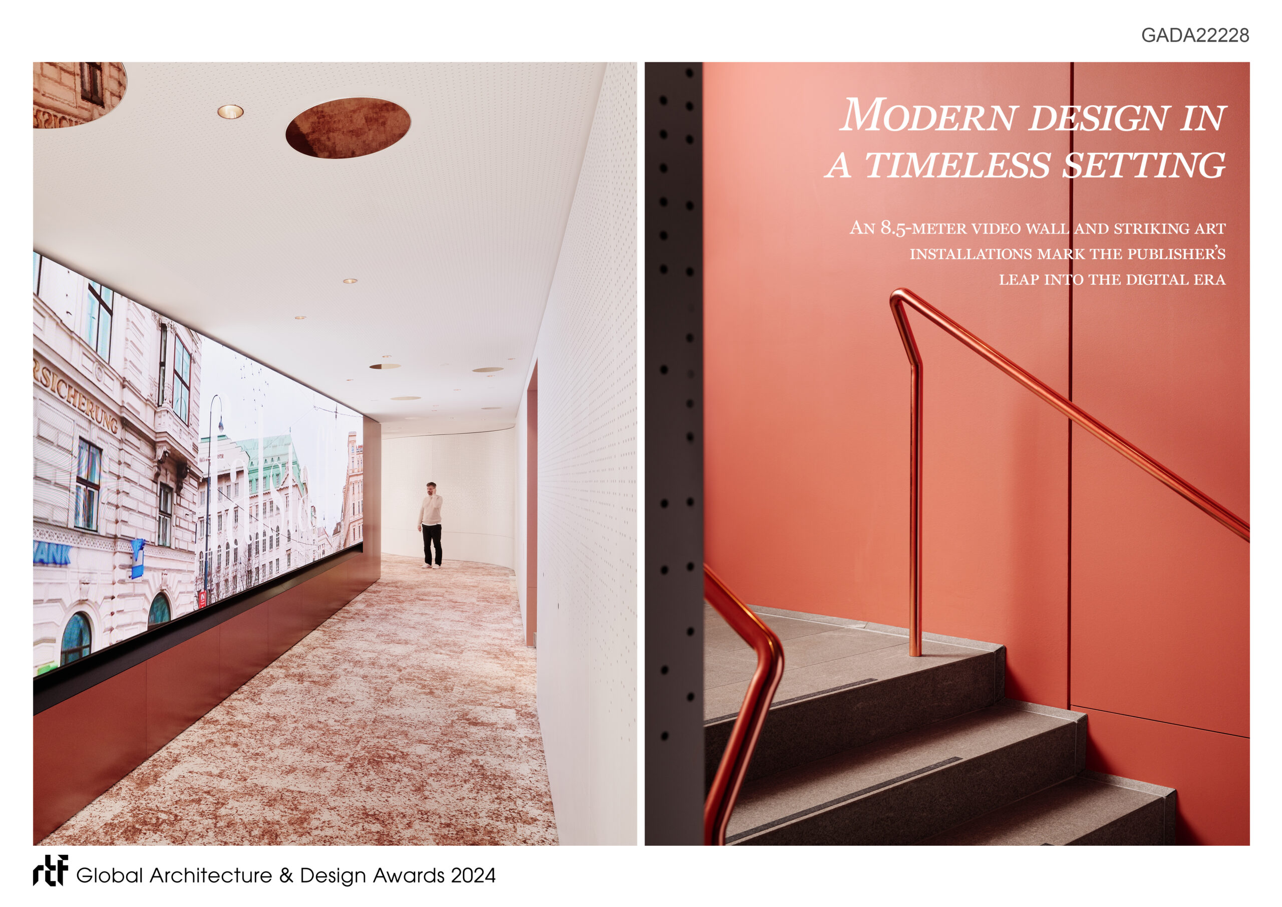 An 8.5 meter long and 2-meter-high video wall dynamically conveys the Falstaff world of enjoyment. The screen connects the two wings and symbolizes the publishing house’s transformation process into the digital age.