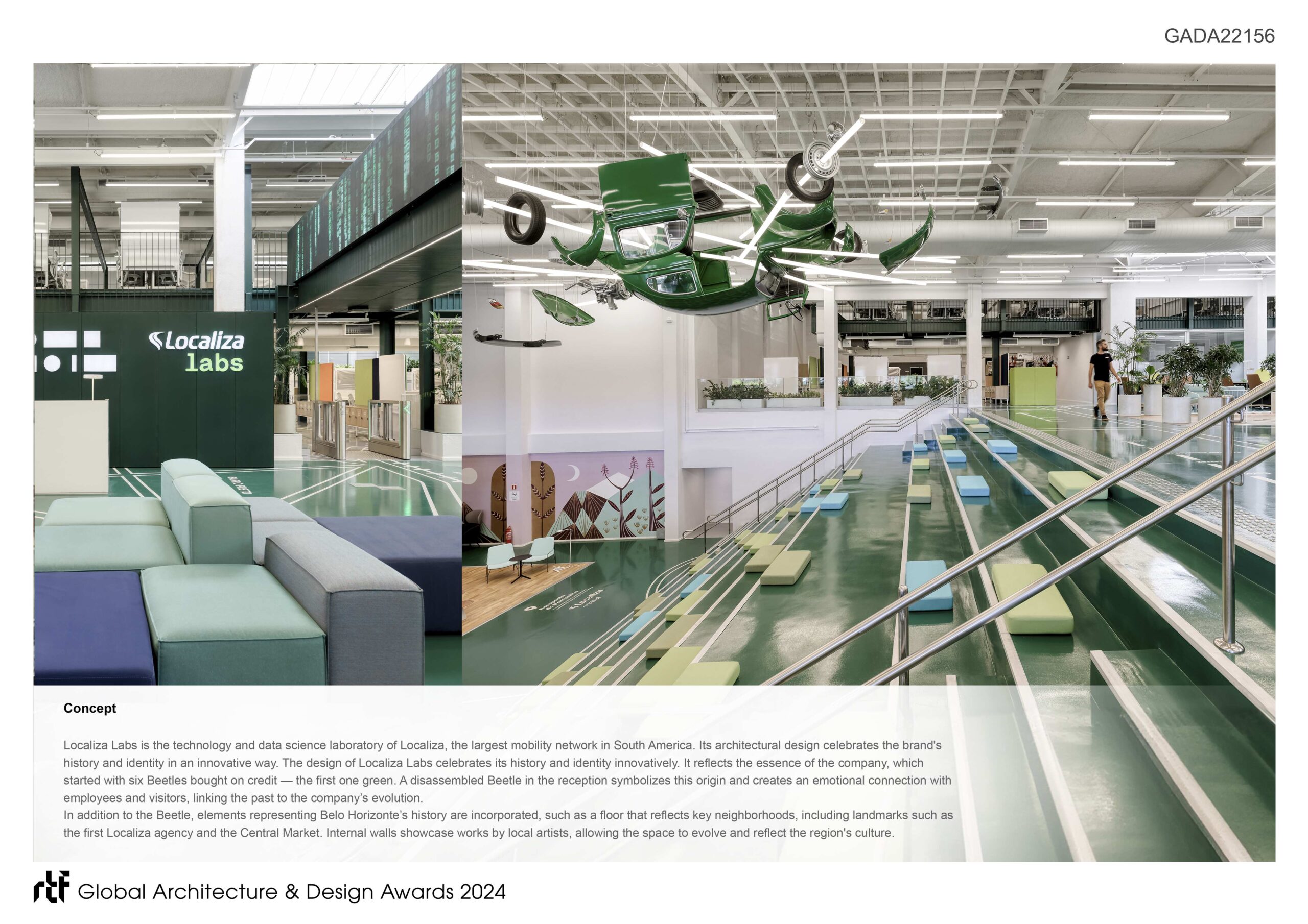 Localiza Labs is the technology and data science laboratory of Localiza, the largest mobility network in South America. The design of Localiza Labs celebrates the company’s history, which began with the purchase of six Volkswagens Beetle bought on credit. A dismantled Beetle in the reception symbolizes this origin, creating an emotional connection with employees and visitors. The floor represents the main neighborhoods of Belo Horizonte, while the internal walls showcase works by local artists, allowing the space to evolve with regional culture.