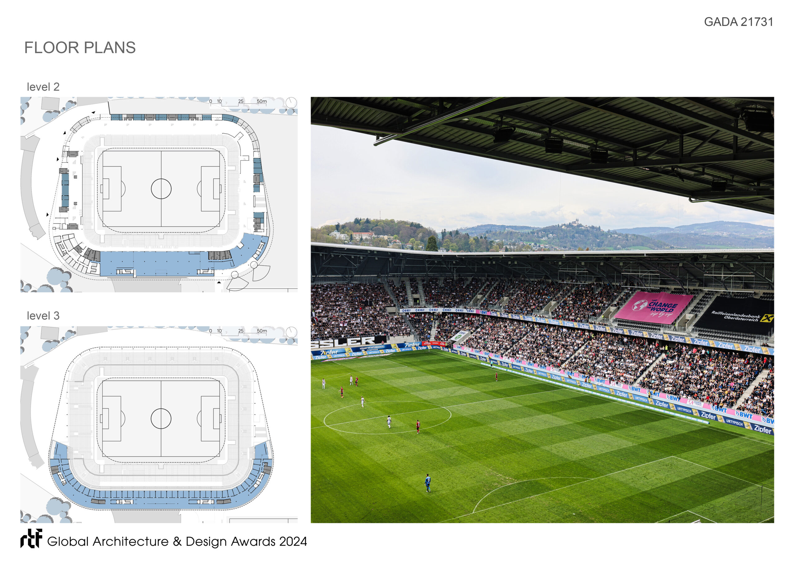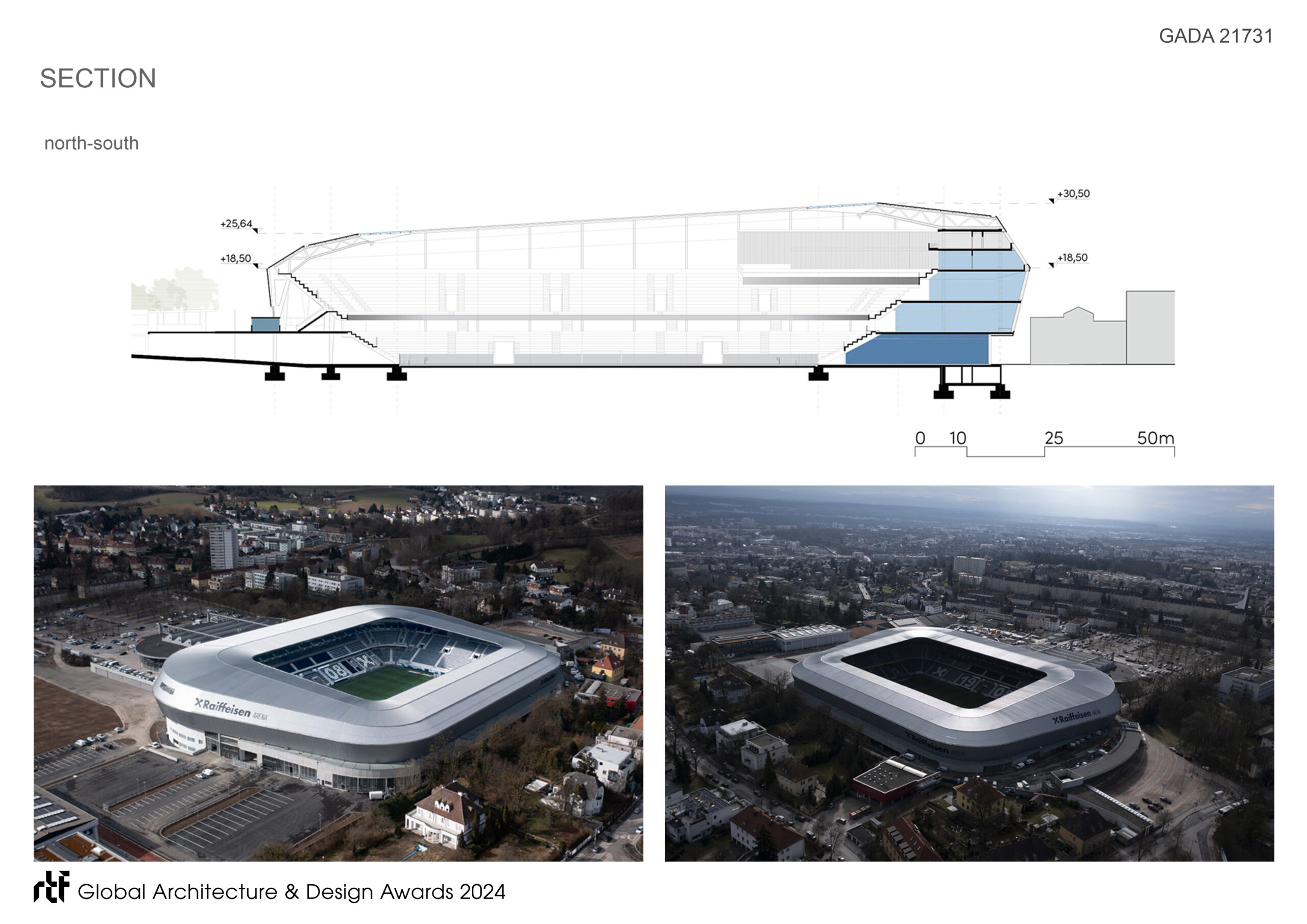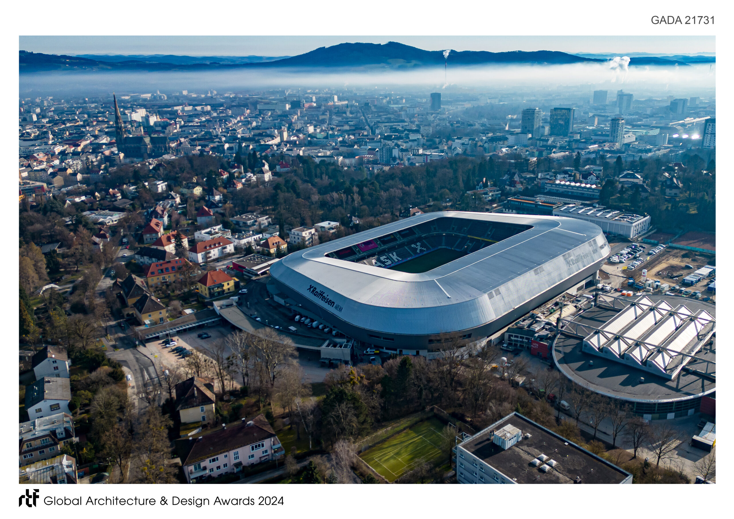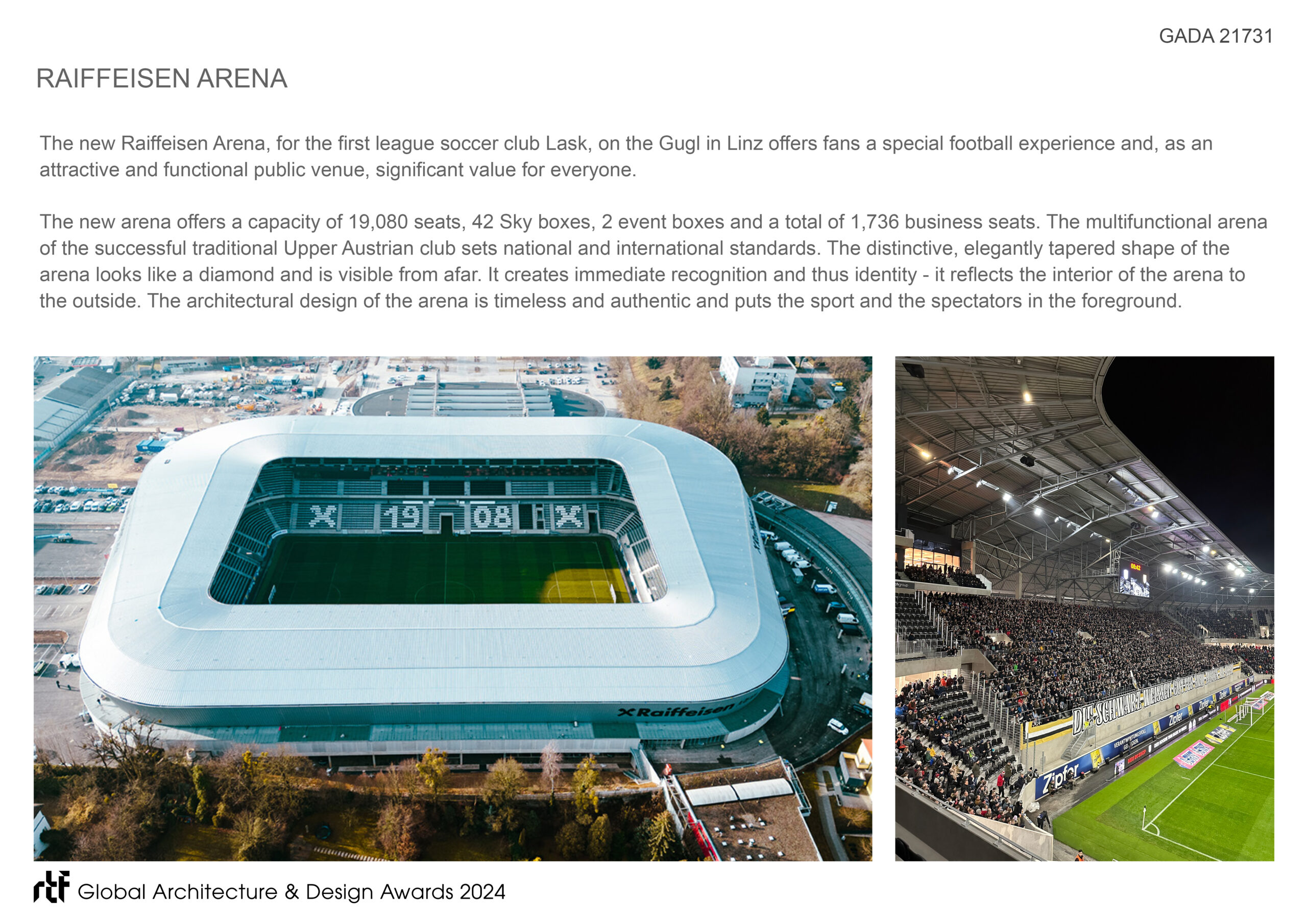 The new Raiffeisen Arena, for the first league soccer club Lask, on the Gugl in Linz offers fans a special football experience and, as an attractive and functional public venue, significant value for everyone.