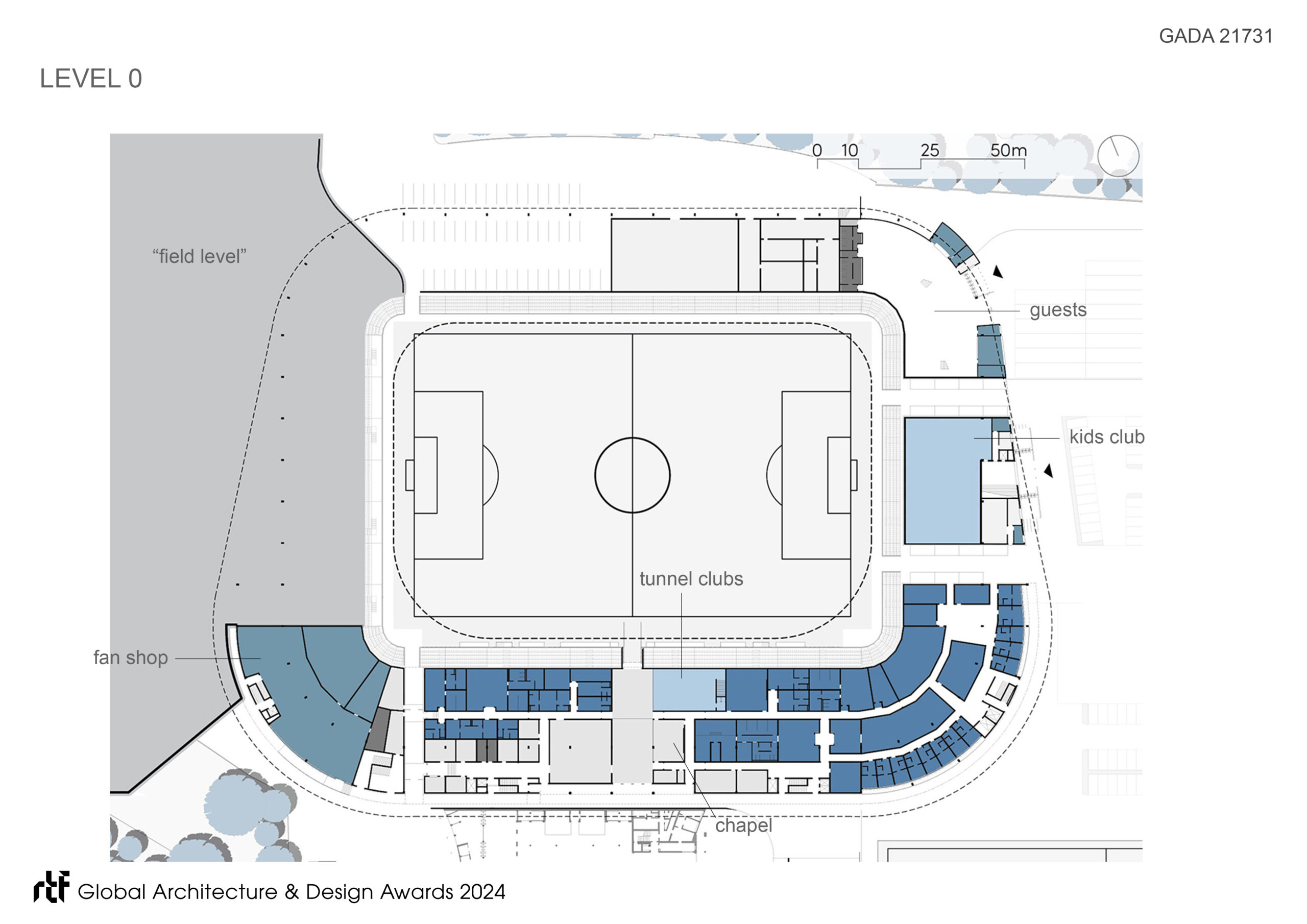 Carefully tailored to the spatial requirements, the bevelled metal shell of the arena reduces the visual height of the arena roof and shields the stadium atmosphere from the outside, both acoustically and in terms of light. The unique shape of the roof and building is characterized by this metal cladding, which is pierced in places with louvres to bring light into the interior of the building. The promenade level is shielded by the single-story kiosk and adjoining room zone.
