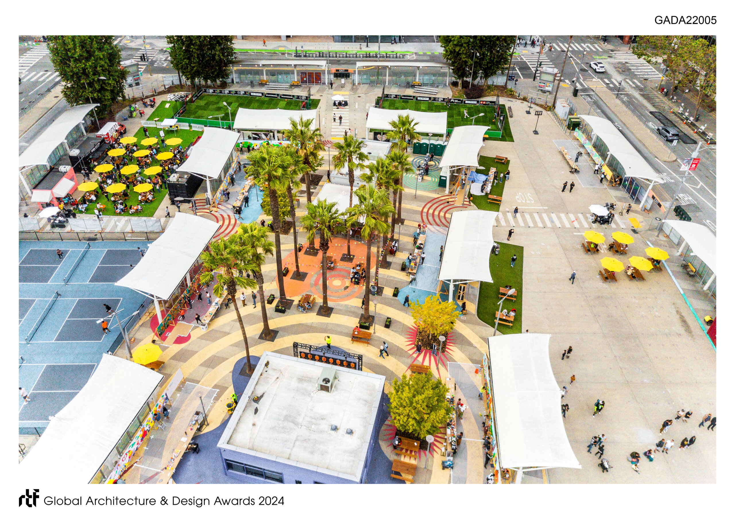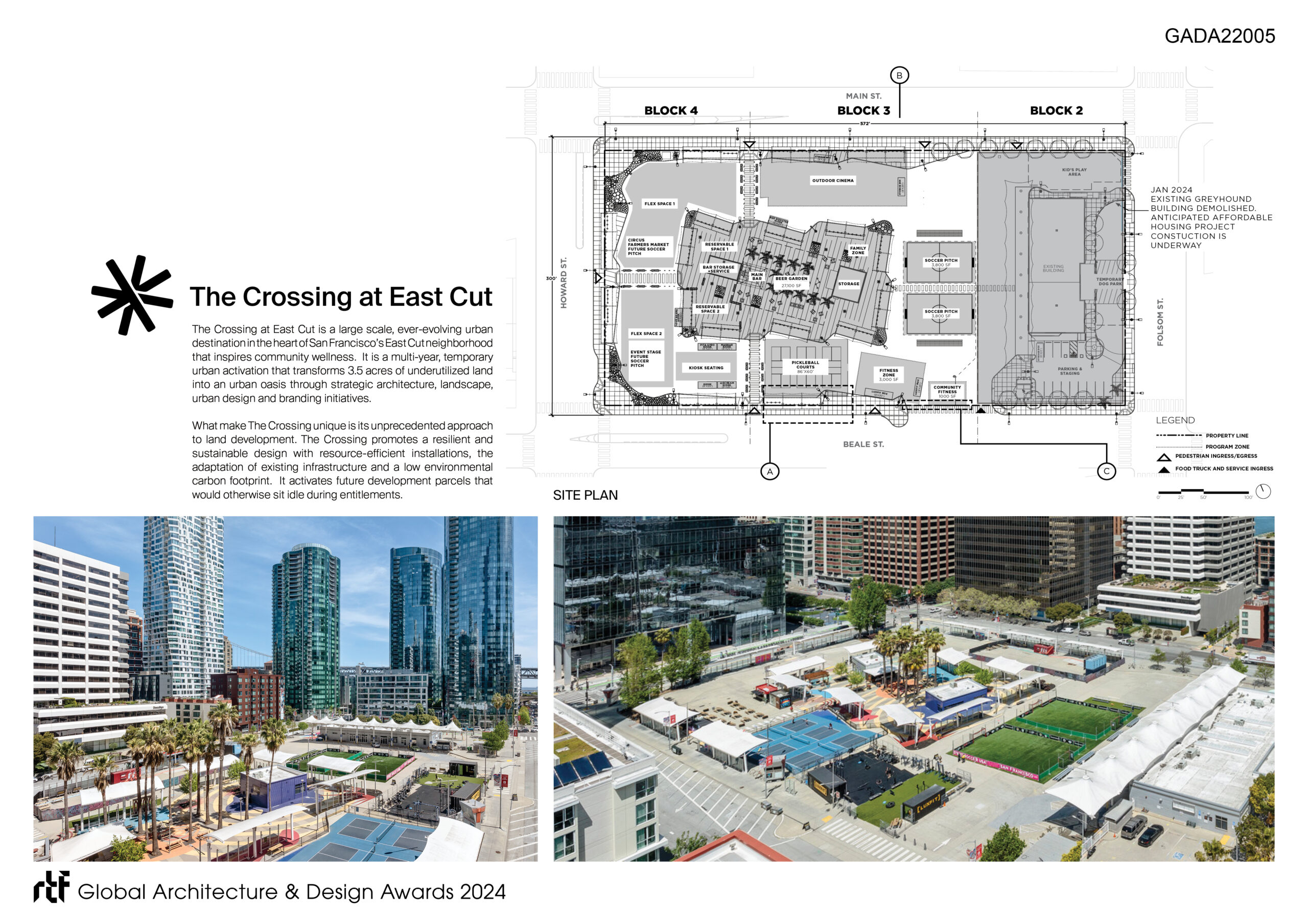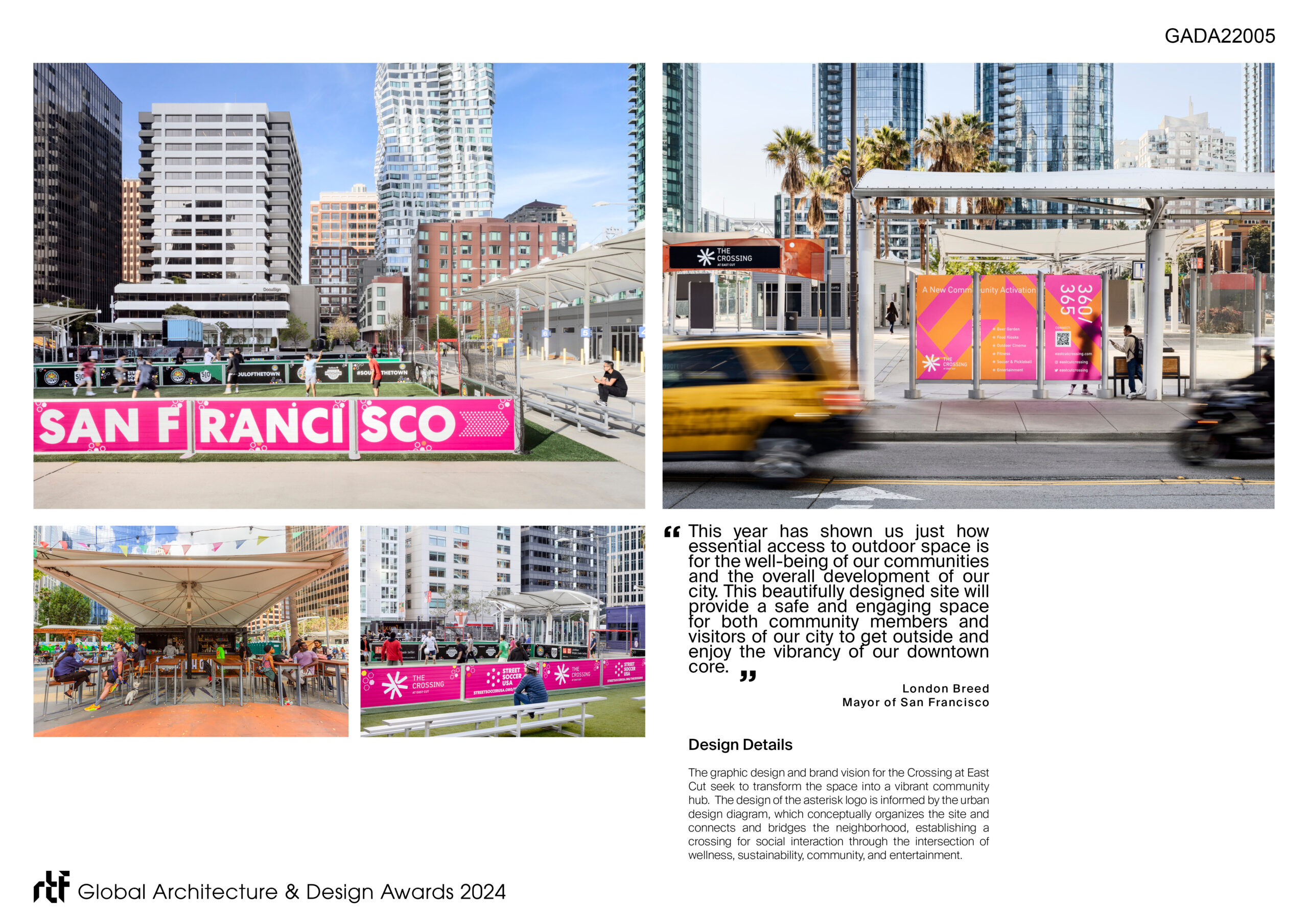 The Crossing at East Cut in San Francisco, CA is a multi-year temporary urban activation in response to bringing people together after the pandemic. Through a public and private sector partnership, the 3.5-acre former Temporary Transit Terminal has been transformed into a new regional destination for locals and tourists alike.  It brings people together with around-the-clock activations and amenities to celebrate community, promote active wellness, and enjoy a dynamic spectrum of entertainment experiences. The project is committed to the idea of partnership driving investment, community, and sustainability. The site is free and open to the public and activates future development parcels that would otherwise be fenced off during entitlements.