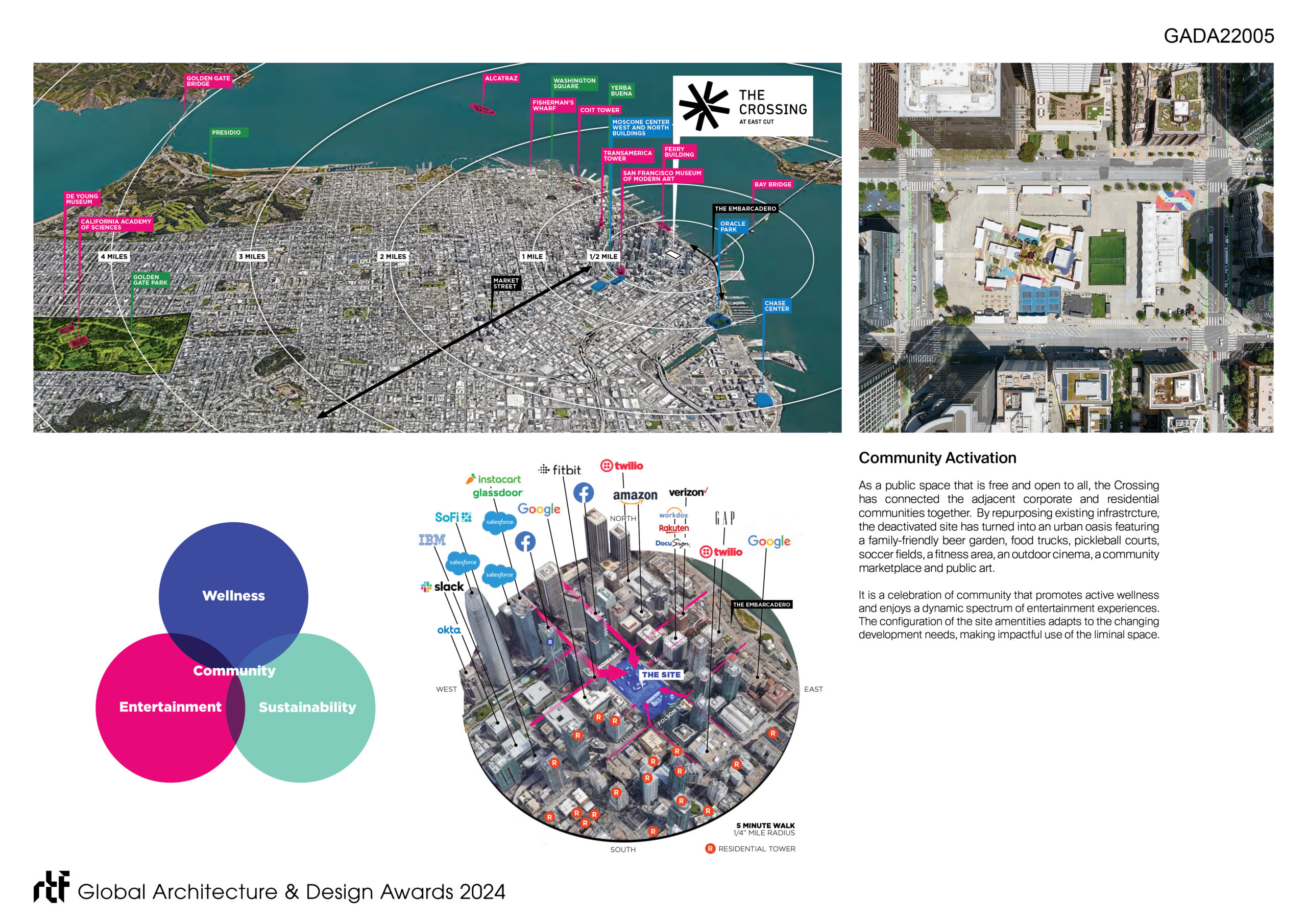 The site is one of only a few remaining undeveloped parcels in downtown SF. Future developments for the 3 parcels include affordable housing and a public park.  The site is situated in an area of downtown that has the tallest high-rise buildings, both commercial and residential, where daytime workers and the residential population rarely intersected until the Crossing site was activated. The asterisk logo we designed as part of the branding is informed by the urban design diagram, which conceptually organizes the site and connects and bridges the neighborhood, establishing a crossing for social interaction through the intersection of wellness, sustainability, community, and entertainment.
