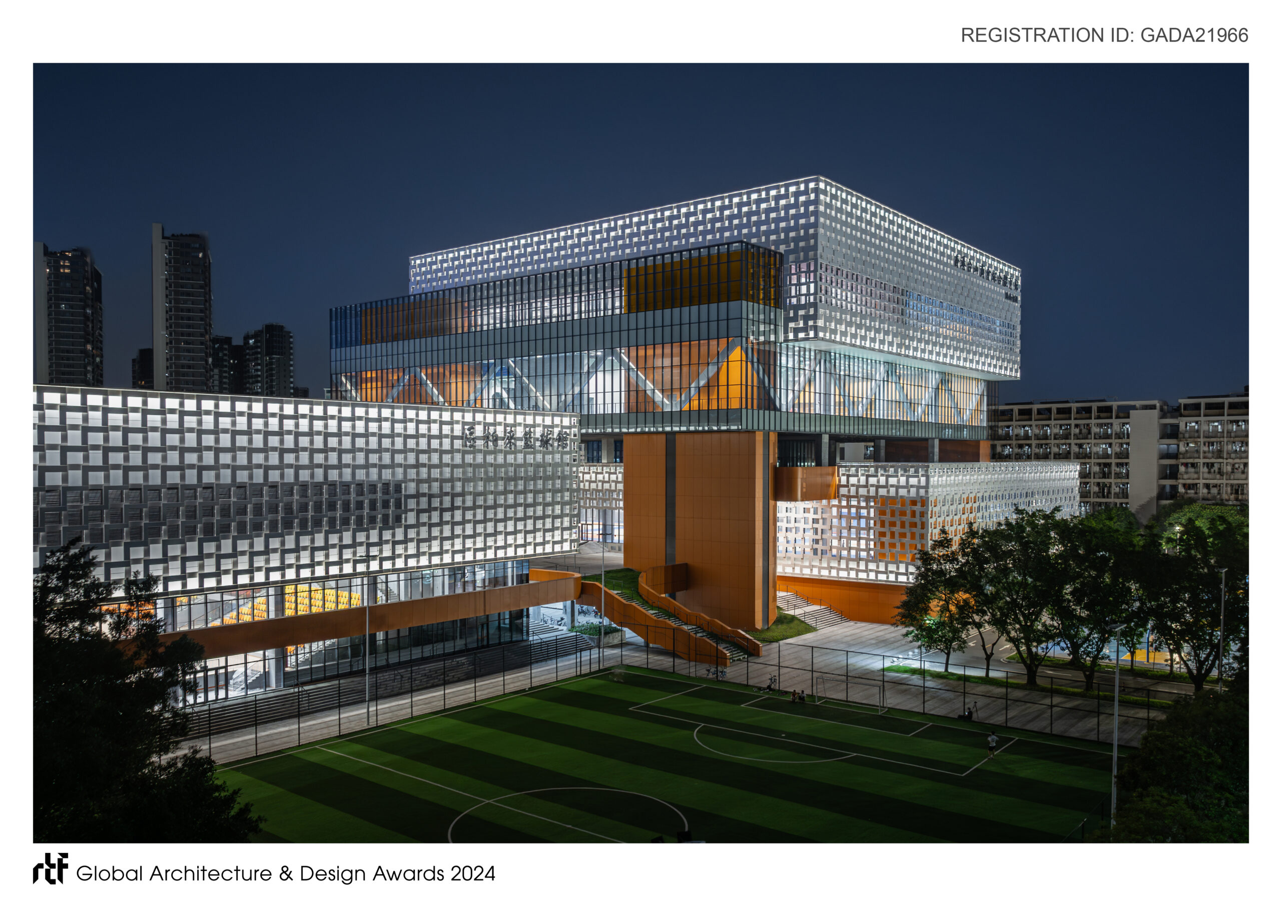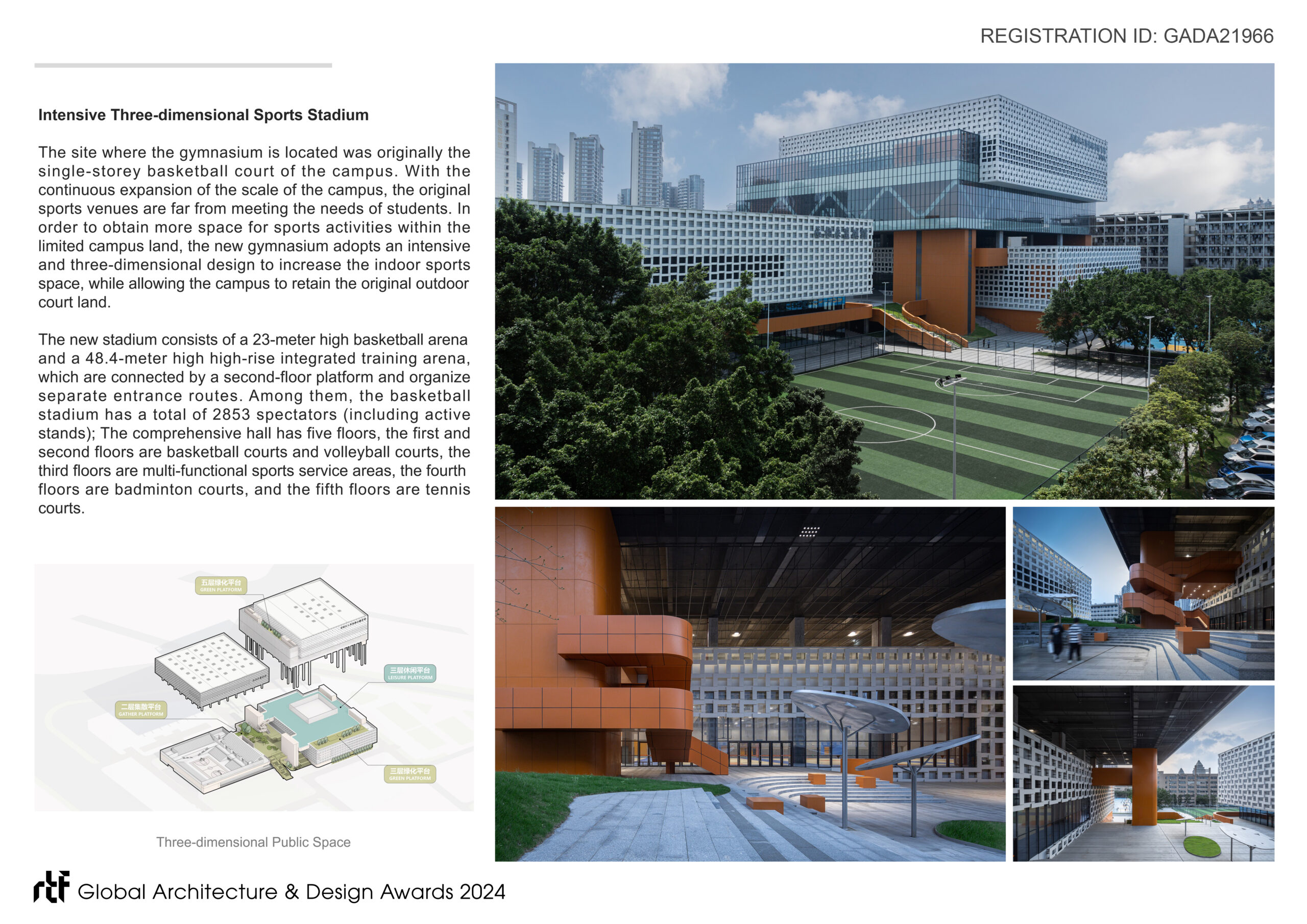 The design uses hollowing, overhead, staggered and other methods to weaken the building volume and reduce the sense of pressure of large volume on the surrounding environment. The building is partially elevated, allowing the campus landscape and line of sight to penetrate and cross, and is also the embodiment of climate adaptation. The project not only has the function of a gymnasium, but also combines three-dimensional greening to become a leisure activity space for students, echoing the open education mode of the new era.