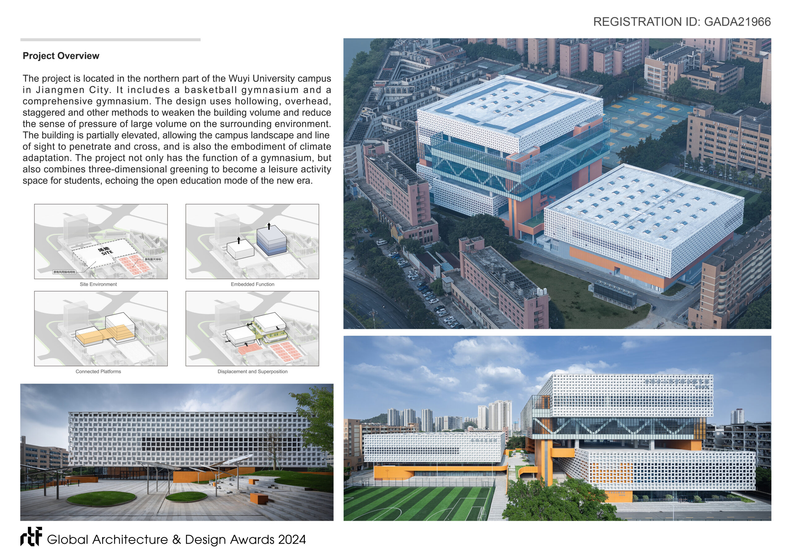 The project is located in the northern part of the Wuyi University campus in Jiangmen City. It includes a basketball gymnasium and a comprehensive gymnasium. Among them, the building height of the basketball stadium is 23.10m, with one underground floor and two above-ground floors; The building height of the comprehensive gymnasium is 48.40m, with five floors above ground. The two venues are connected through the second-floor platform and organize independent entrance flow lines to achieve spatial connectivity and unity in shape.