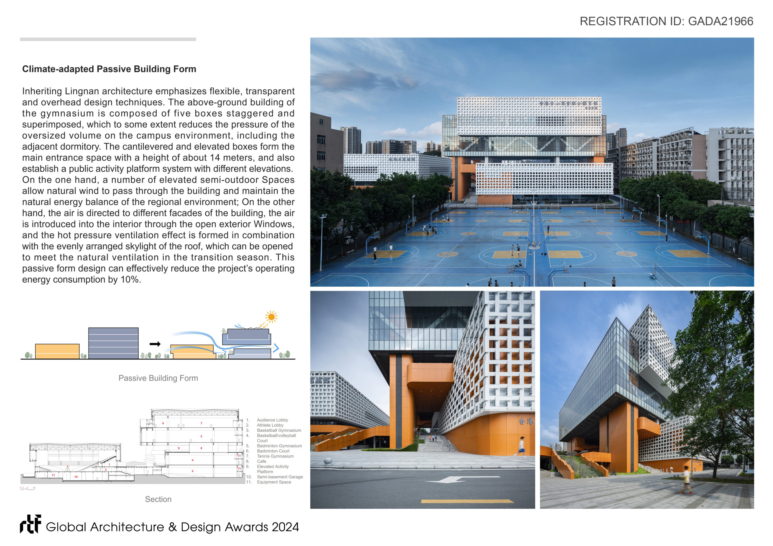 Inheriting Lingnan architecture emphasizes flexible, transparent and overhead design techniques. The above-ground building of the gymnasium is composed of five boxes staggered and superimposed, which to some extent reduces the pressure of the oversized volume on the campus environment, including the adjacent dormitory. The cantilevered and elevated boxes form the main entrance space with a height of about 14 meters, and also establish a public activity platform system with different elevations.