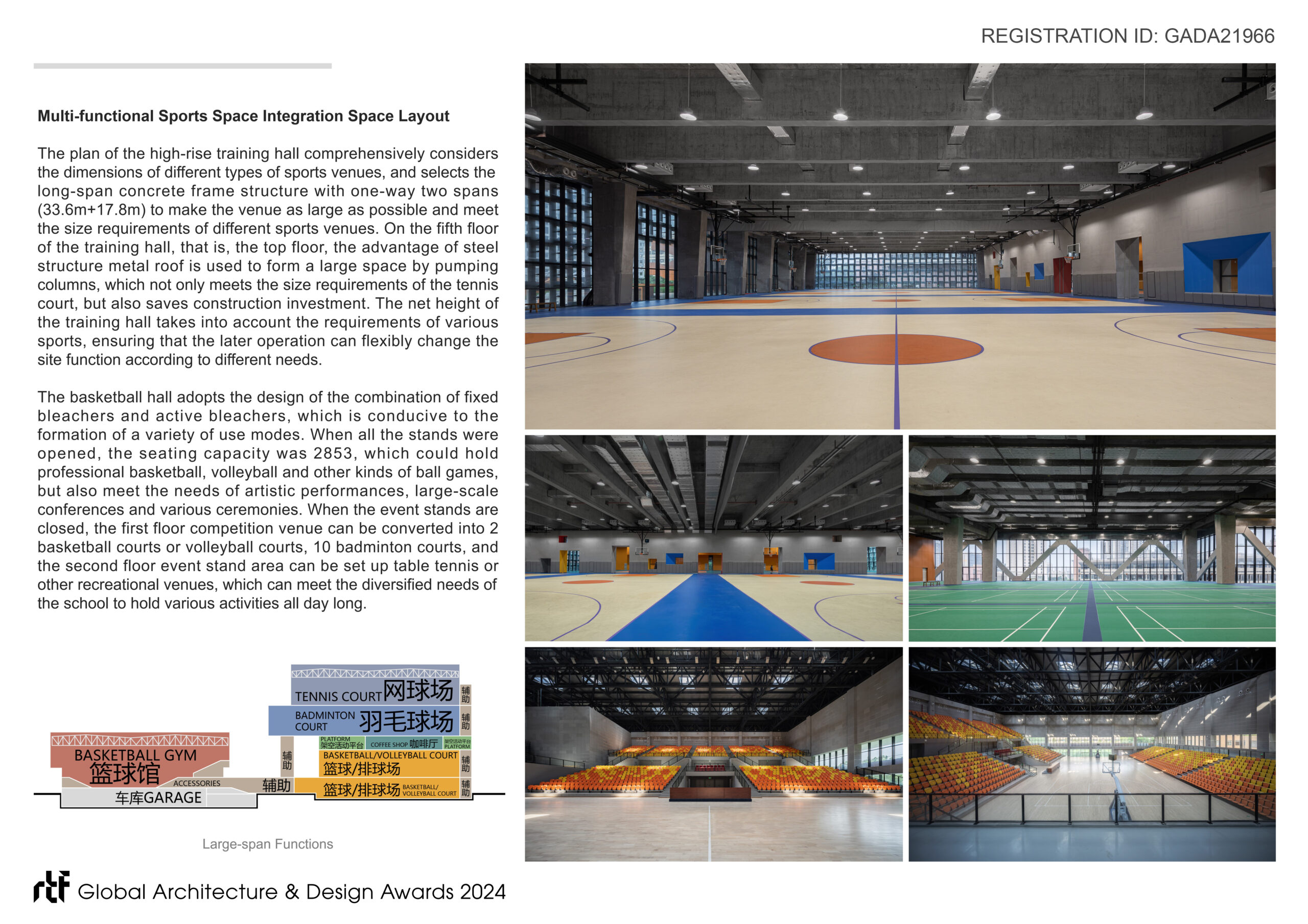 The plan of the high-rise training hall comprehensively considers the dimensions of different types of sports venues, and selects the long-span concrete frame structure with one-way two spans (33.6m+17.8m) to make the venue as large as possible and meet the size requirements of different sports venues. The basketball hall adopts the design of the combination of fixed bleachers and active bleachers, which is conducive to the formation of a variety of use modes.