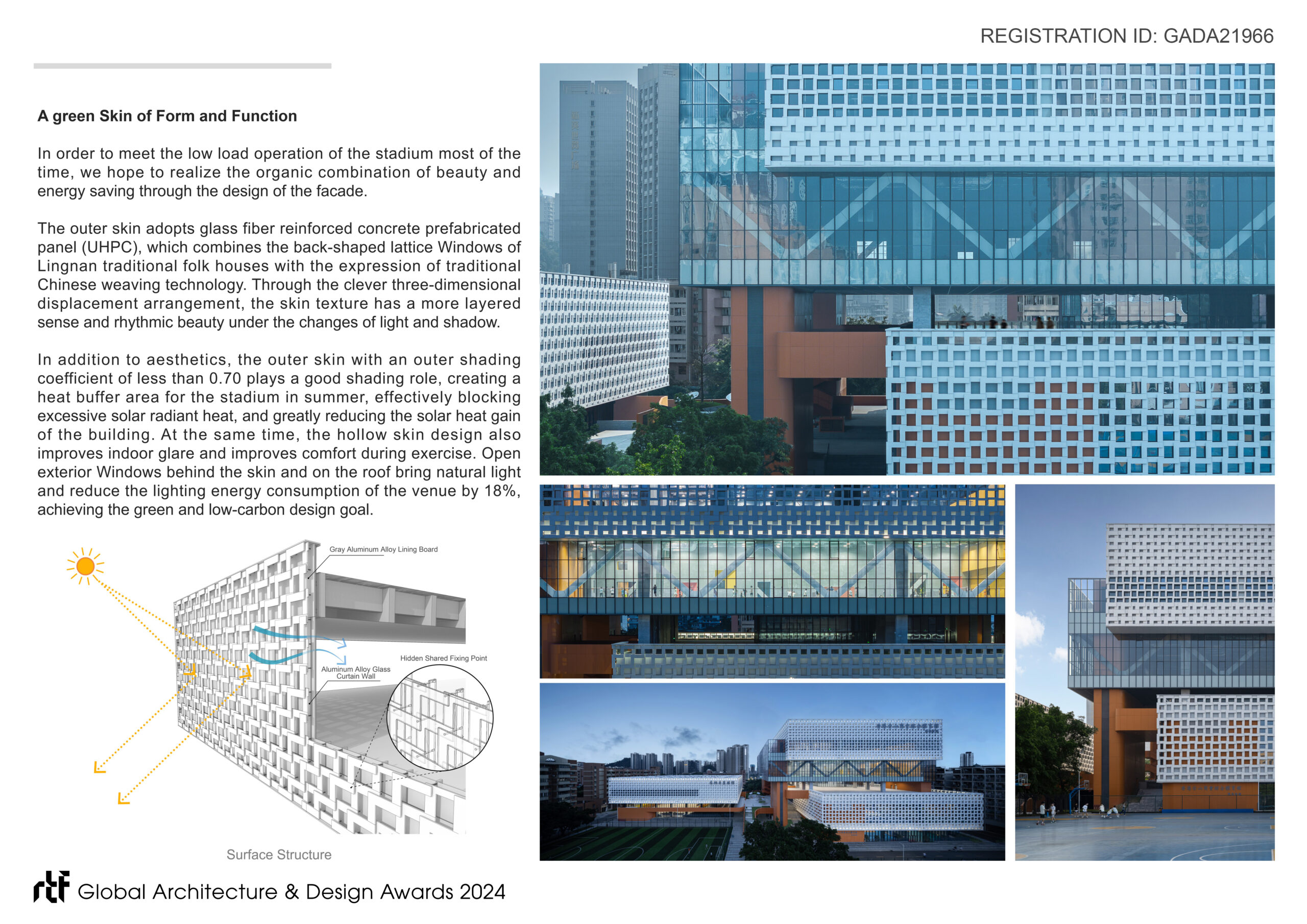 In order to meet the low load operation of the stadium most of the time, we hope to realize the organic combination of beauty and energy saving through the design of the facade. The outer skin adopts glass fiber reinforced concrete prefabricated panel (UHPC), which combines the back-shaped lattice Windows of Lingnan traditional folk houses with the expression of traditional Chinese weaving technology.