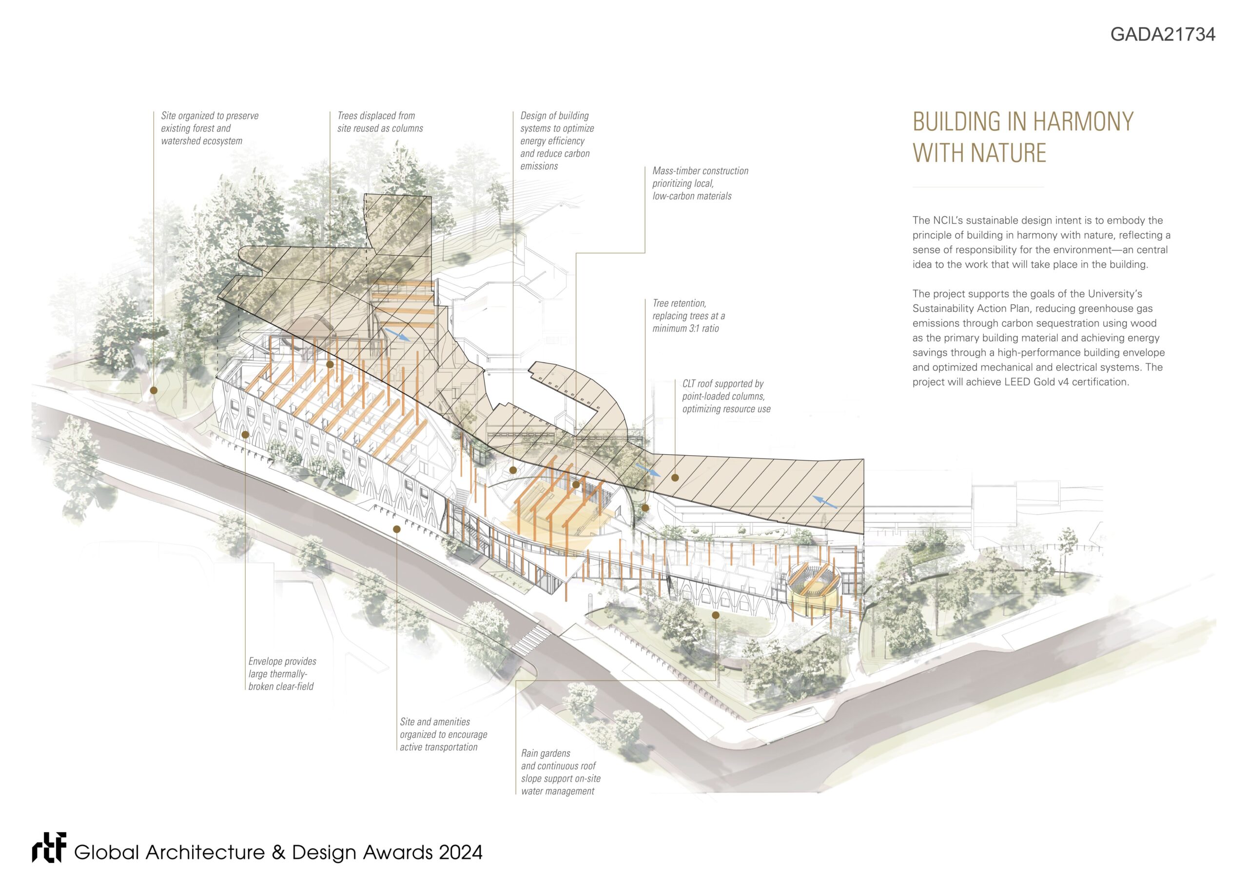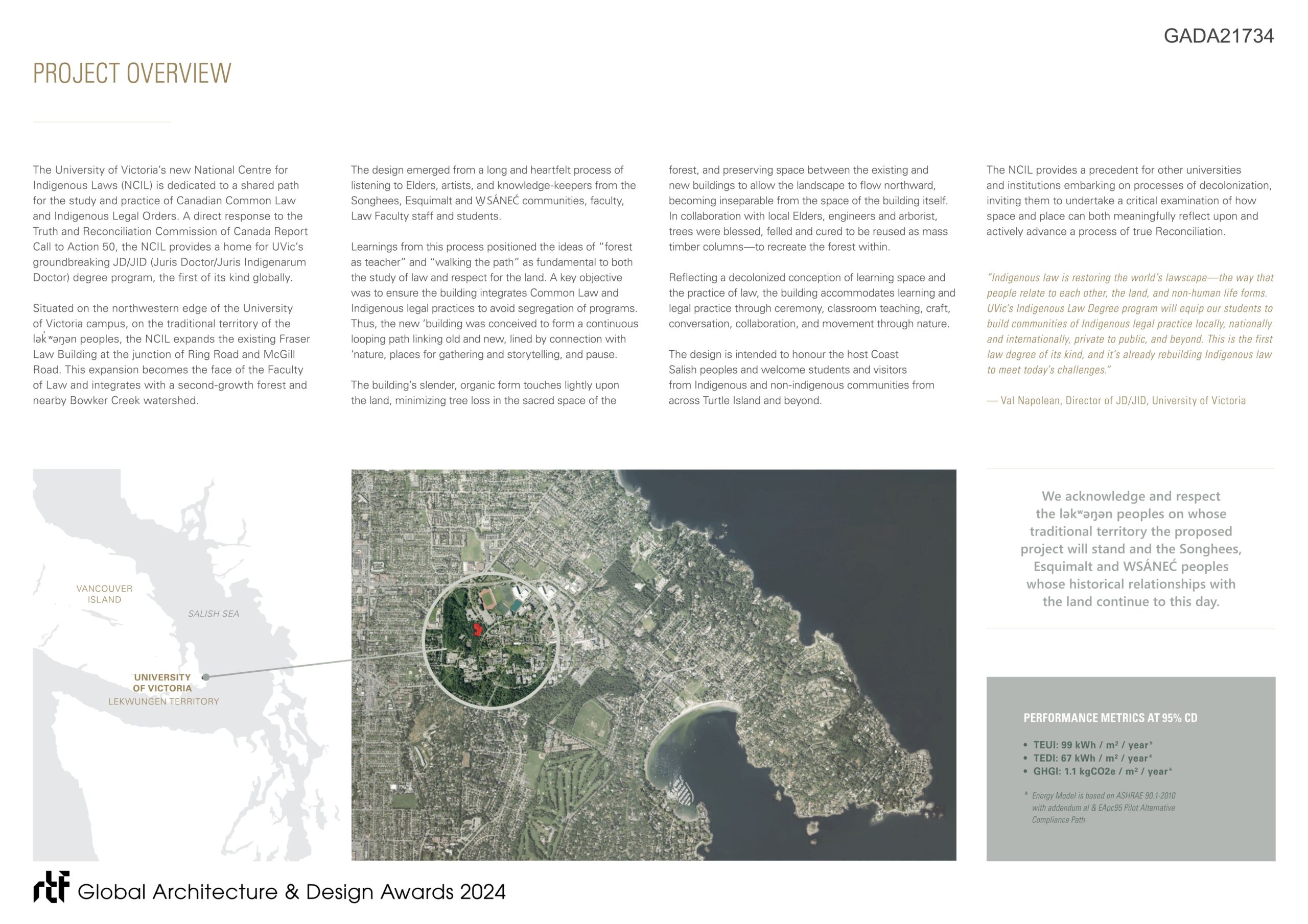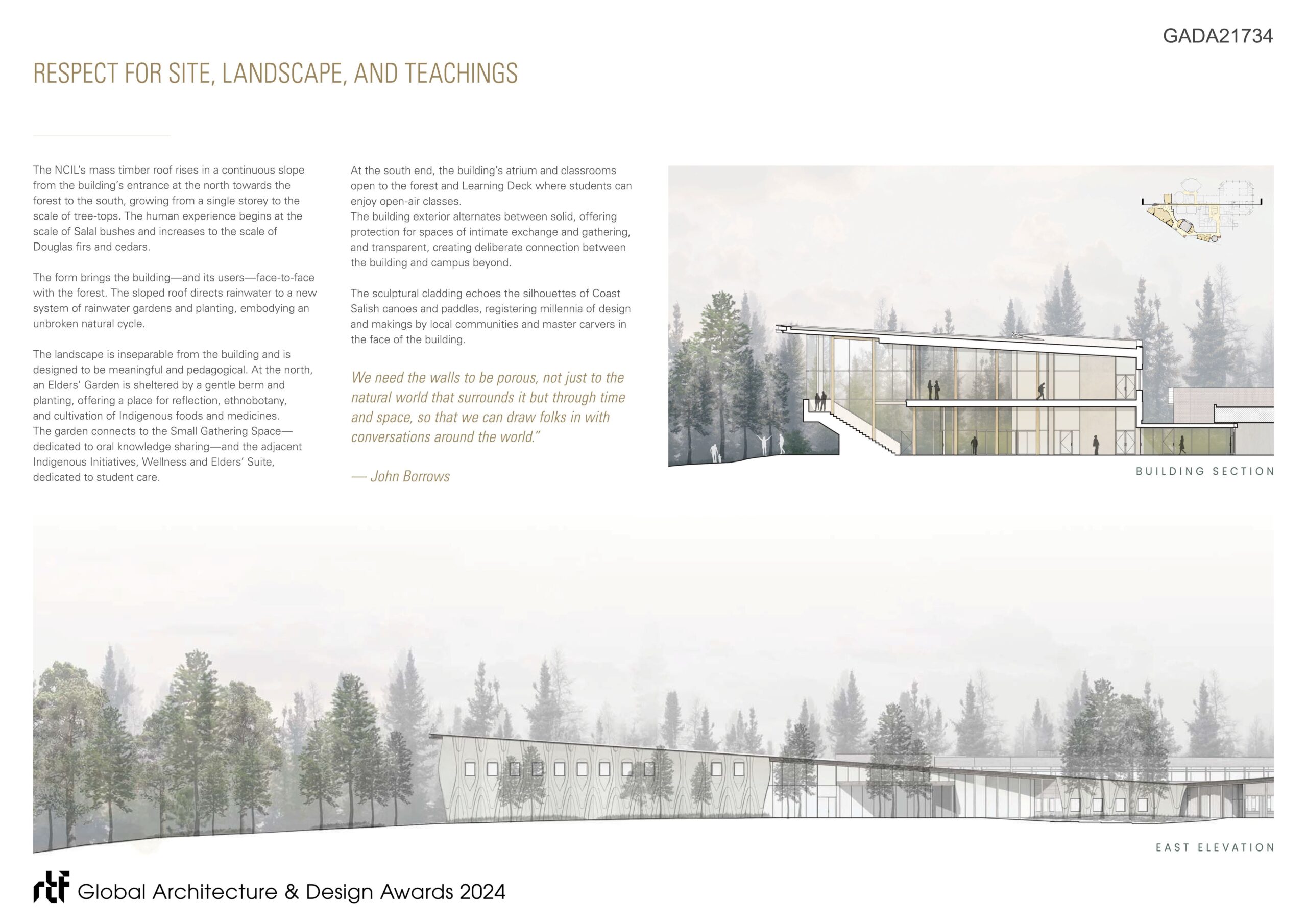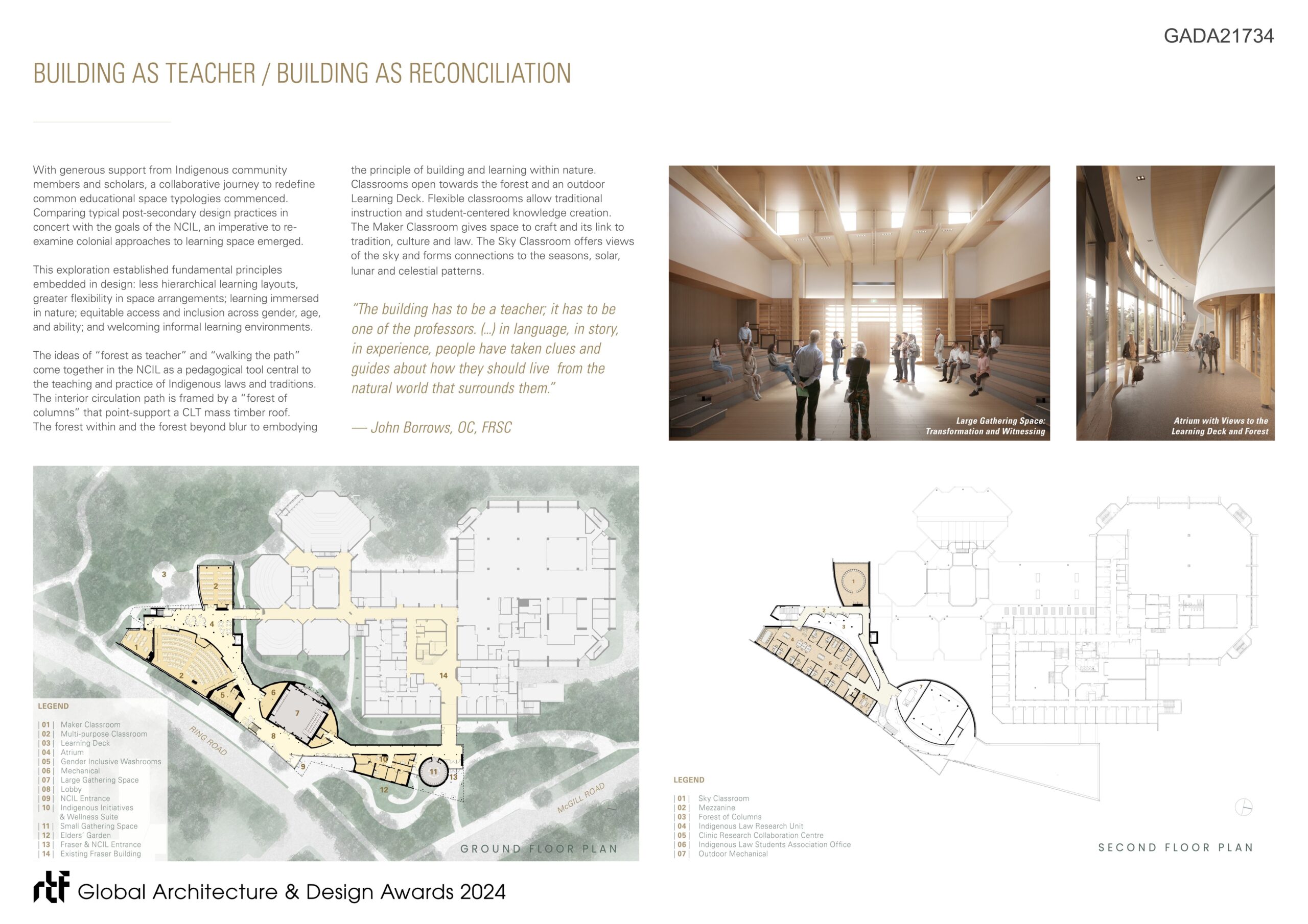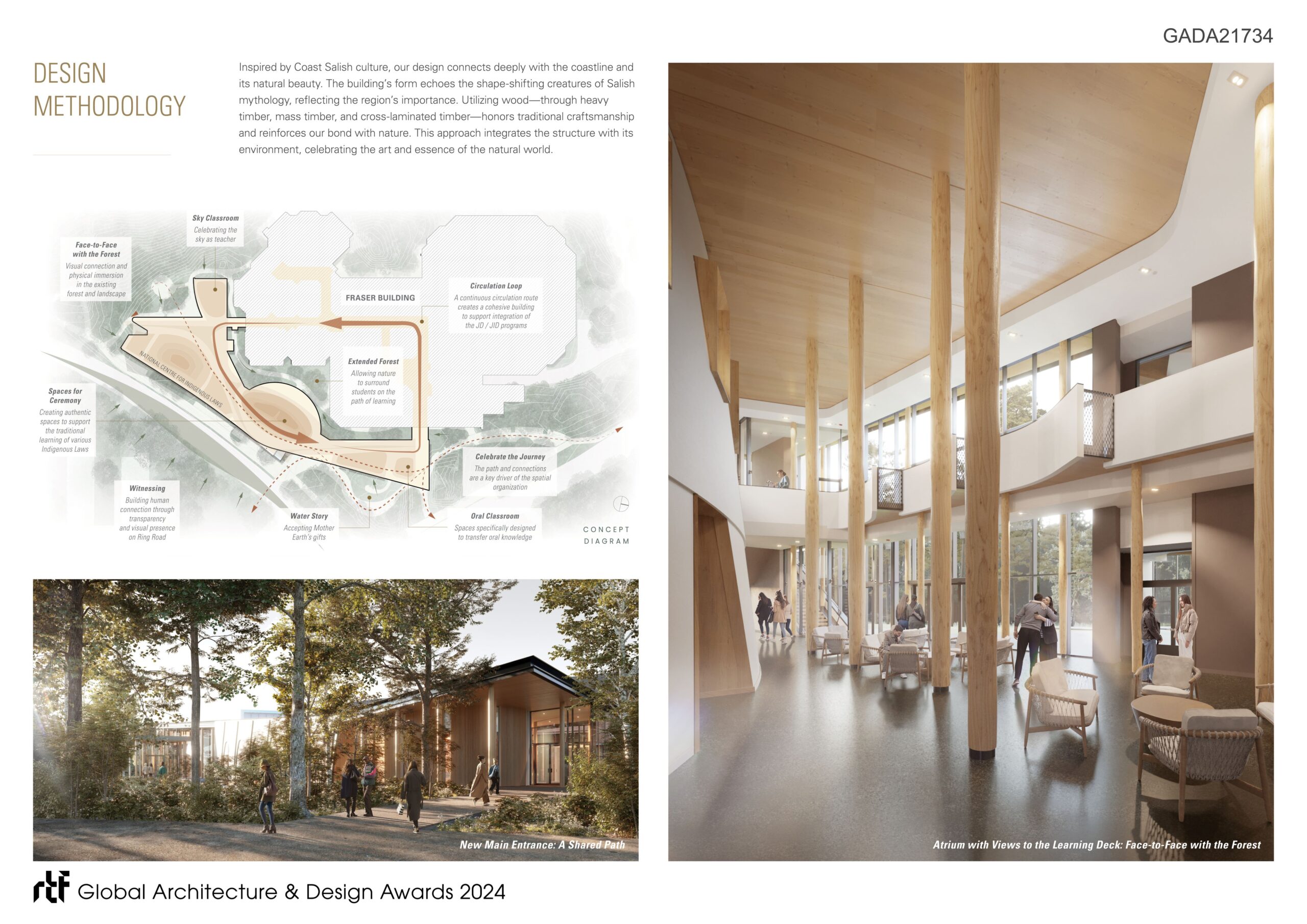 Reflecting a deliberately decolonized conception of learning space and the practice of law, the building accommodates learning and legal practice through ceremony, classroom teaching, craft, conversation, collaboration, and movement through nature. The design is intended to honour the host Coast Salish peoples, while creating a welcoming home for students and visitors from Indigenous and non-indigenous communities from across Turtle Island and beyond.