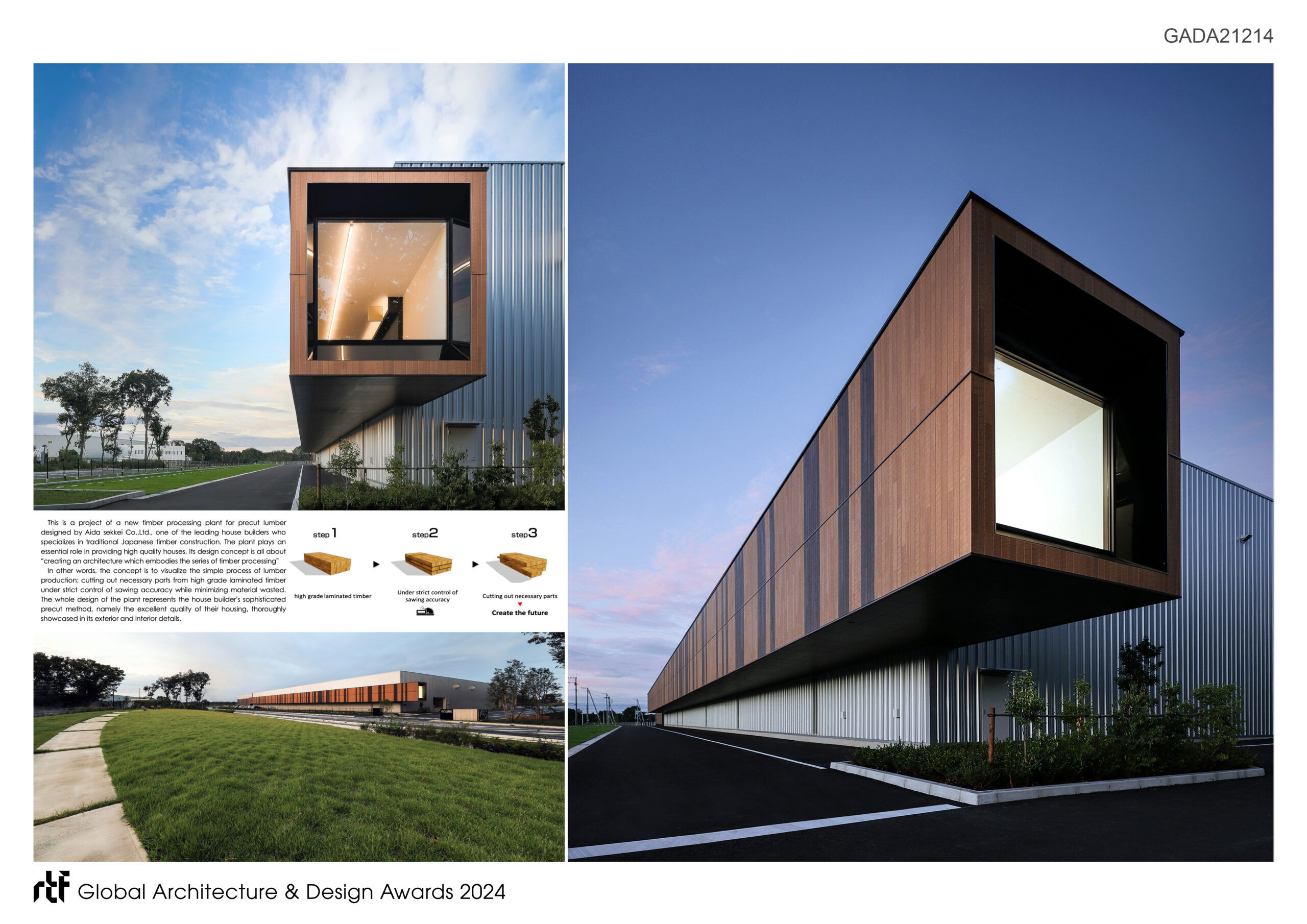 This is a project of a new timber processing plant for precut lumber designed by Aida sekkei Co.,Ltd., one of the leading house builders who specializes in traditional Japanese timber construction. Although Japan is blessed with forest resources, in contemporary construction wooden structures have not been used for buildings other than small houses.