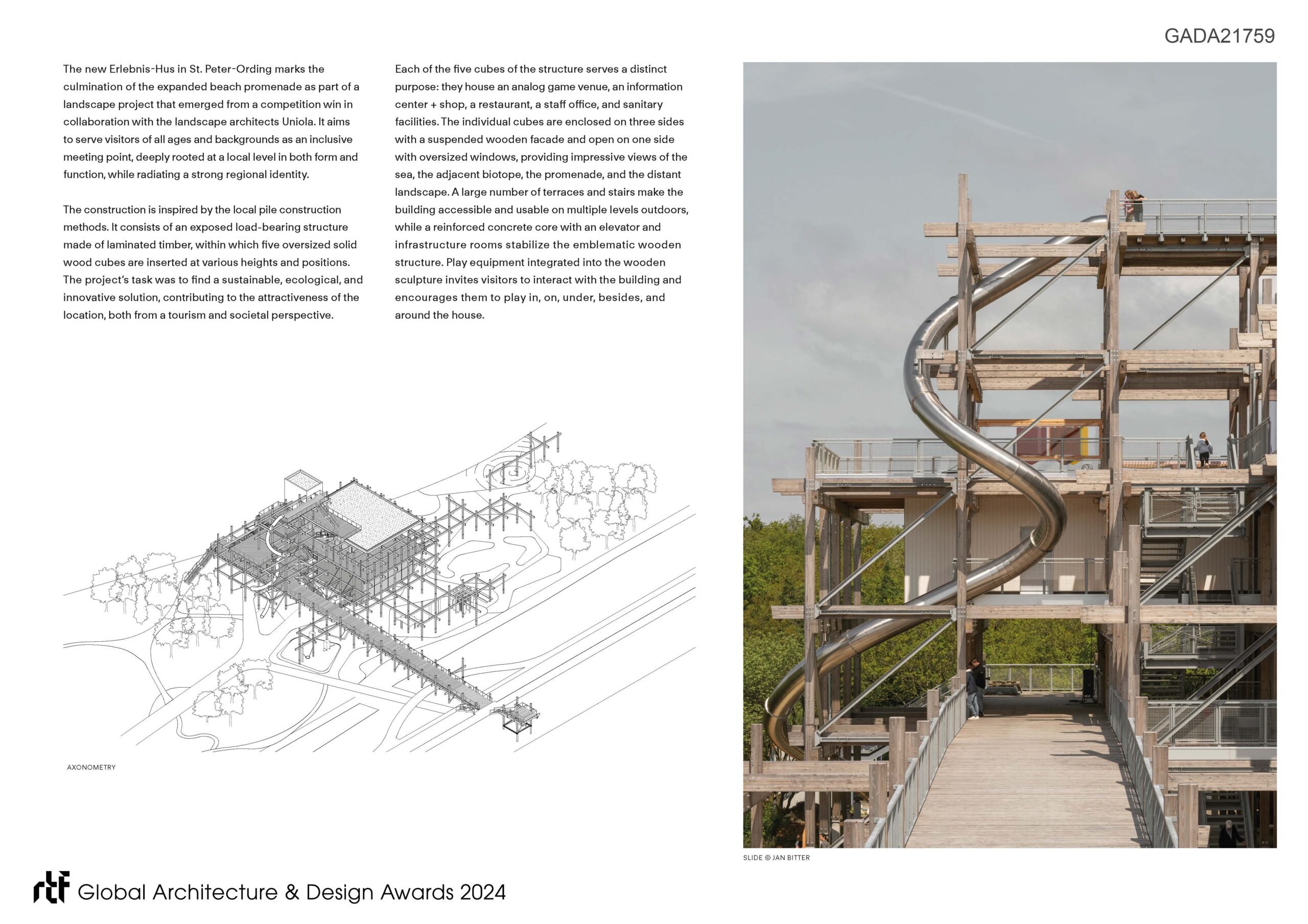A large number of terraces and stairs make the building accessible and usable on multiple levels outdoors, while a reinforced concrete core with an elevator and infrastructure rooms stabilize the emblematic wooden structure. Play equipment integrated into the wooden sculpture invites visitors to interact with the building and encourages them to play in, on, under, besides, and around the house.