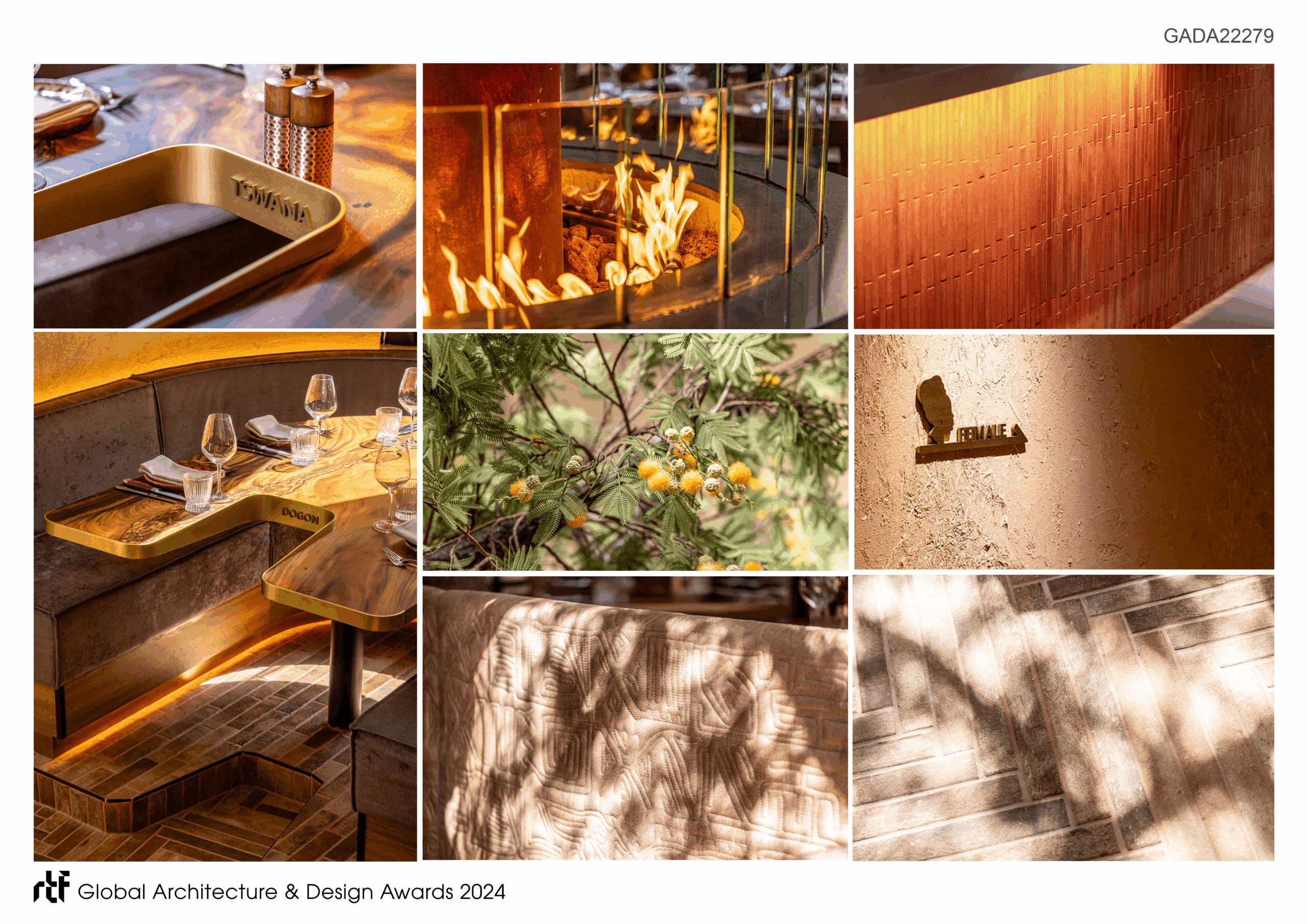The entire village is framed within a 17m high steel mesh curtain separating the “inside from the “outside” in a very gentle, almost invisible shroud. The restaurant’s unique design combines functionality with sensory engagement. Heated booth seating within the 4,5m high Bomas (pods) keeps diners comfortable, while a cut-out in the front of the dining table allows staff to step into the table to greet guests and serve them individually. This recess design element framed with a brass edge that stand proud of the table surface, also prevents utensils from falling and enhances social interaction. Decorated clay walls, reinterpreted as soft, upholstered surfaces, add a tactile surprise, while the scent of petrichor and sounds of African poetry in the walkway sweeping up to the entrance creates a multi-sensory greeting for visitors.