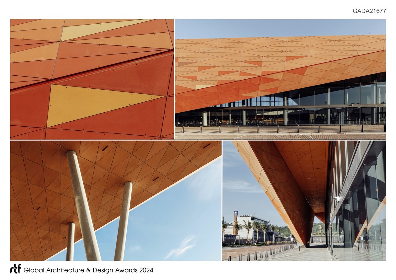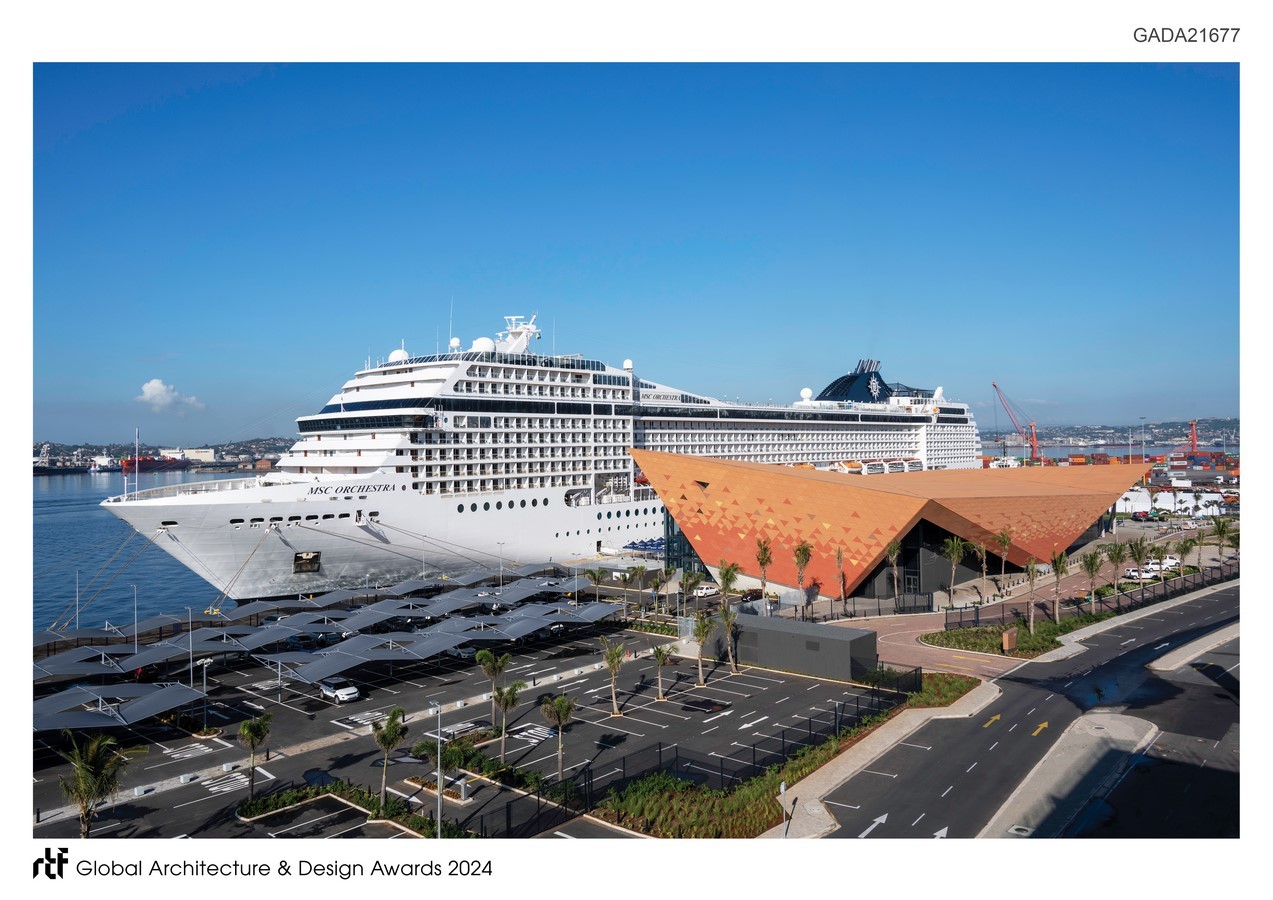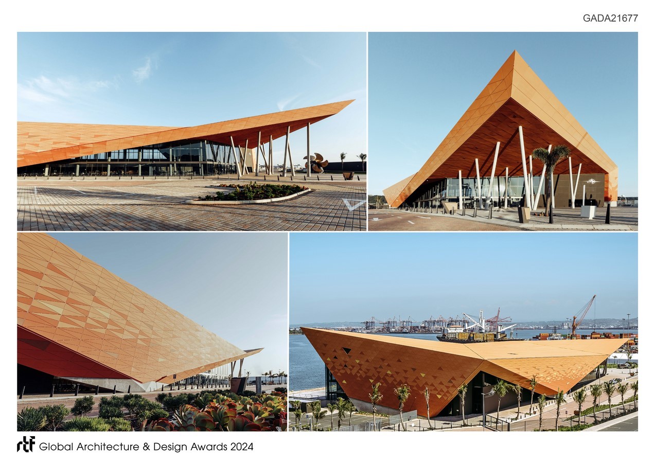 The terminal was conceived as the new portal to the Kingdom of the Zulus, welcoming tourists to the province and traditional culture. Dwarfed by docked cruise liners wharf side, the powerful form asserts itself as a memorable landmark object interfacing   harbour and city. Conceived with an overt African identity, the envelope draws inspiration from the earthy colours, vibrant textures and traditional triangular-motifs displayed in Zulu craft. The African colouration inspired by Zulu artwork, is unique, contextual and demands attention, boldly contrasting the conventional neutral ‘treatment’ characterising most transportation buildings globally. This over-sailing construct and its folded form of the facades and roof, characterise the terminal to generate a simple, yet intricate architectural expression. Where the external envelope angles away, large glazed expanses promote visual connection between interior and urban exterior.