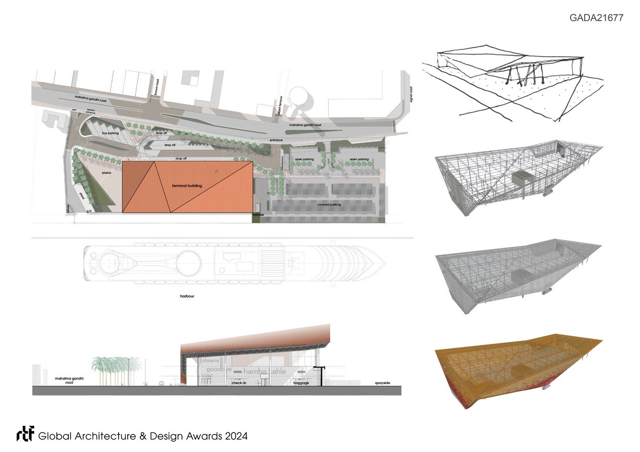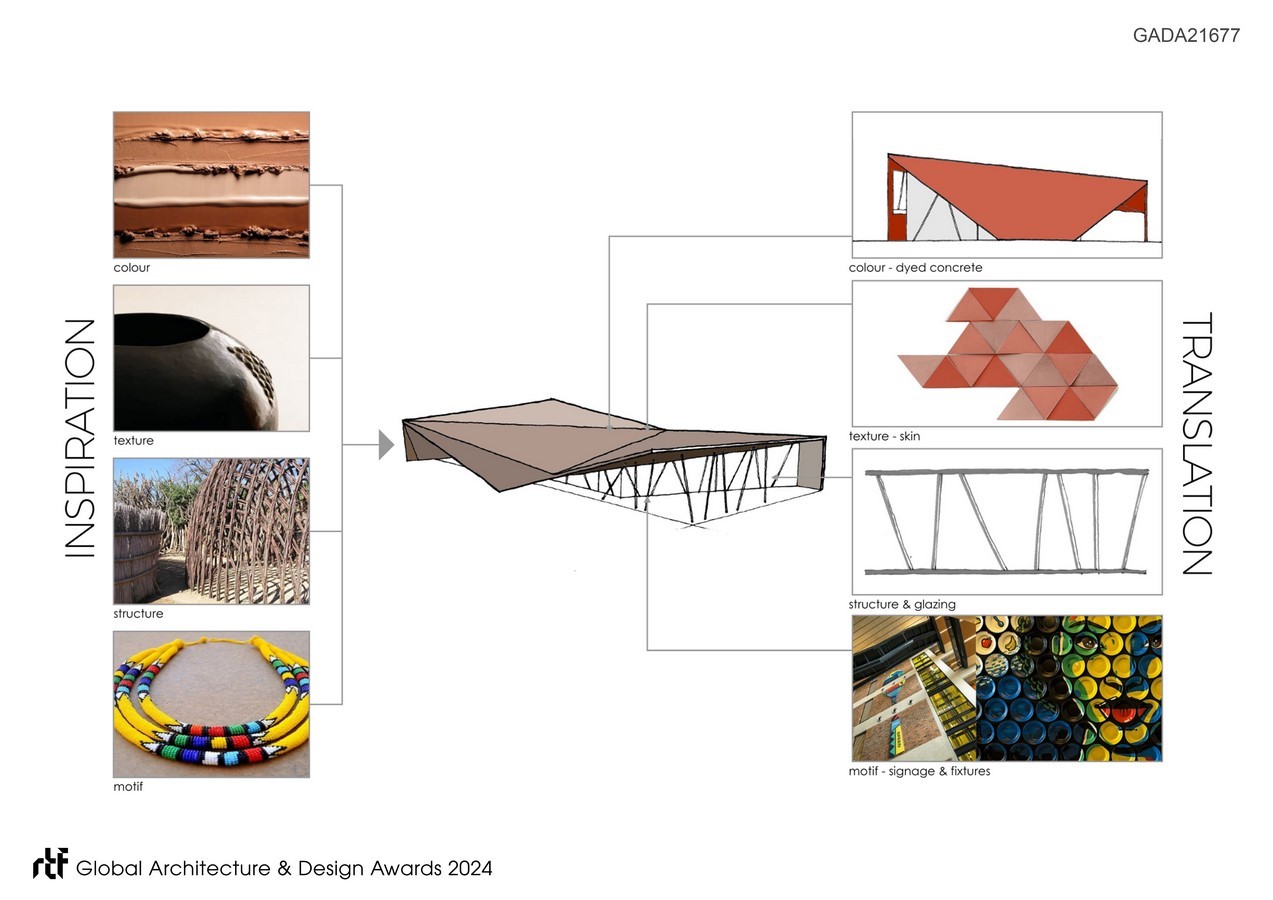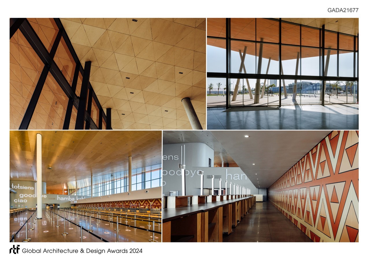 The terminal was conceived as the new portal to the Kingdom of the Zulus, welcoming tourists to the province and traditional culture. Dwarfed by docked cruise liners wharf side, the powerful form asserts itself as a memorable landmark object interfacing   harbour and city. Conceived with an overt African identity, the envelope draws inspiration from the earthy colours, vibrant textures and traditional triangular-motifs displayed in Zulu craft. The African colouration inspired by Zulu artwork, is unique, contextual and demands attention, boldly contrasting the conventional neutral ‘treatment’ characterising most transportation buildings globally. This over-sailing construct and its folded form of the facades and roof, characterise the terminal to generate a simple, yet intricate architectural expression. Where the external envelope angles away, large glazed expanses promote visual connection between interior and urban exterior.