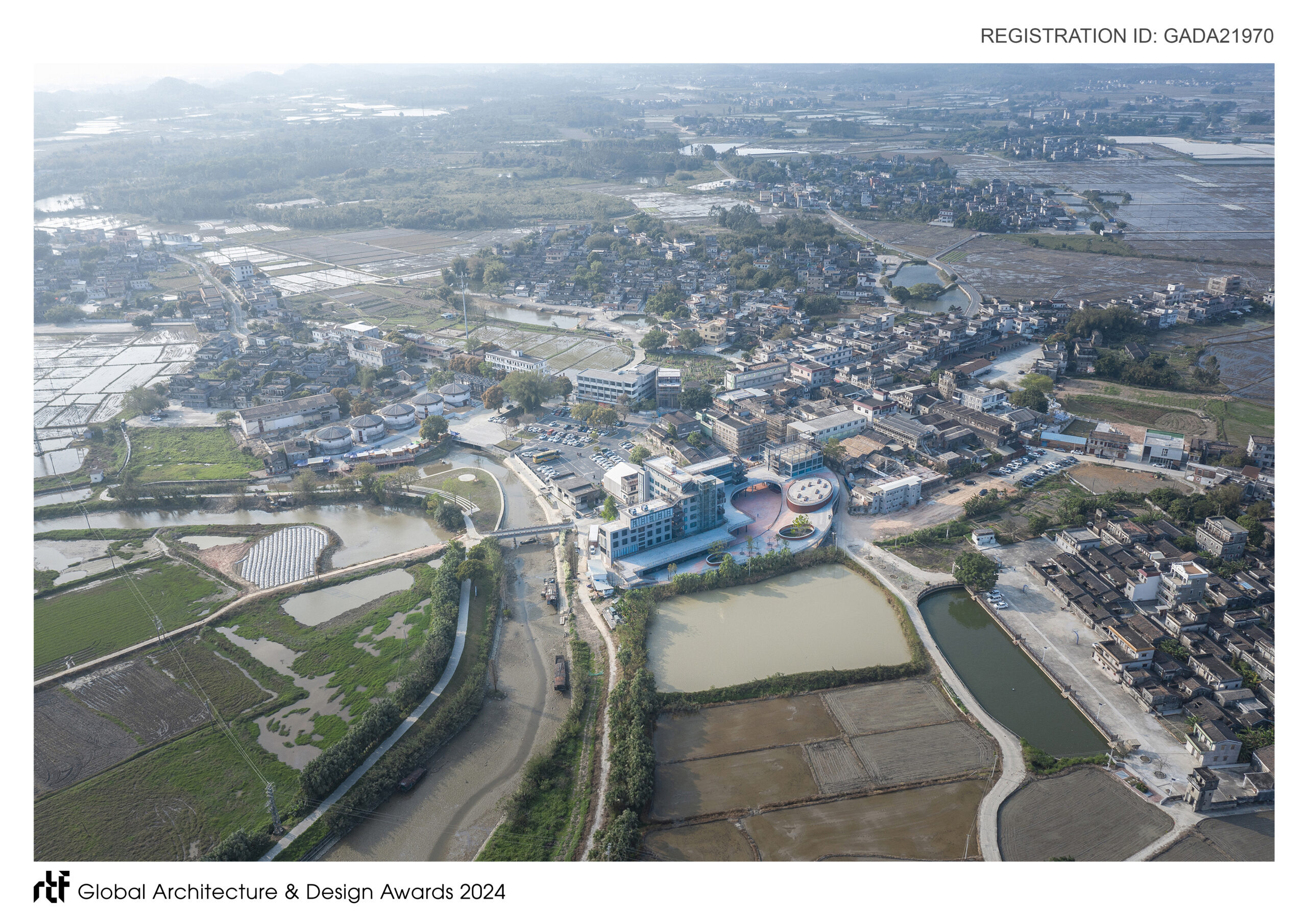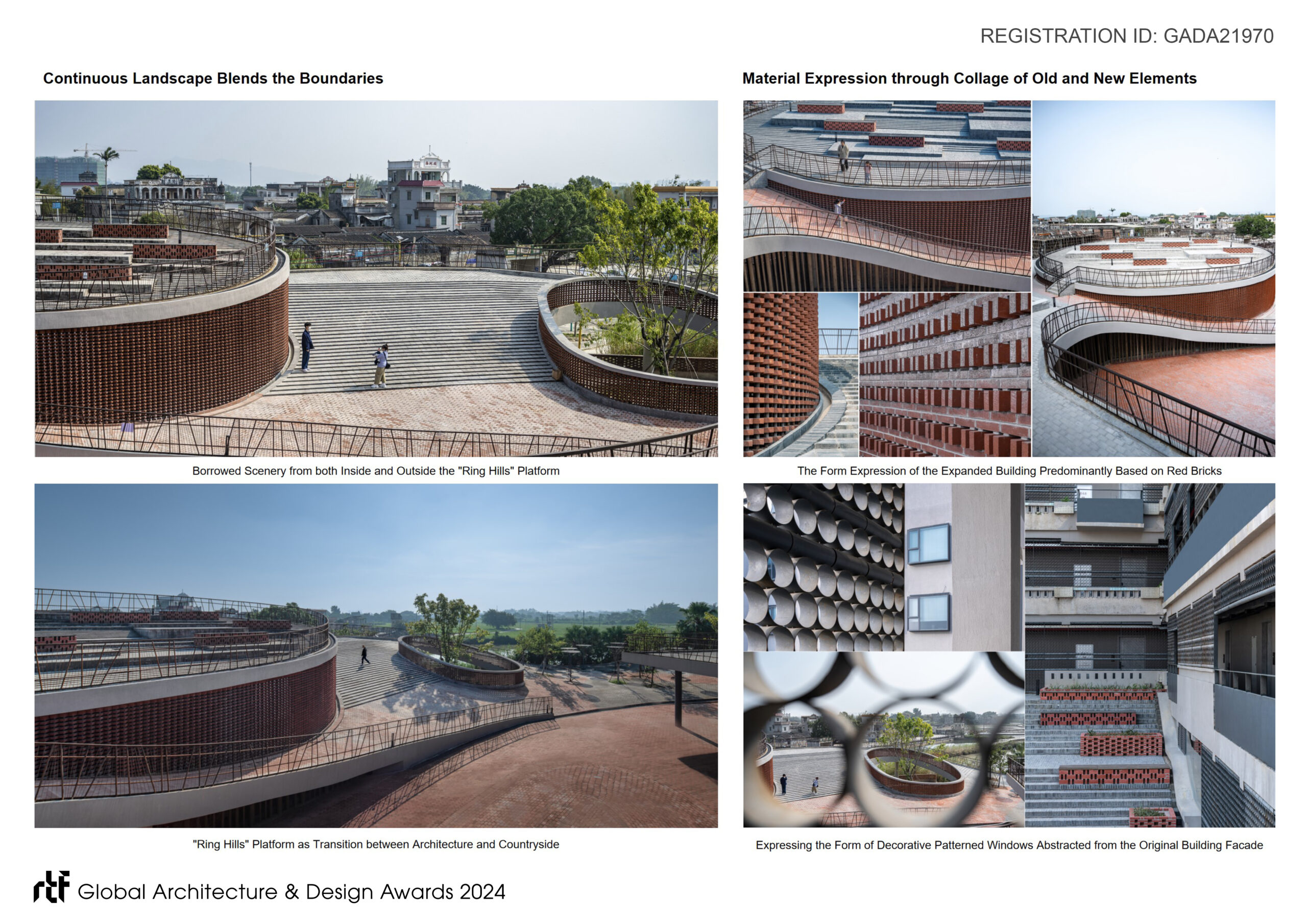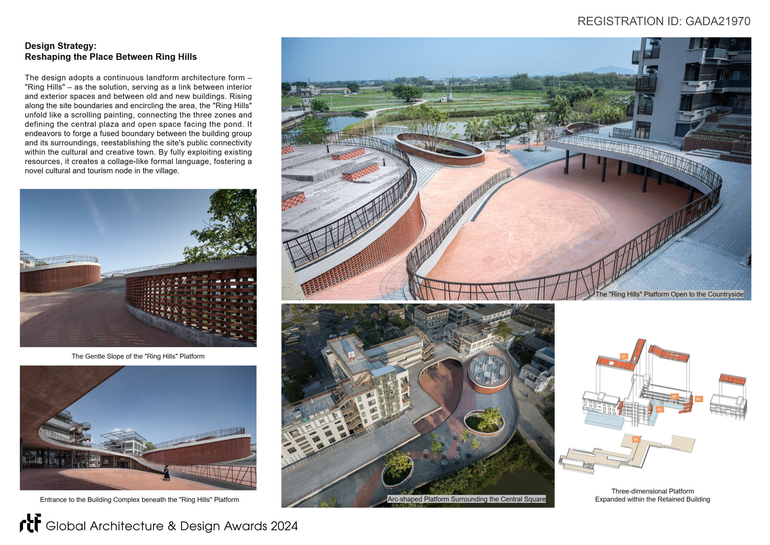 The design adopts a continuous landform architecture form – “Ring Hills” – as the solution, serving as a link between interior and exterior spaces and between old and new buildings. Rising along the site boundaries and encircling the area, the “Ring Hills” unfold like a scrolling painting, connecting the three zones and defining the central plaza and open space facing the pond. It endeavors to forge a fused boundary between the building group and its surroundings, reestablishing the site’s public connectivity within the cultural and creative town. By fully exploiting existing resources, it creates a collage-like formal language, fostering a novel cultural and tourism node in the village