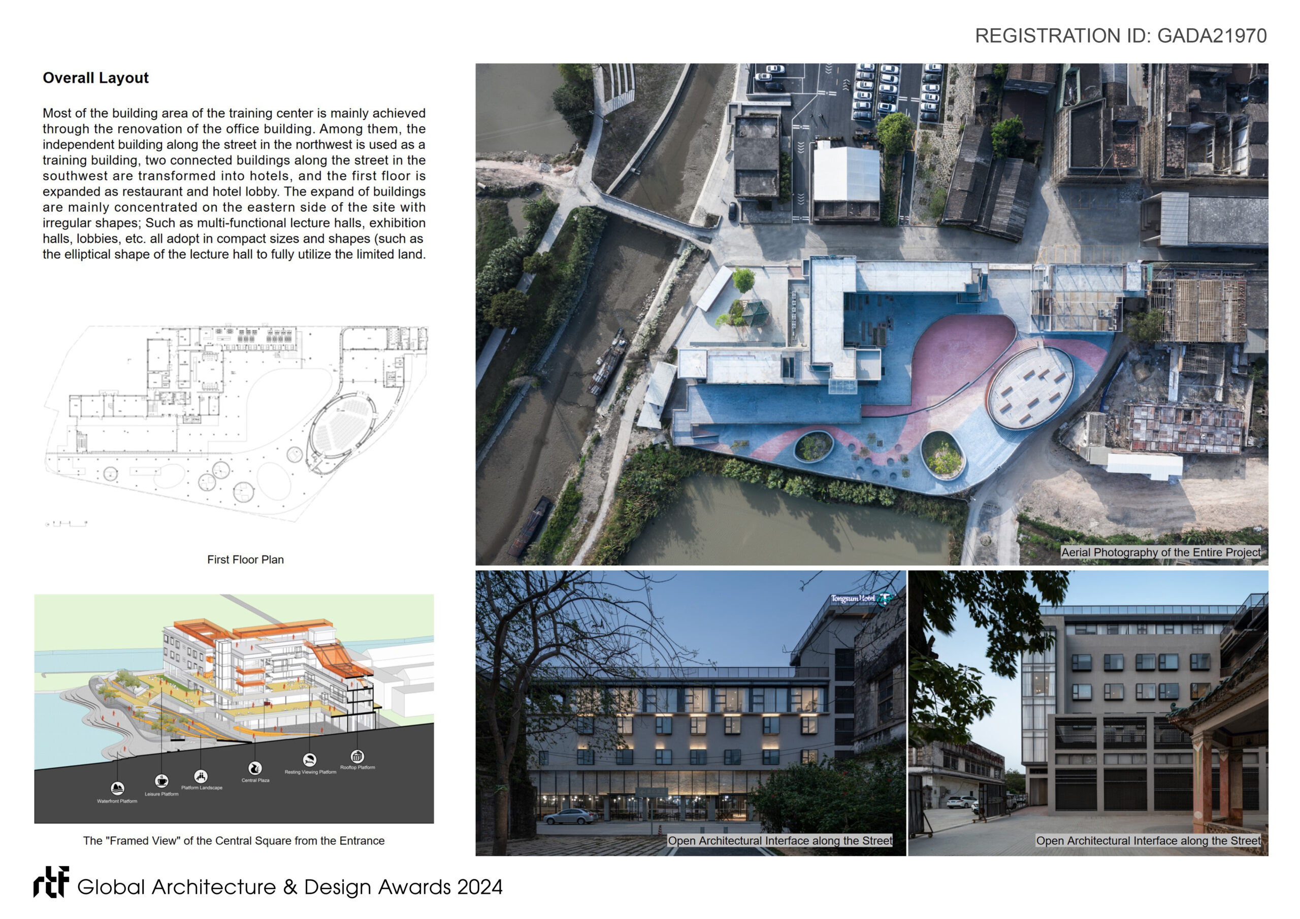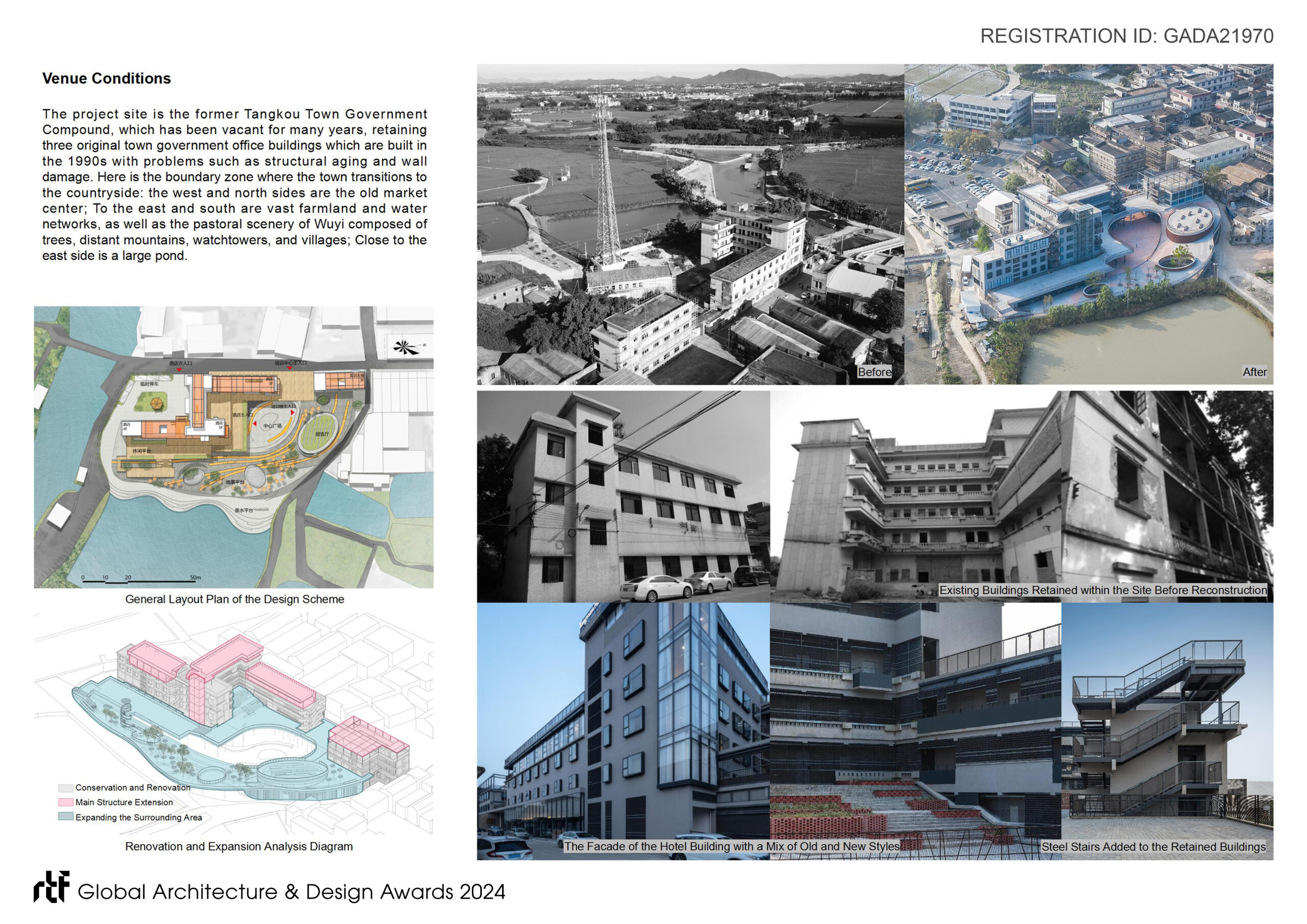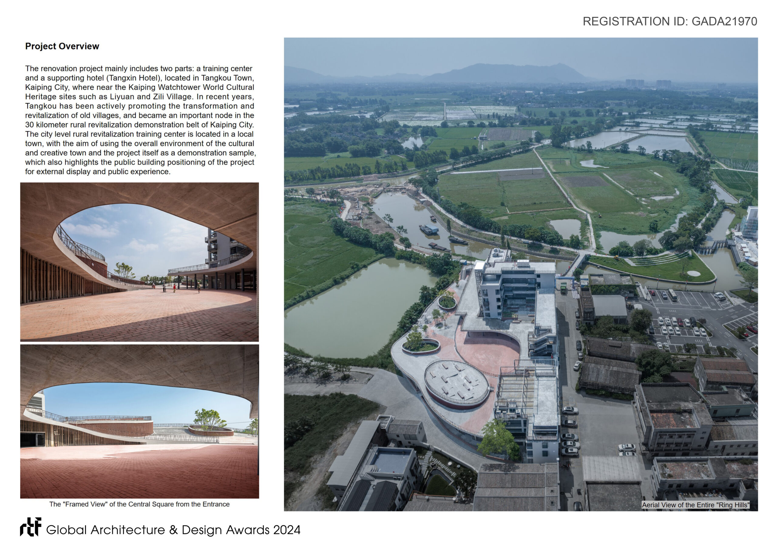 The renovation project mainly includes two parts: a training center and a supporting hotel (Tangxin Hotel), located in Tangkou Town, Kaiping City, where near the Kaiping Watchtower World Cultural Heritage sites such as Liyuan and Zili Village.