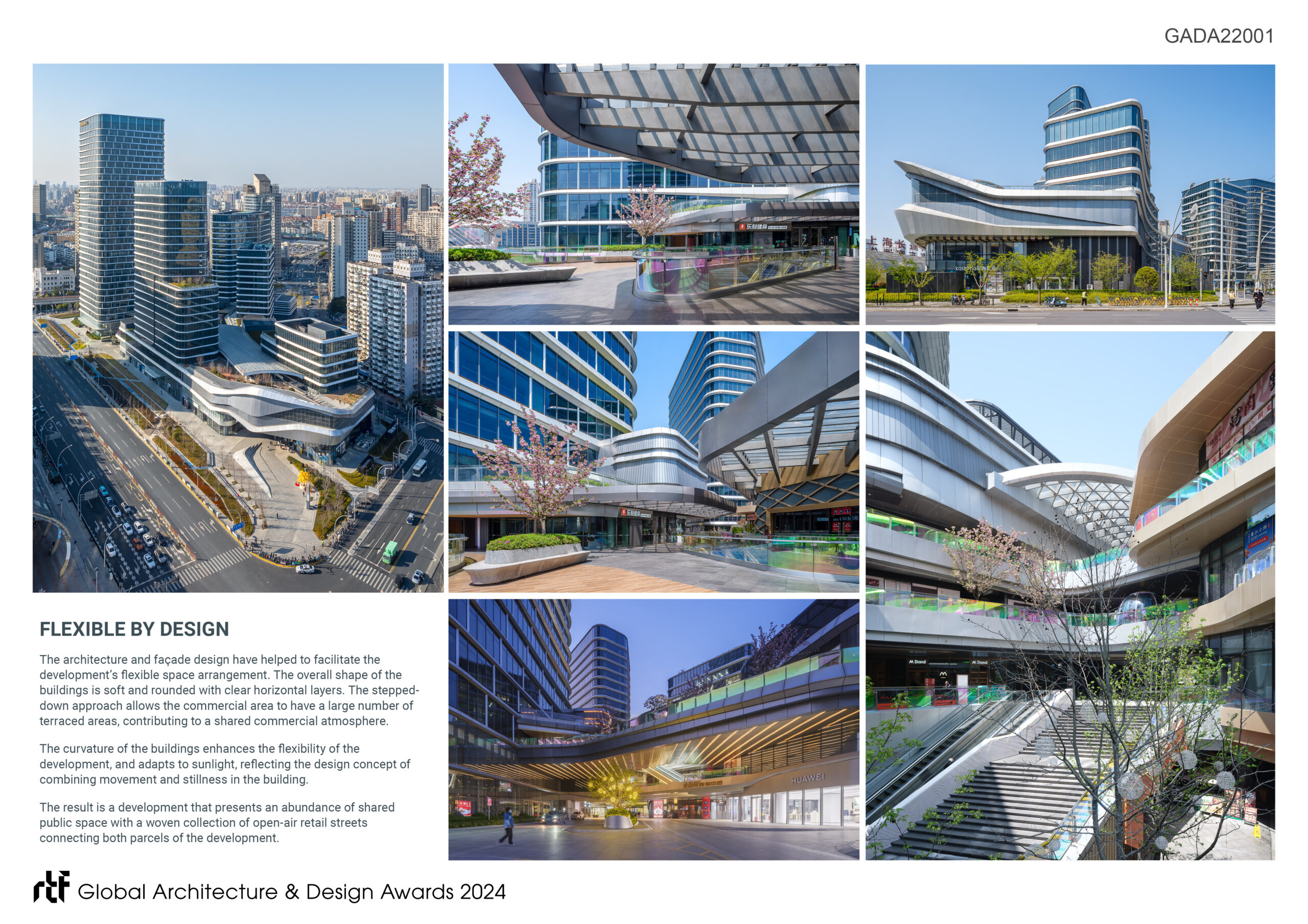 The architecture and façade design have helped to facilitate the development’s flexible space arrangement. The overall shape of the buildings is soft and rounded with clear horizontal layers. The stepped-down approach allows the commercial area to have a large number of terraced areas, contributing to a shared commercial atmosphere.