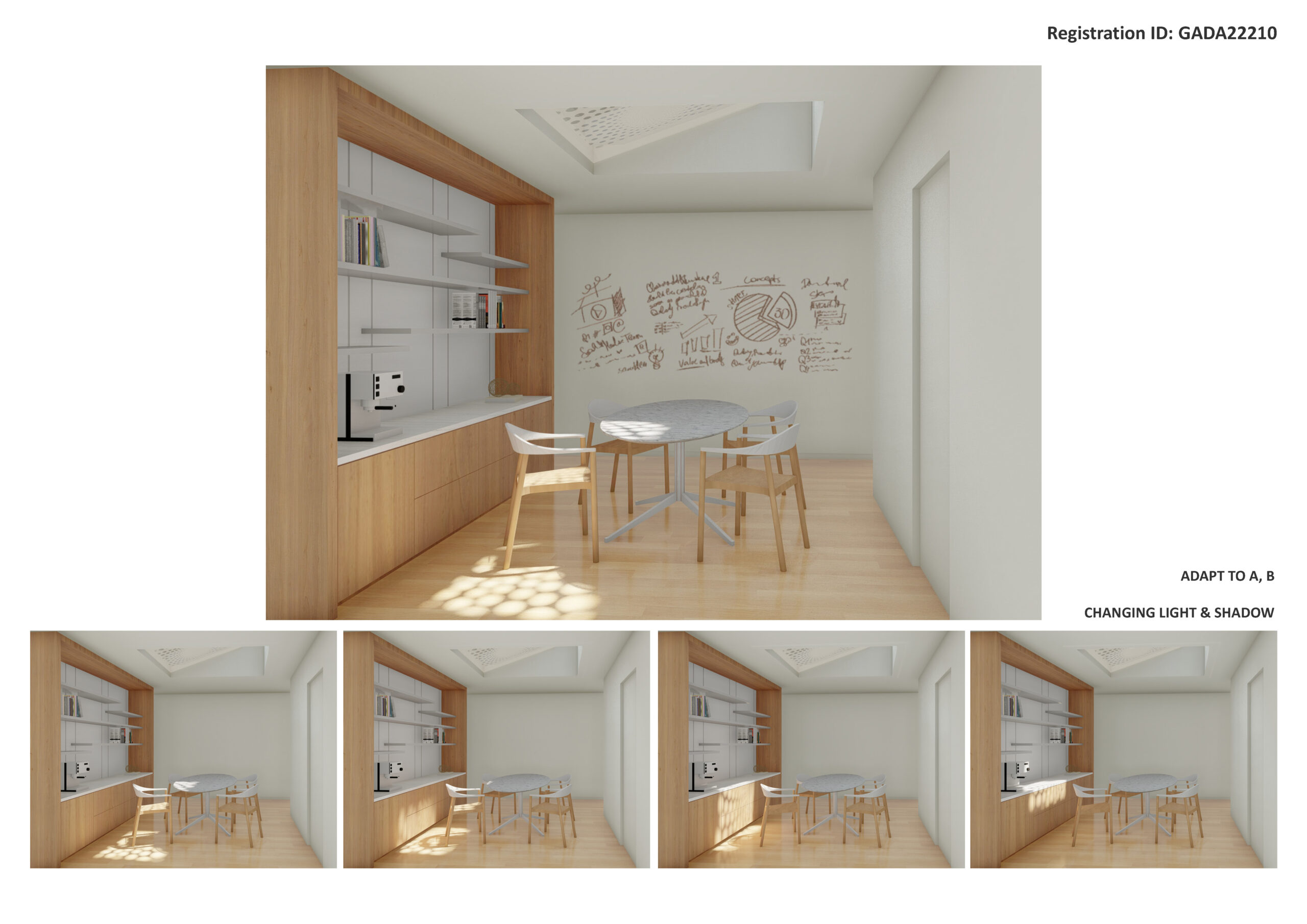 - At the Coffee Area at the heart of the home, a custom screen at the skylight modulates the bright sunlight and provides changing light and shadows throughout the day, reinforcing connection to the cycle of the day, which help regulate our sleep-wake cycle, our Circadian rhythm, and influences our mood and energy levels.