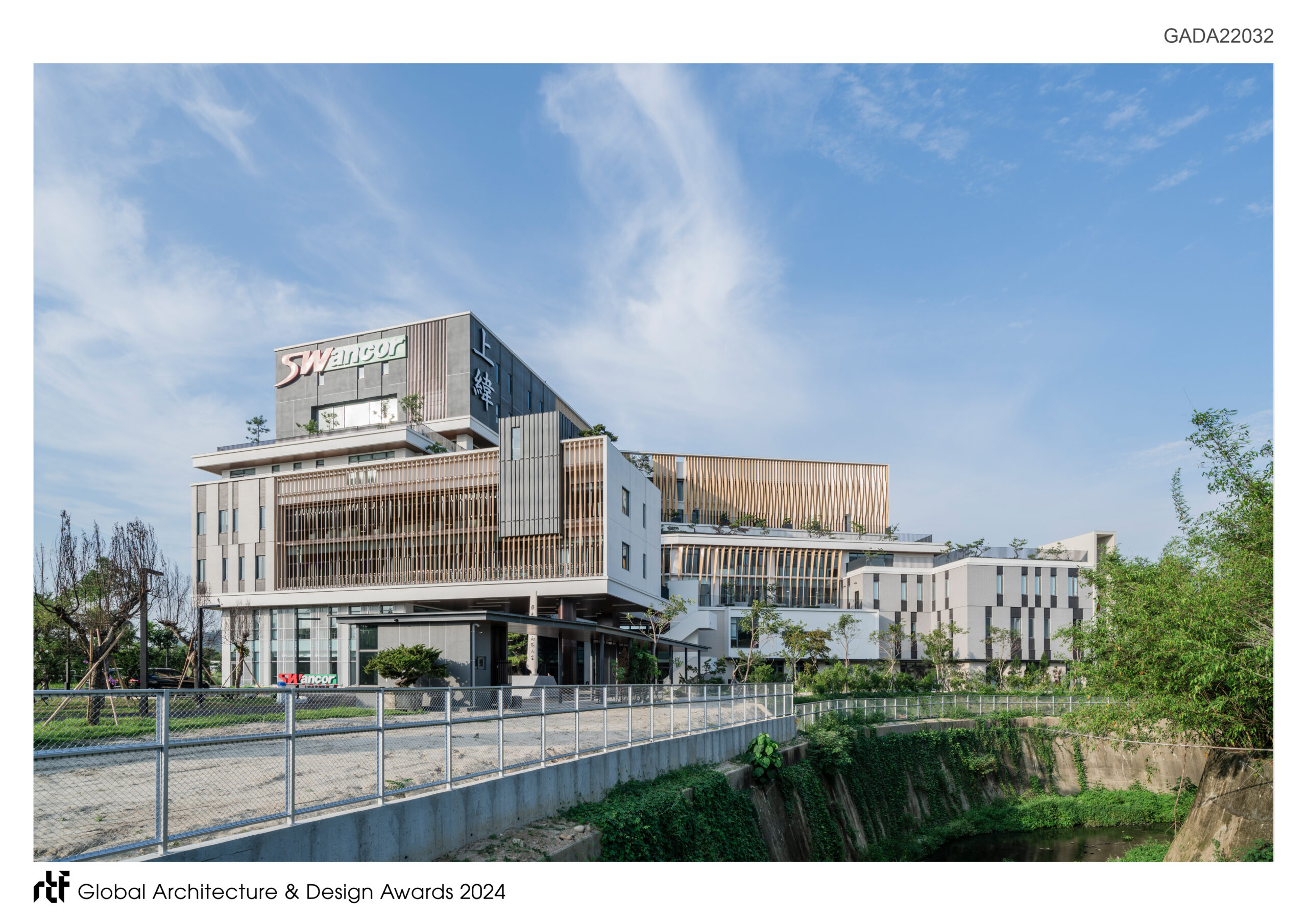 This project serves as the operational headquarters and advanced R&D center for Swancor Group. The site is surrounded by residential communities and is adjacent to a winding river channel, with open views on both the east and west sides, offering distant vistas of the mountains.