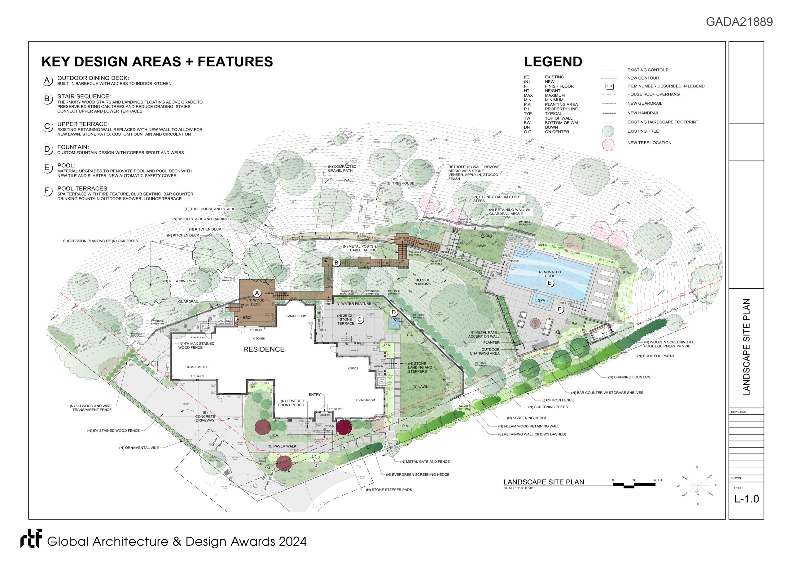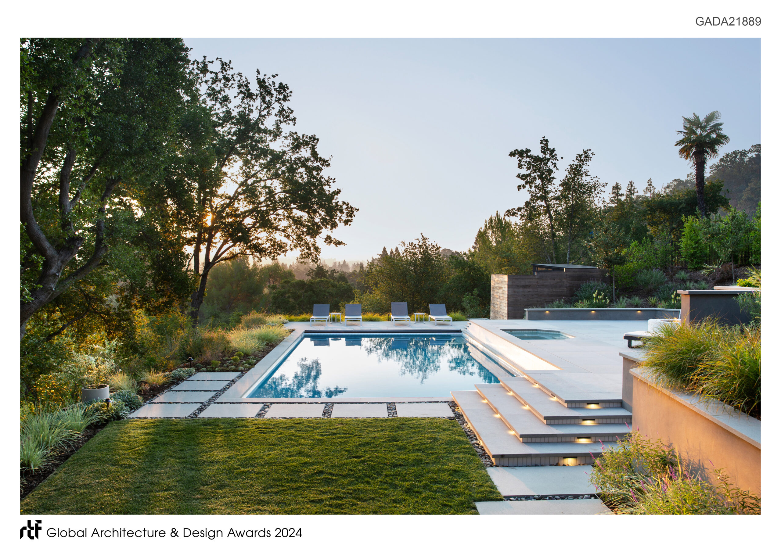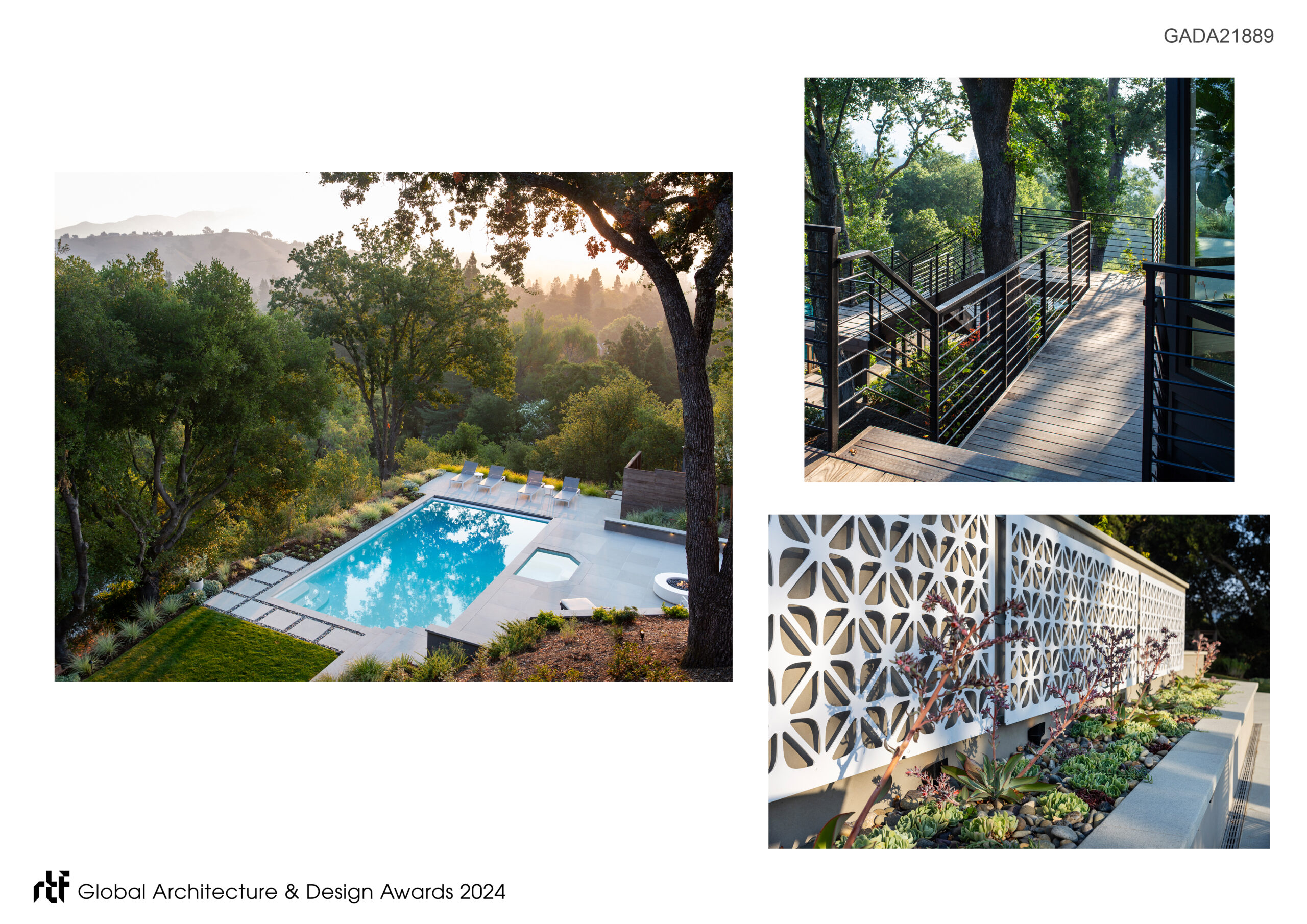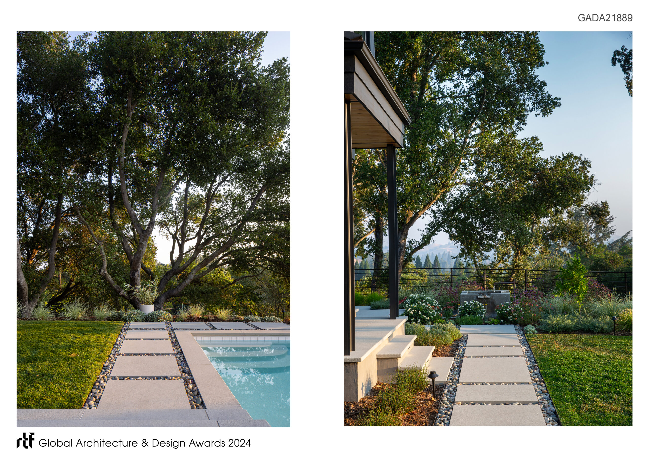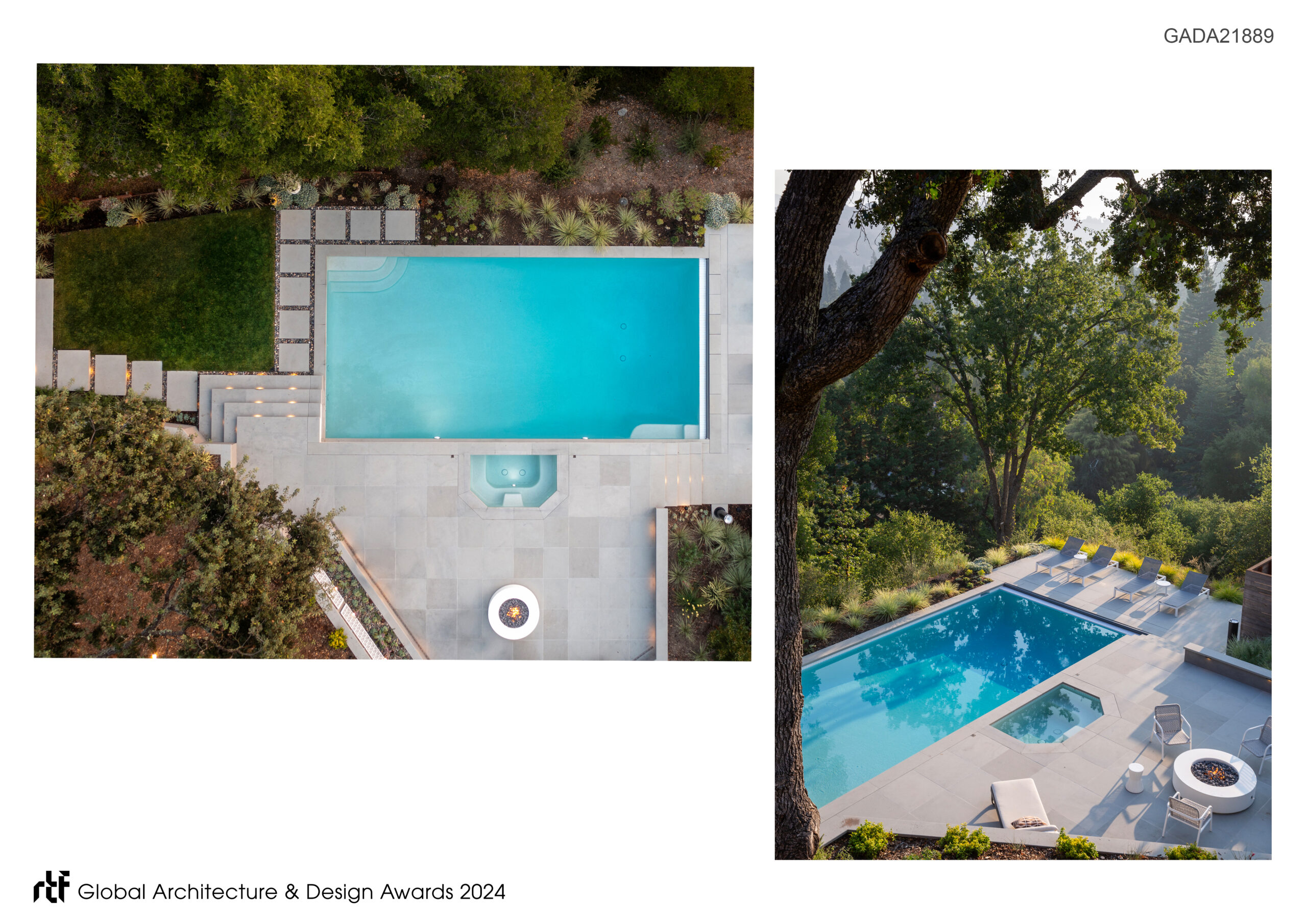 Contending with the steep slopes and more than 29’ of grade change in the rear yard posed the biggest design challenge in terms of connecting the house and recreation areas below. The solution being a stair sequence that floats above the natural grade, preserving the existing oaks with expanded landings that encourage moments of pause amid the tree canopy while enjoying the views of the pool below. The materials selection of the stairs (Thermory wood and custom railings) references the tree trunks and branches that one is immersed in as you descend to the pool deck below.