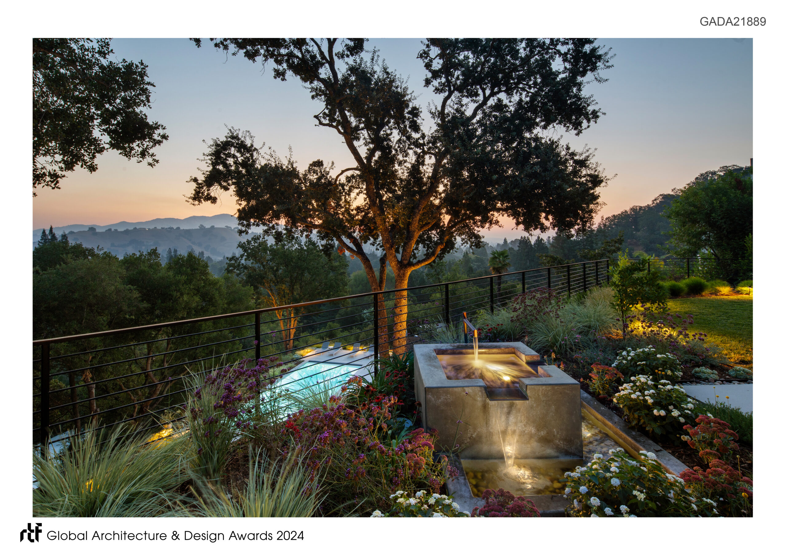 An existing retaining wall was reconfigured to create more space for an upper terrace that acts as the entry to the yard and includes a patio and lawn area bordered by custom iron guardrails (rounded, horizontal rods that capture and refract light differently than traditional square pickets). A walkway welcomes you into the space, wending its way past a custom fountain and around the house, featuring stunning views of Mt. Diablo in the distance.