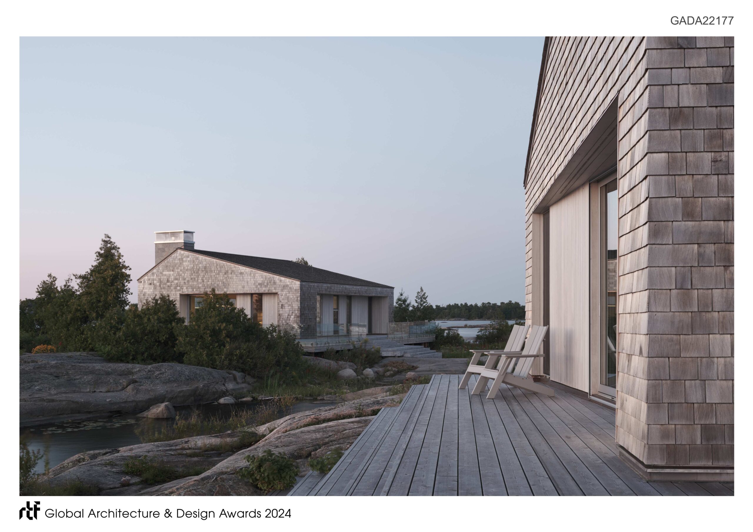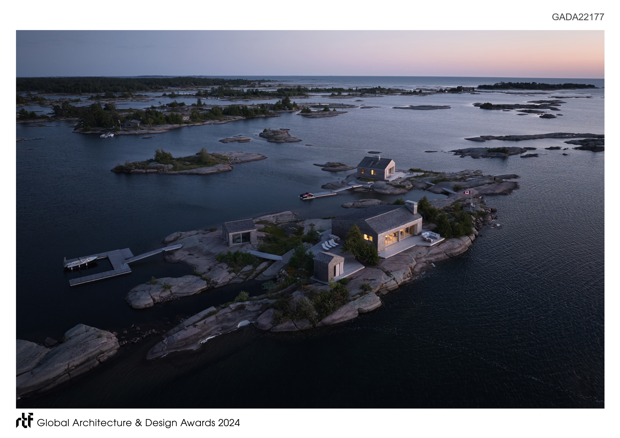 Located in Pointe Au Baril, off the shores of Lake Huron, Whistling Wind comprises four modestly sized sustainable structures, each defined by distinctly asymmetrical rooflines. A cottage, bunkie, sauna, and boat storage with fitness room are anchored to the island’s ancient Precambrian bedrock. Meanwhile, wooden gangways float above water inlets to connect the various outcroppings, while large decks respond to the uneven terrain with angular geometries.