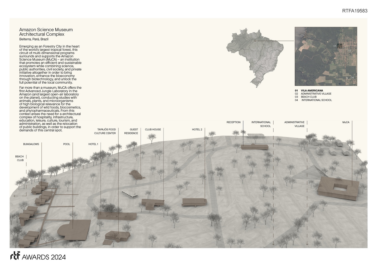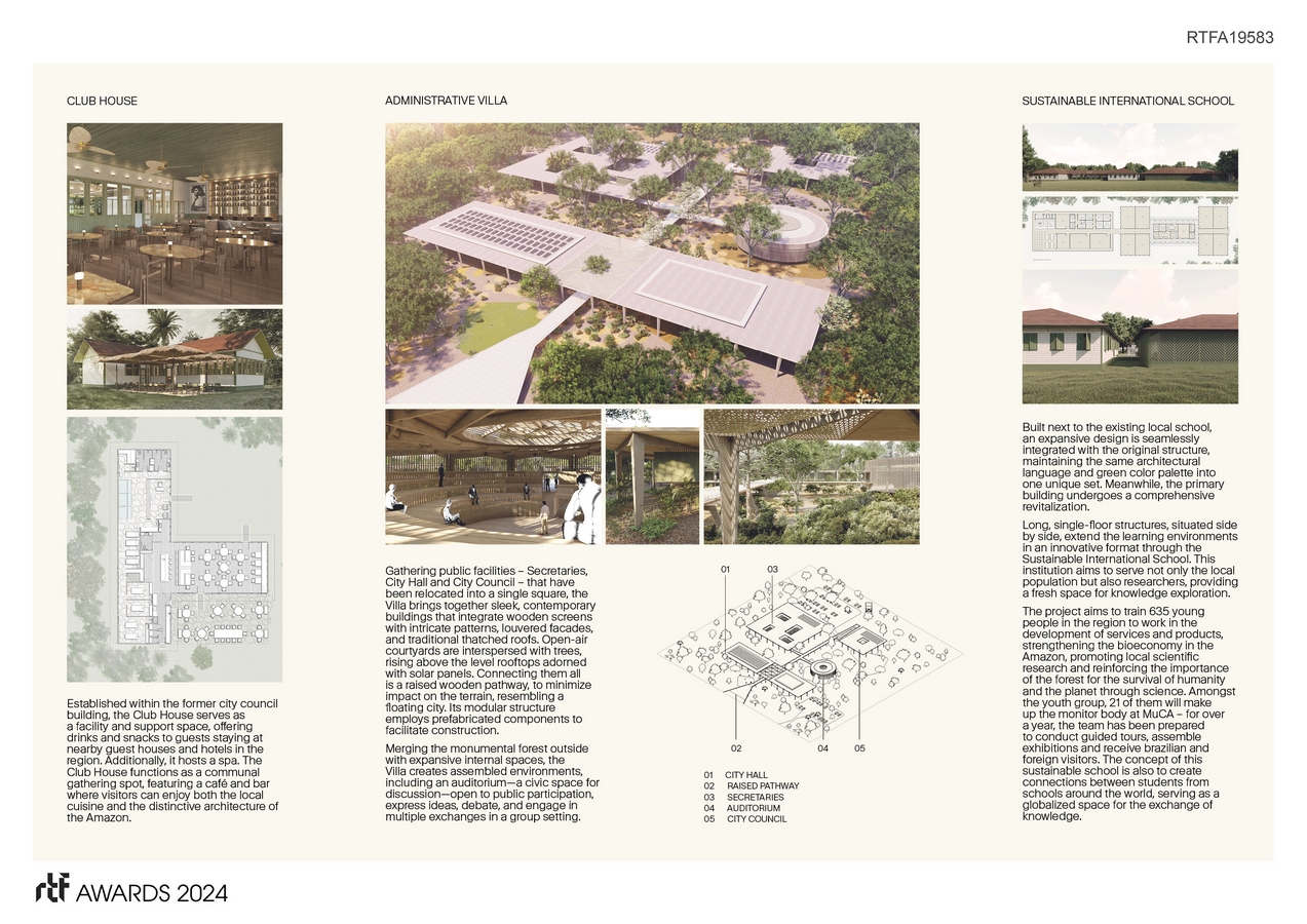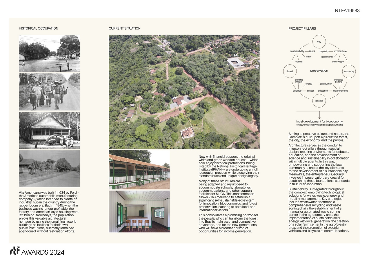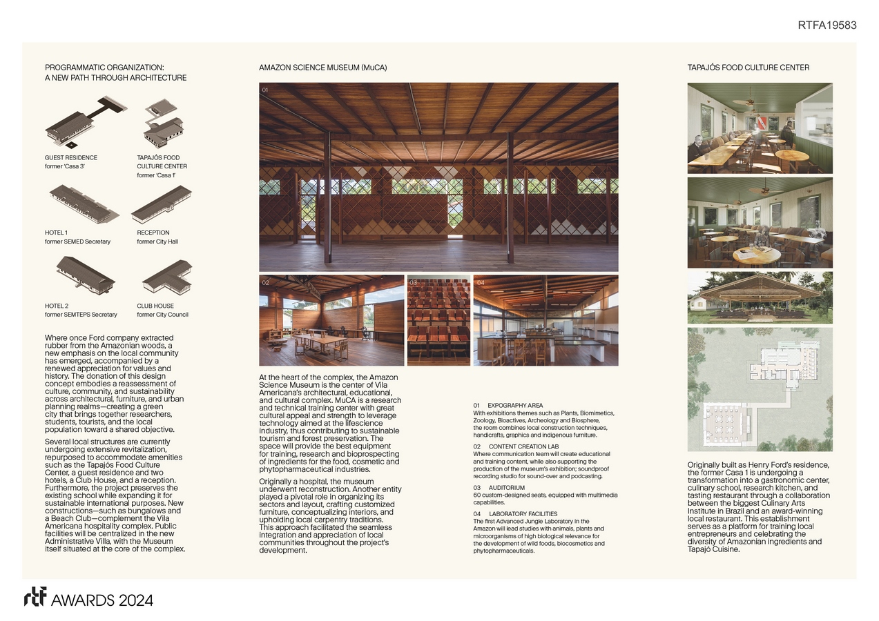 Through the revitalization of historic buildings and the creation of new facilities in Vila Americana in Belterra city (Pará, Brazil) – a former village created by Henry Ford in 1930’s during the rubber boom era to support an industrial hub by the American automobile manufacturing company –, the architectural complex underscores the preservation and legacy of local nature and culture, aiming to host a forest civilization in modern times. Architecture serves as the conduit to interconnect the city, the forest, and the people through spatial design, creating environments for hospitality, education and the advancement of science and sustainability.