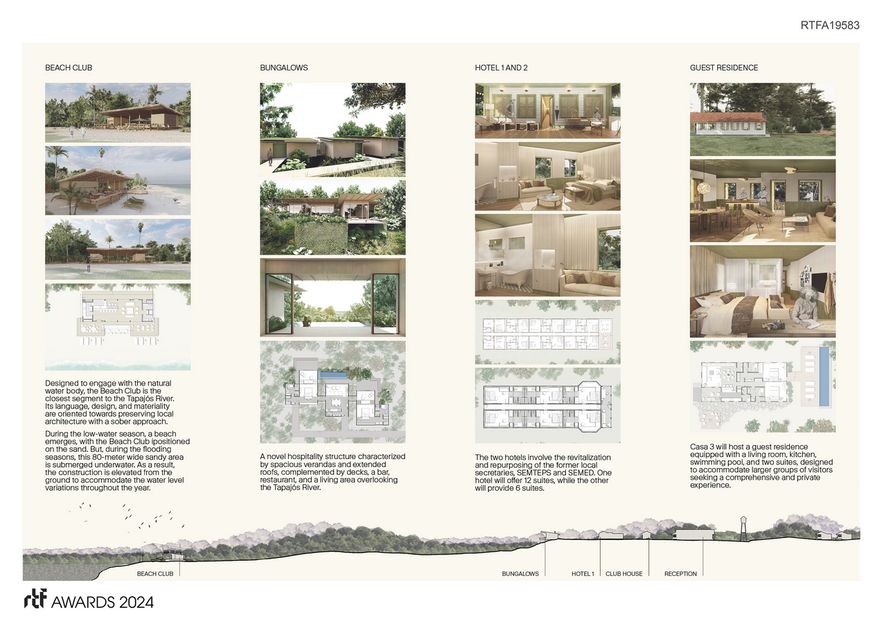 Some of the local structures are undergoing full revitalization while being repurposed to accommodate facilities such as the Tapajós Food Culture Center; a guest residence and two hotels, a Club House, and a reception. The project also preserves the existing school, expanding it to a Sustainable International purpose. New buildings – such as bungalows and a Beach Club – complement the Vila Americana hospitality complex. Public uses will be centralized in the new Administrative Villa, while the Museum itself is placed at the complex’s center.