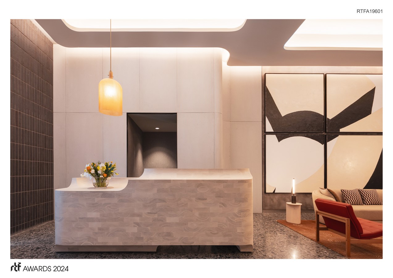 This architectural marvel’s imposing facade resonates in the concierge desk, where a deliberate softening mirrors the tower’s softened contours. Carved from a single, substantial mass of warm oak butcher block, the desk emerges as a testament to meticulous craftsmanship, executed by a collective of skilled artisans. Its sculptural form serves as a functional focal point for the lobby and seamlessly integrates with the building’s ethos, echoing its shapes and details throughout.