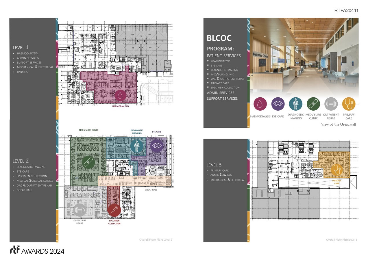BLCOC serves as a comprehensive healthcare hub, offering a spectrum of primary care and specialized services. With approximately 100 clinical spaces, the facility caters to diverse medical needs, encompassing physiotherapy, diagnostic imaging, dialysis, and post-treatment follow-ups. Central to its architectural vision is the Great Hall, a double-height space designed to nurture patient well-being, fostering social interaction and tranquility amidst its welcoming ambience.