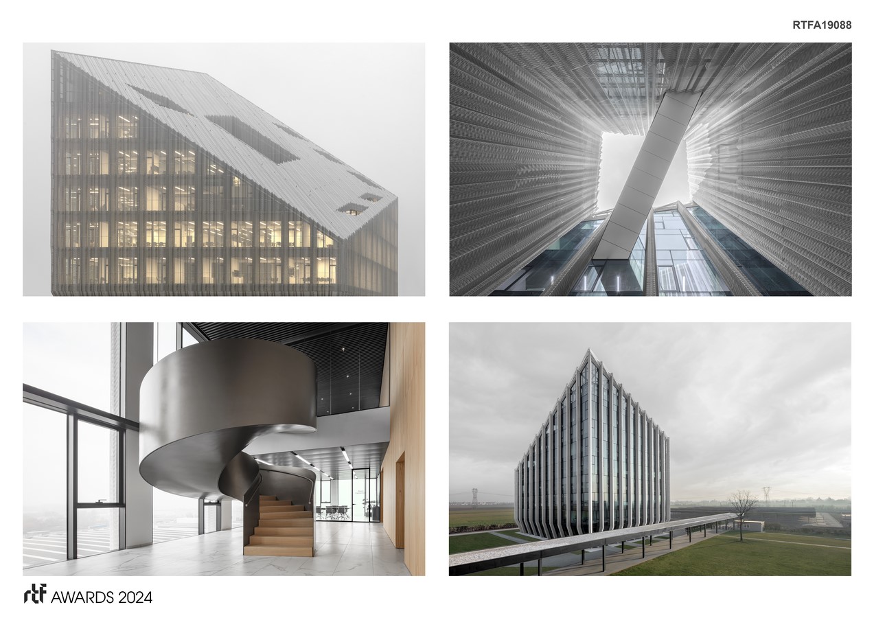 The cornerstone of the design was to incorporate the courtyard typology into the building. This courtyard houses a green garden on the ground floor and enhances natural ventilation through a chimney effect. In response to local sunlight conditions, the building’s roof has been tilted, enlarging the north facade to maximize workspace with indirect natural light while reducing the south facade to improve indoor comfort. It’s almost a celebration of indirect northern light, articulated through the building’s geometry. The south-facing facades and roof of the headquarters are clad in a second skin made from a custom continuous aluminum mesh, which filters intense light and ensures a comfortable indoor environment.