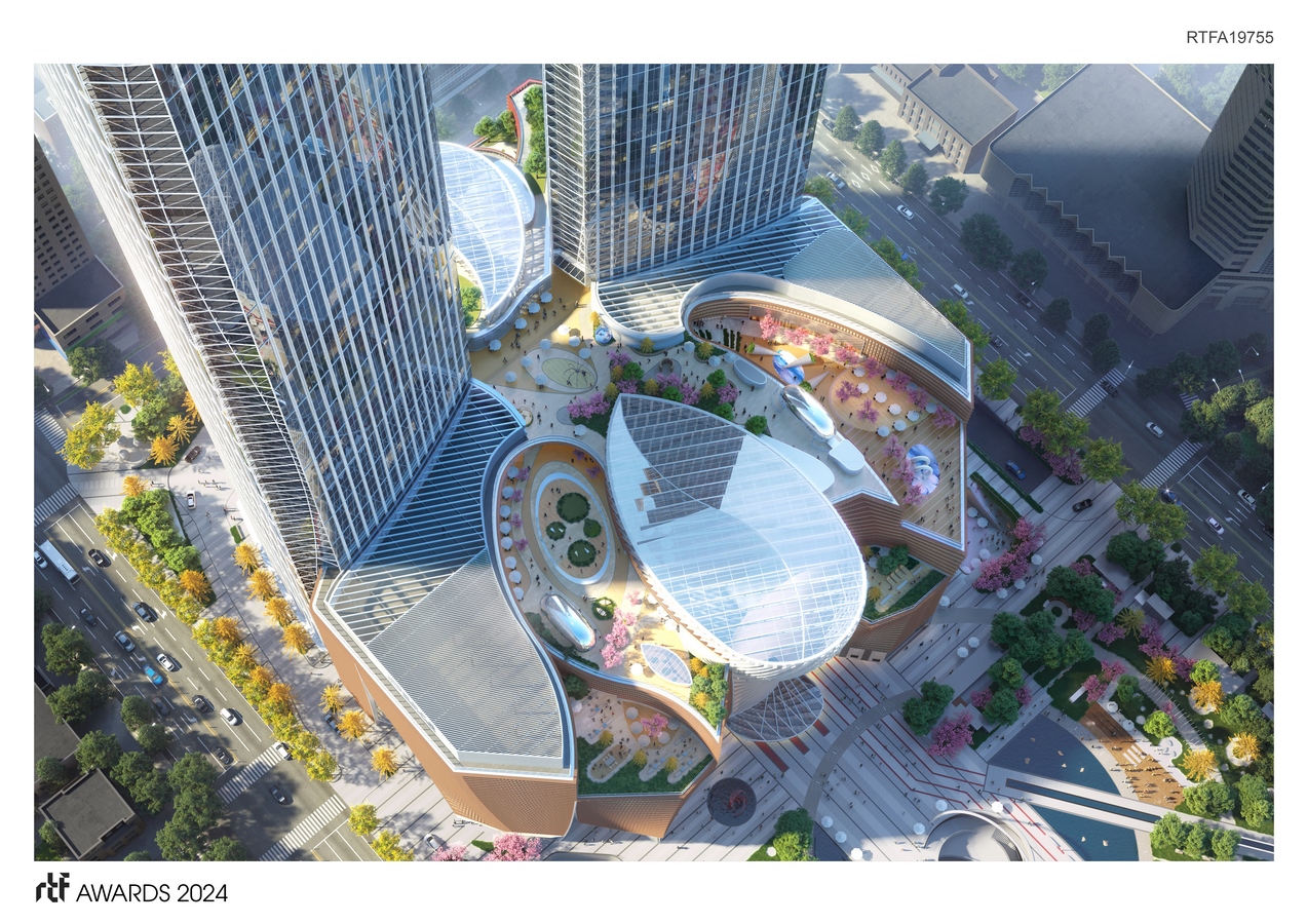 A variety of terraces at various podium levels provide open unobstructed views and are programmed with unique functions such as observation platforms, lifestyle, bars, gardens, and art galleries.
