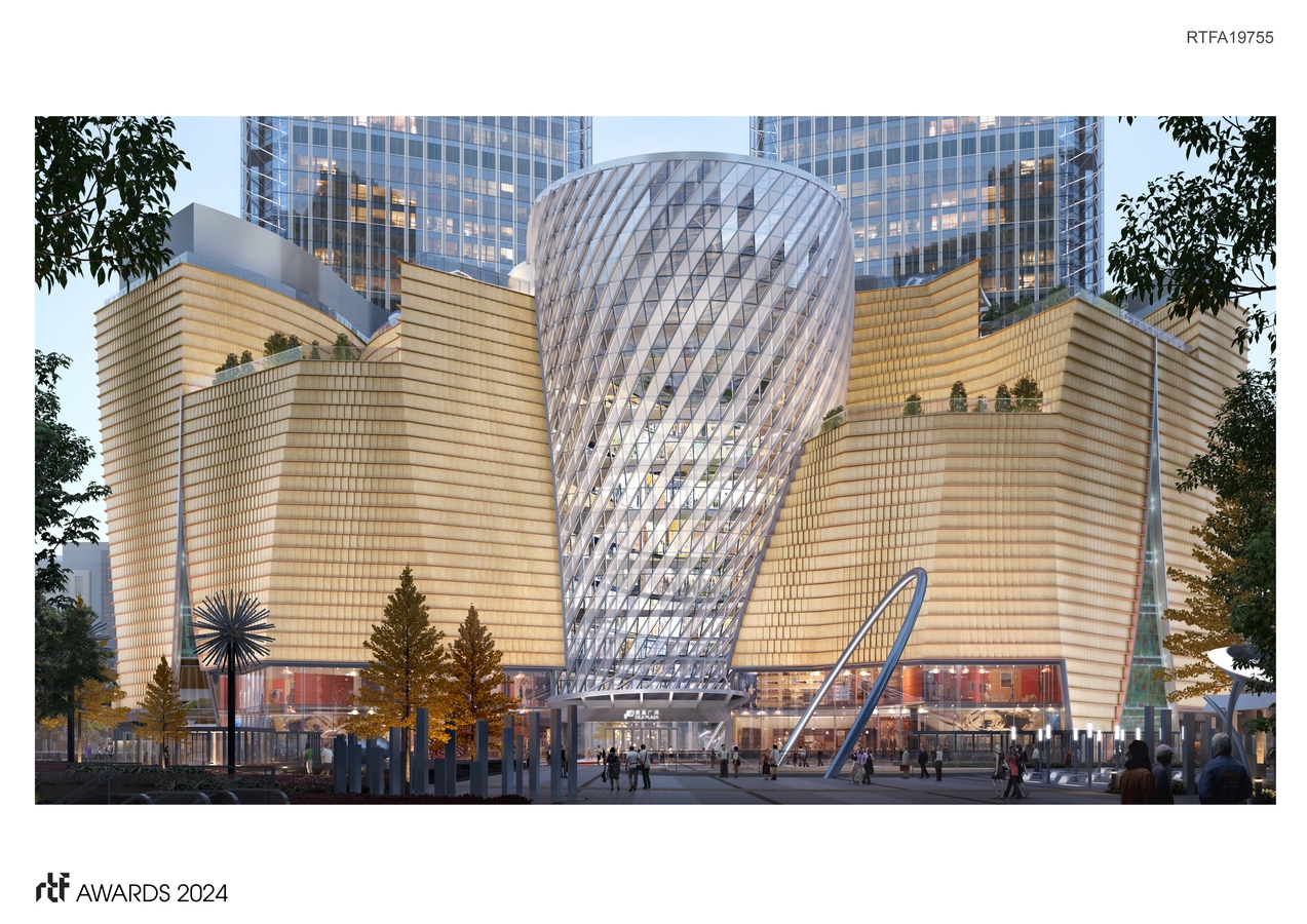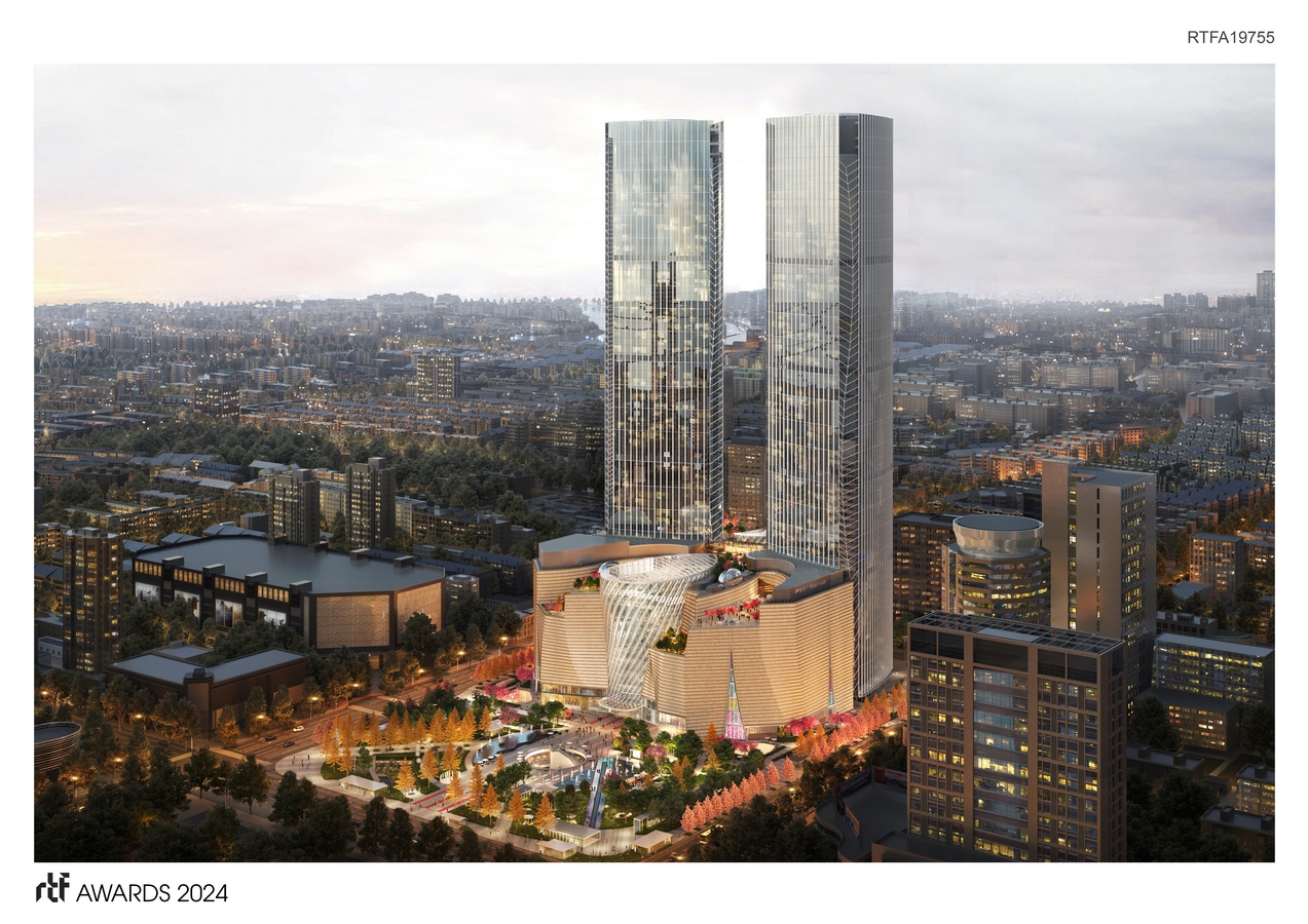 Deji Plaza Xuzhou is in the heart of the city’s Central Business District, Xuzhou, China. Designed to exceed the stringent environmental code of China Green Star’s 2-star rating, the project totals 351,206 m2 (3,780,350 sq.ft.). This mixed-use program includes twin 60- story, 259 meter(850 feet) tall towers with high-end residential condo space. The podium is a luxury retail mall which also contains a large art gallery, IMAX cinemas, exhibition spaces and a variety of restaurants.