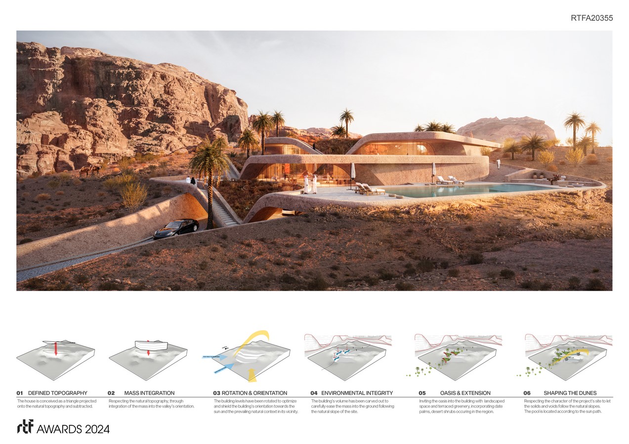 The design concept of Dune Residence revolves around the idea of creating a sanctuary that celebrates the beauty of its desert locale. The building’s volume is meticulously sculpted to gently merge with the terrain, respecting the site’s topography while optimizing its orientation to harness natural light and ventilation. Inspired by ancient architectural techniques, such as wind catchers, the residence utilizes passive cooling strategies to promote natural cross ventilation, ensuring a comfortable and sustainable living environment.