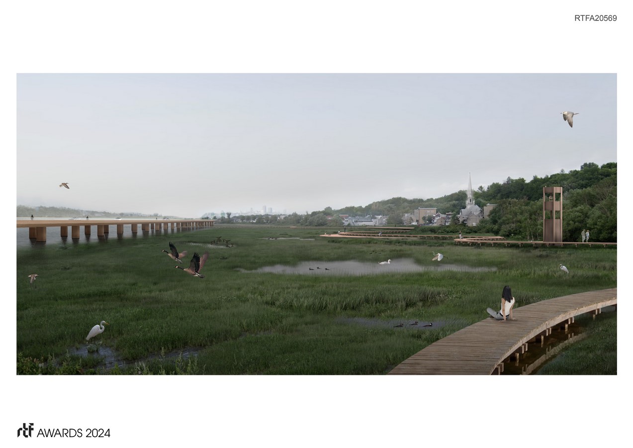 The marsh of the coast, recognized as a sensitive natural habitat, consists of a series of light observation structures promoting a harmonious cohabitation between fauna, the river, and the Saint-Grégoire-de-Montmorency neighborhood which once paced local life.