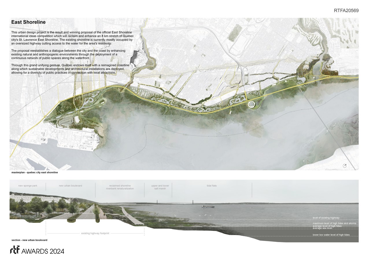 This urban design project is the result and winning proposal of the official East Shoreline international ideas competition which will reclaim and enhance an 8 km stretch of Quebec City’s St. Lawrence East Shoreline. The existing shoreline is currently mostly occupied by an oversized highway cutting access to the water for the area’s residents.