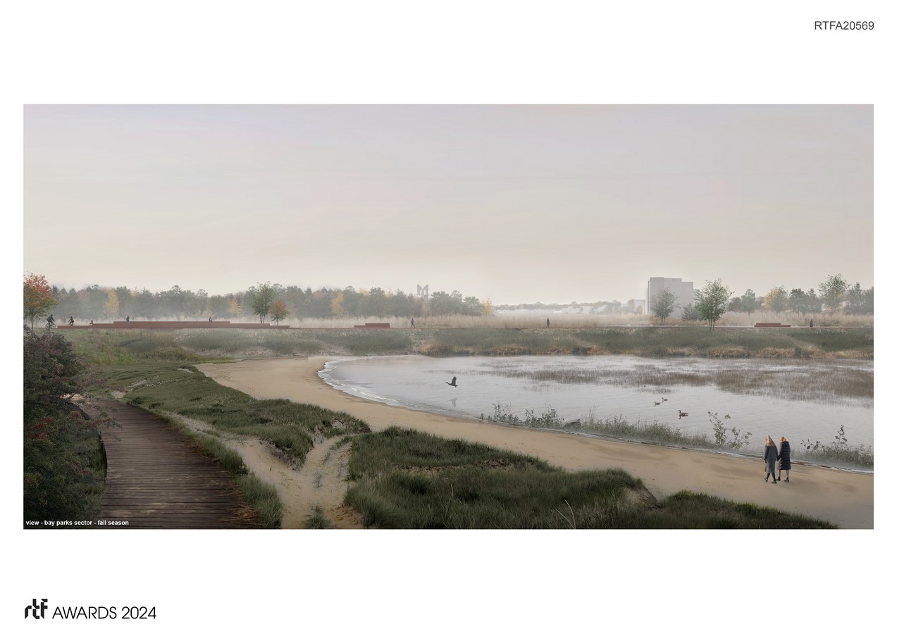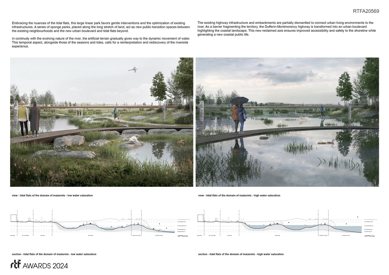 Embracing the nuances of the tidal flats, this large linear park favors gentle interventions and the optimization of existing infrastructures. A series of sponge parks, placed along the long stretch of land, act as new public transition spaces between the existing neighborhoods and the new urban boulevard and tidal flats beyond. In continuity with the evolving nature of the river, the artificial terrain gradually gives way to the dynamic movement of water. This temporal aspect, alongside those of the seasons and tides, calls for a reinterpretation and rediscovery of the riverside experience.