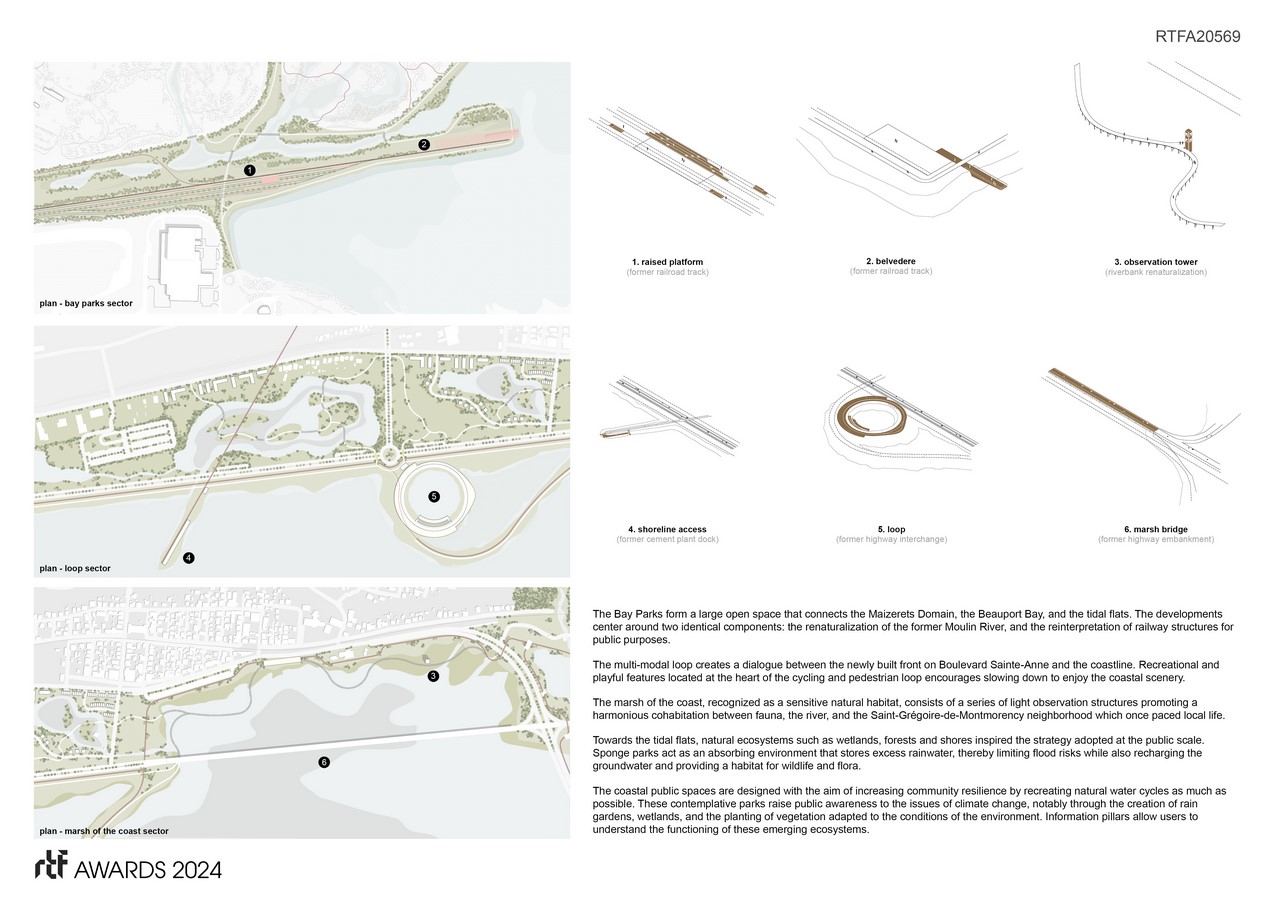 The Bay Parks forms a large open space that connects the Maizerets Domain, the Beauport Bay, and the tidal flats. The developments center around two identical components: the renaturalization of the former Moulin River, and the reinterpretation of railway structures for public purposes.