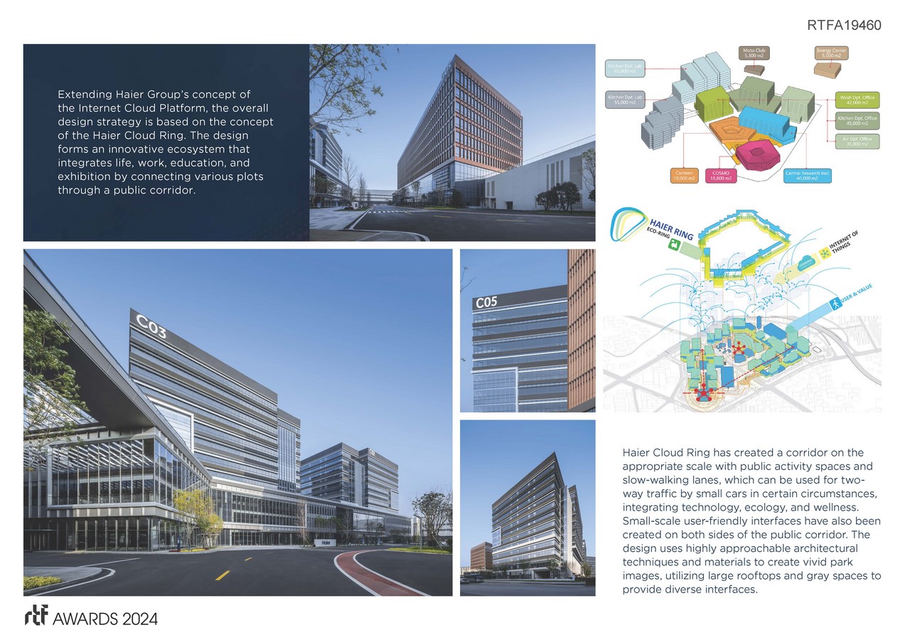 Extending Haier Group’s concept of the Internet Cloud Platform, the overall design strategy is based on the concept of the Haier Cloud Ring. The design forms an innovative ecosystem that integrates life, work, education, and exhibition by connecting various plots through a public corridor.