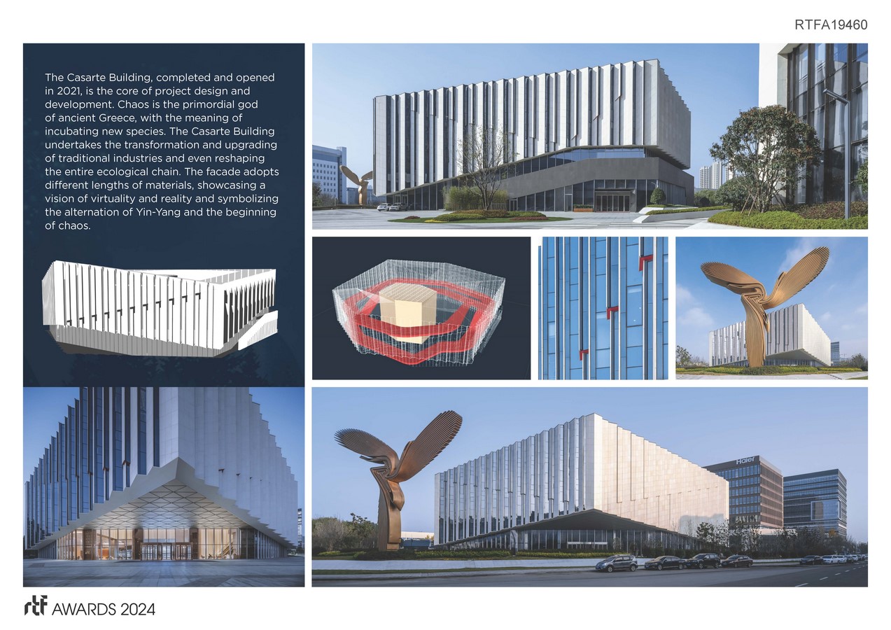 The Casarte Building, completed and opened in 2021, is the core of project design and development. Chaos is the primordial god of ancient Greece, with the meaning of incubating new species. The Casarte Building undertakes the transformation and upgrading of traditional industries and even reshaping the entire ecological chain. The facade adopts different lengths of materials, showcasing a vision of virtuality and reality and symbolizing the alternation of Yin-Yang and the beginning of chaos.