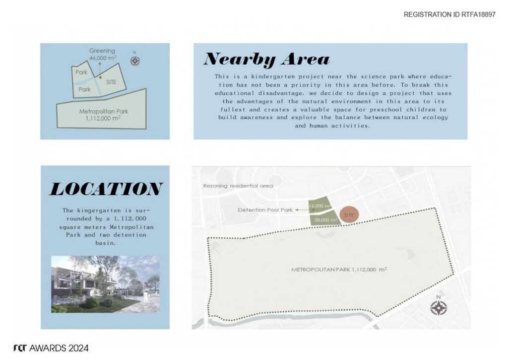 This is a kindergarten project near the science park where education has not been a priority in this area before. To break this educational disadvantage, we persuade our client, who is an estate retailer to choose the project site in an area surrounded by a park and a retention pond, preserving the best environment for preschool children to explore the balance between natural ecology and human activities.