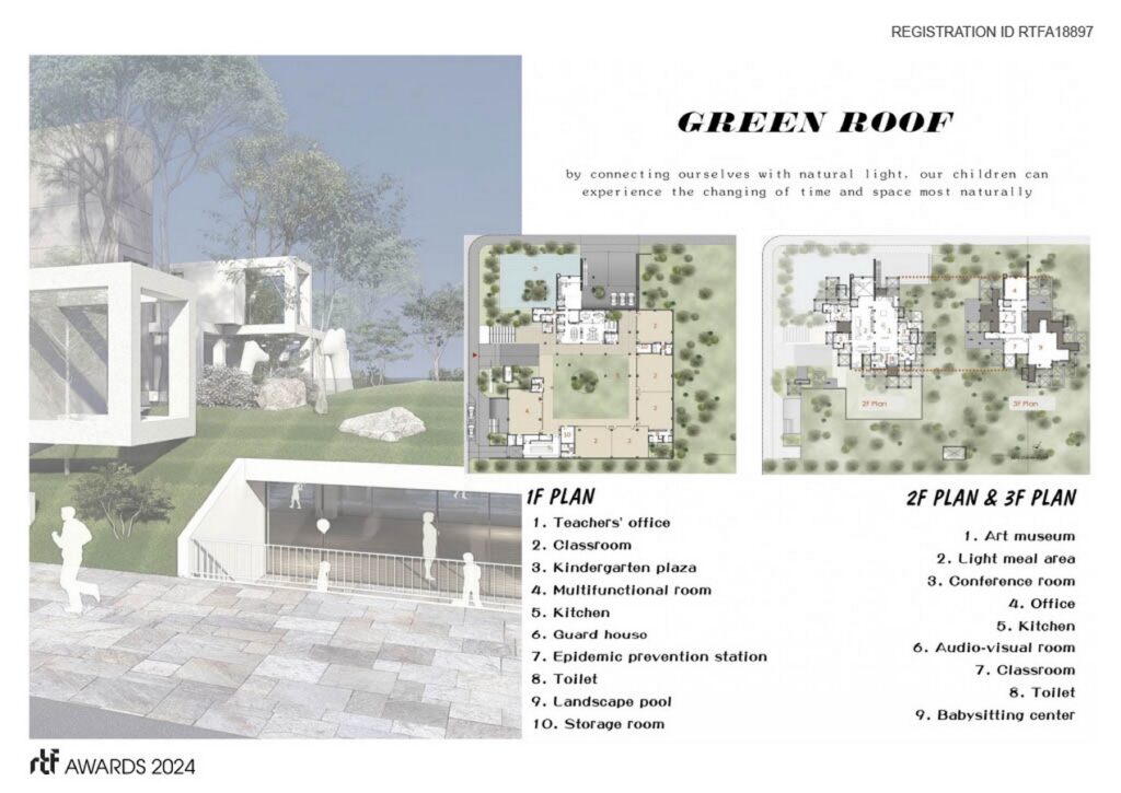 By specifically digging down the structure of this architecture a meter below the original surface, we designate our educational space and playground from an area that extends upward from the ground level like a tree, symbolizing the growths of all species originating from the earth, allowing a better eye contact between human, space, and nature. The design can also be used for collecting water, maintaining the best water resource management. With a 4×4 layered structural framework, other activities spaces such as teacher offices, conference rooms, and art museums for children’s art display are placed on the upper floors that extend horizontally and vertically like a cell division process.