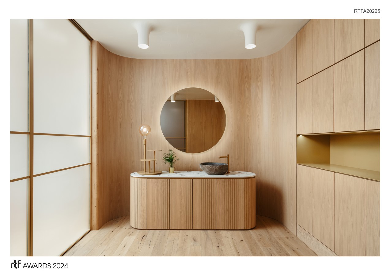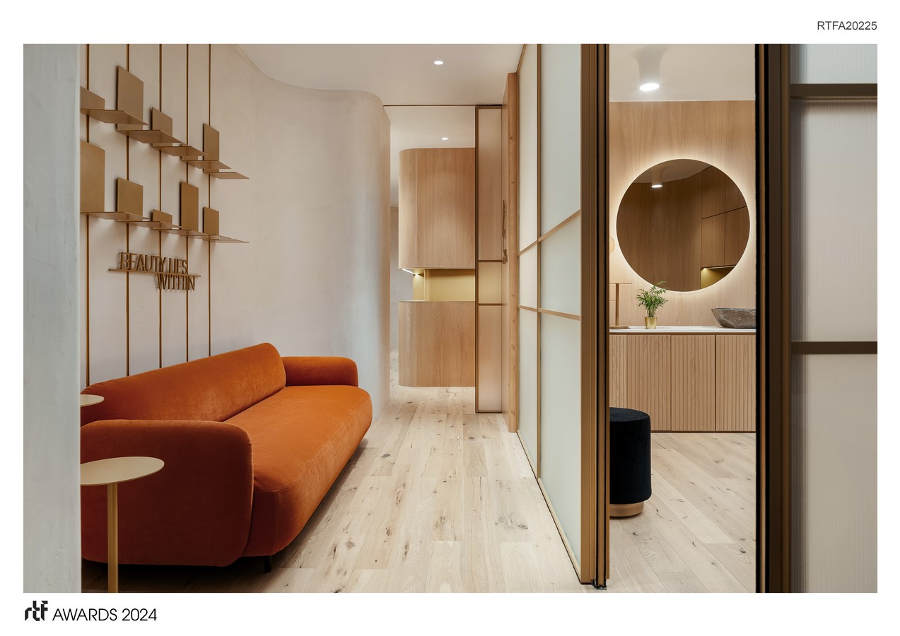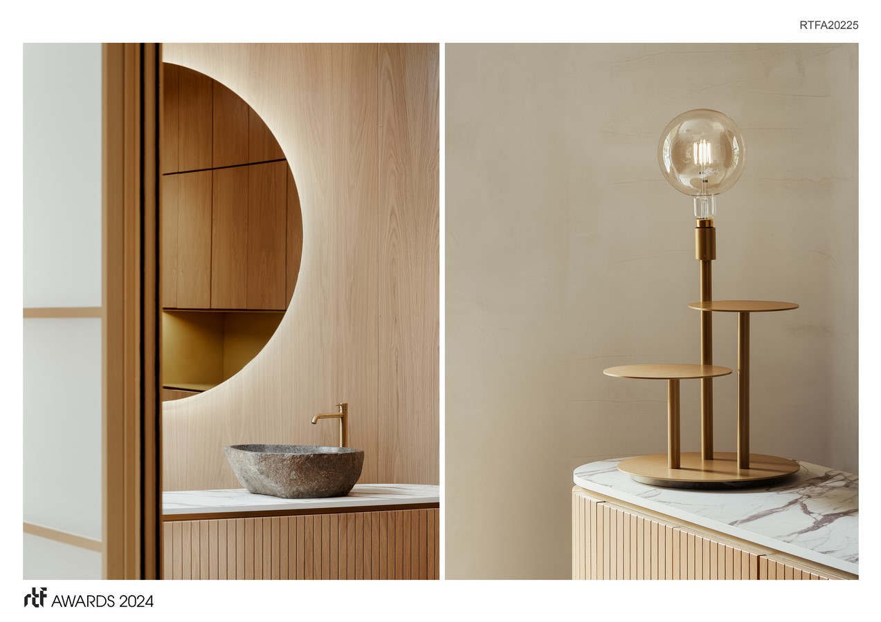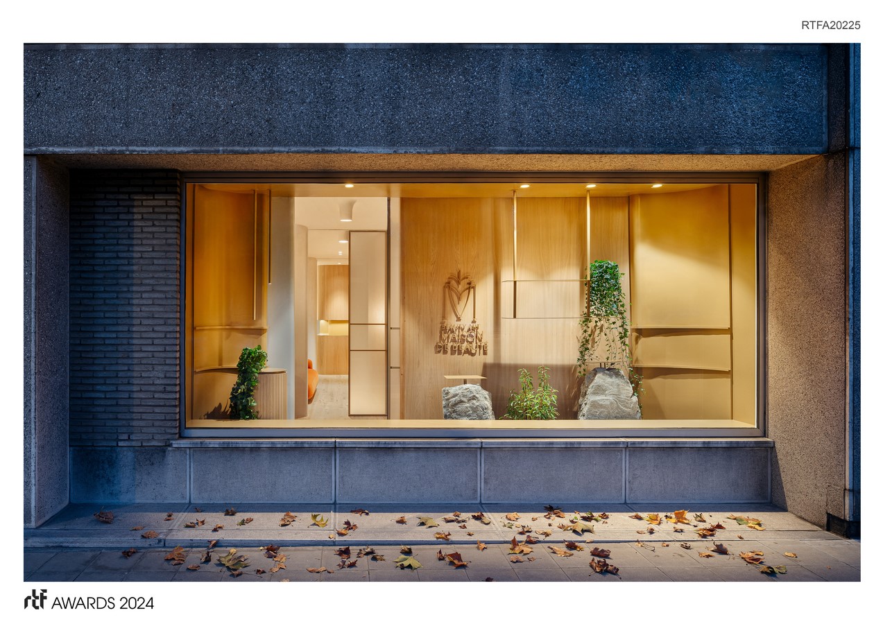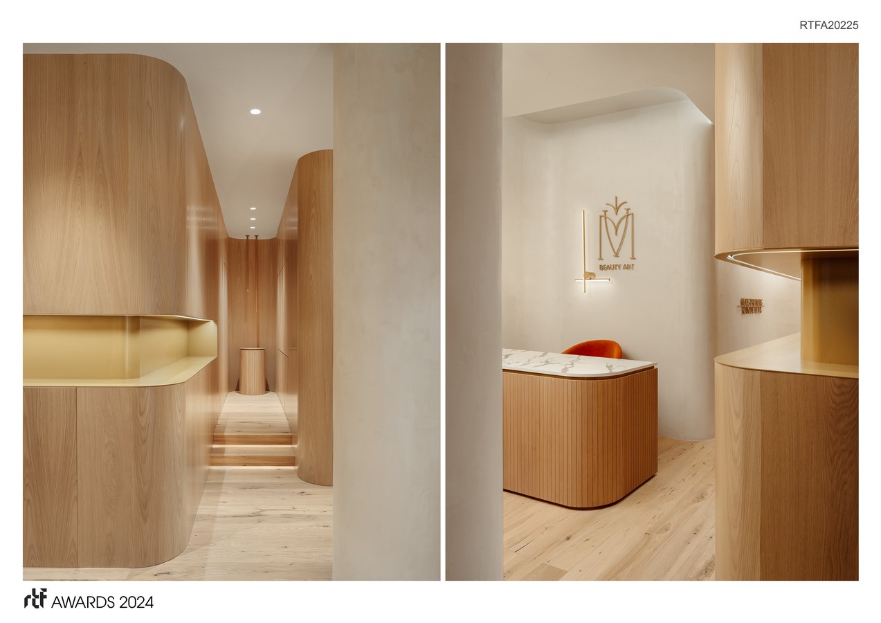 Coarseness of the concrete contrasts with affability and warmth of the natural oak wood, whereas the glass surfaces create an assumed discontinuity between the two materials, articulating the architectural composition at its intercept. Such a fragmentary perceptual experience is re-born through special structures such as wooden boudoirs with complex wooden curved endings, cylinders for product display with wooden vertical elements made of consecutive strips and bronze circular surfaces, metallic bronze showcases penetrating into wooden vertical planes, metal L-shaped bronze wall shelves, round mirrors, specially designed bronze table, wall and floor light fixtures and sculptural lamps suspended from the ceiling. The uniform solid wood flooring creates an undivided conceptual plane, hosting the architectural narrative. In this direction, the sense of wellness becomes anthropocentric, placing the human between two material conditions, promoting natural materials and the sustainable strategic importance of the project within the overall ecological approach of materials.