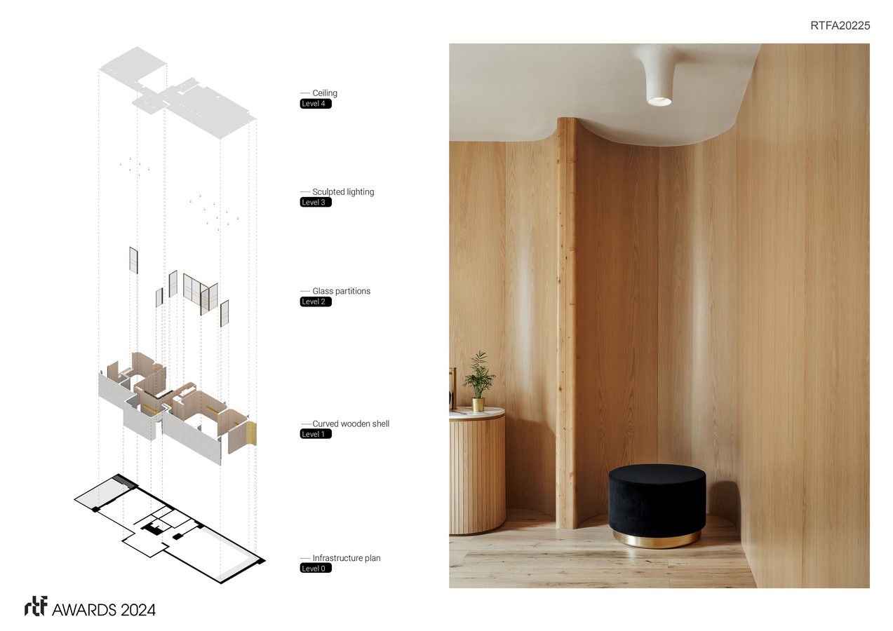The creation of wooden curves for vertical levels called for special models and wood-made prototypes on 1:1 scale, which were assembled at the factory, next de-assembled and delivered on the spot with an application deviation less than 0.1%. The new geometry created by curved surfaces produces a continuous perceptual flow of experiential motion, intensifying the multisensory experience of the space that is enhanced by the alternation of materials.