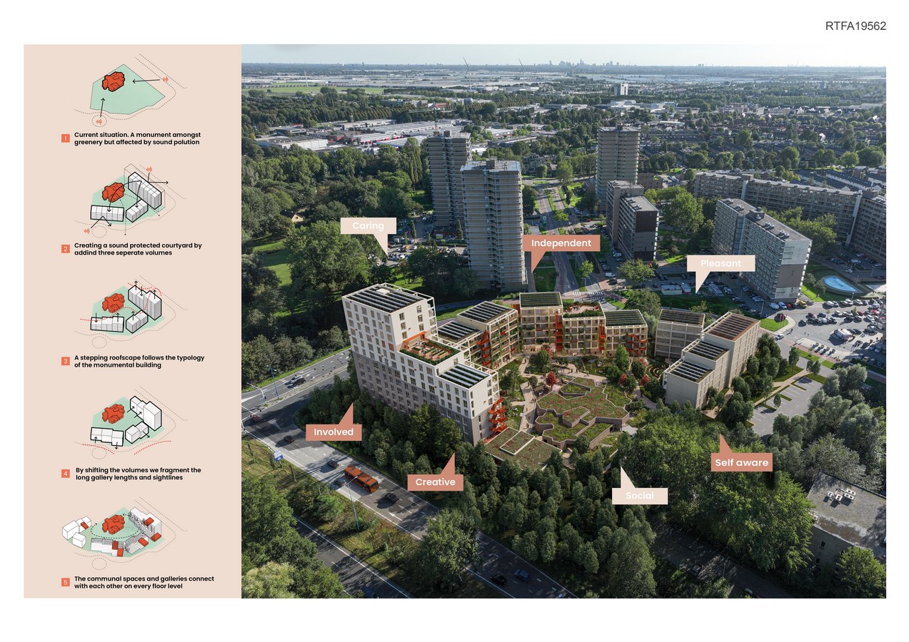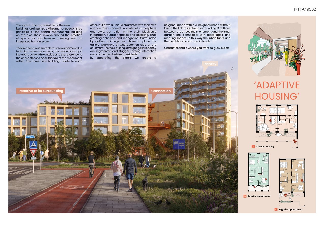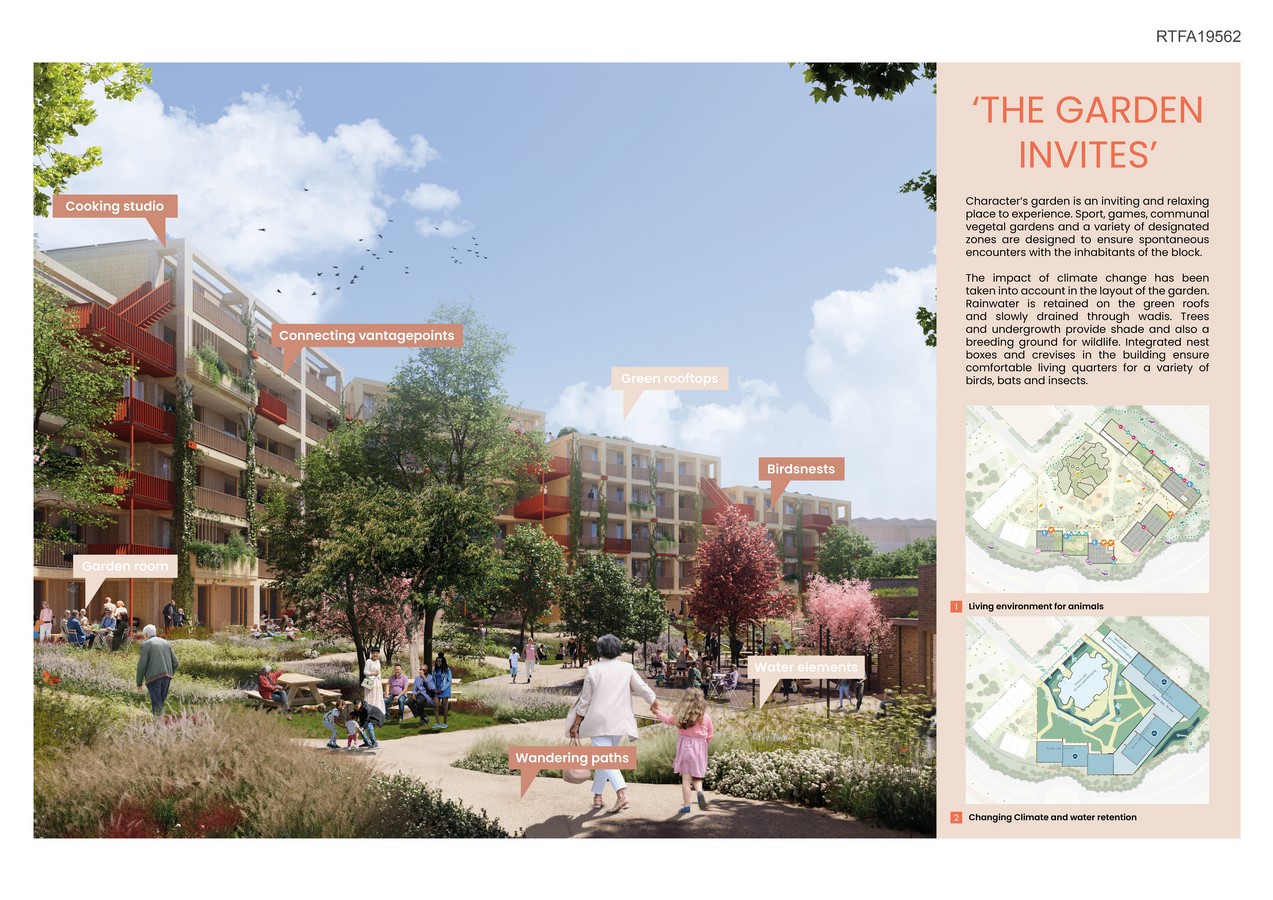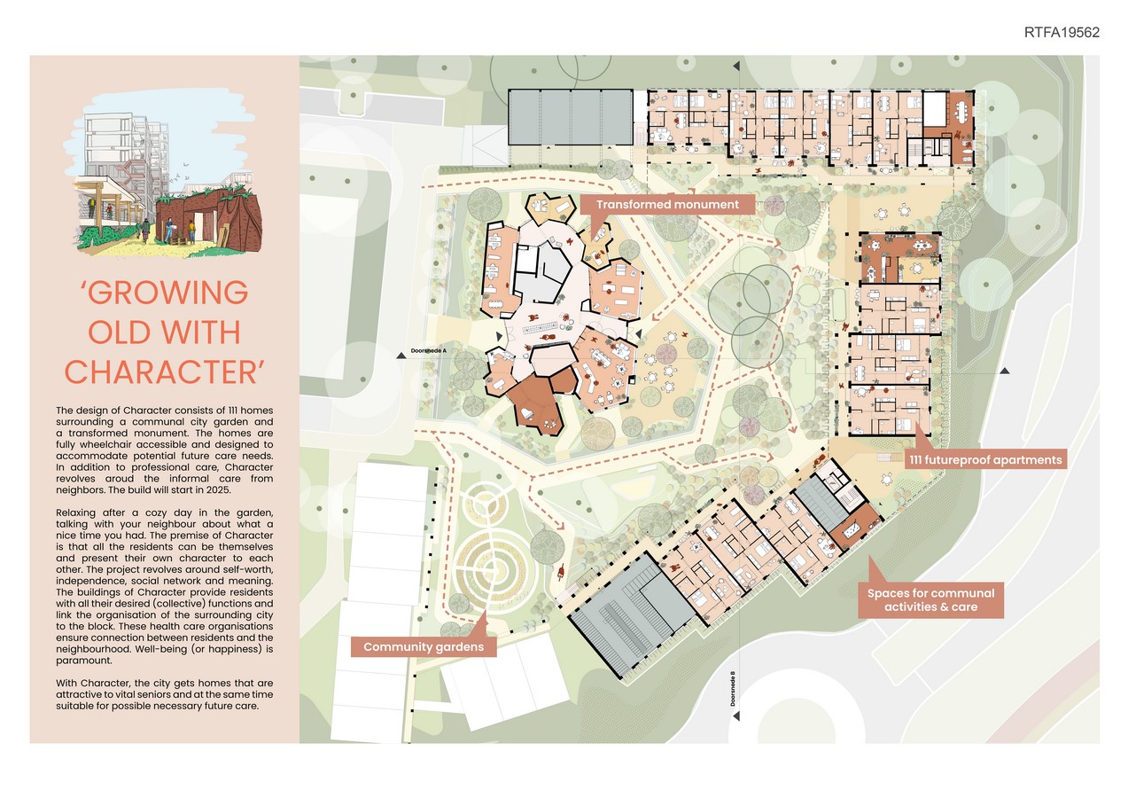 KARAKTER/CHARACTER, an ambitious plan of 111 lifelong homes for vital 55+ individuals in Palenstein, Zoetermeer. This development envelops the transformation of the old ‘Monuta’ building (now called Cornelis), where care and meeting spaces for residents and the neighbourhood will be realised. A perfect combination of tranquility and vibrancy within a high paced environment.