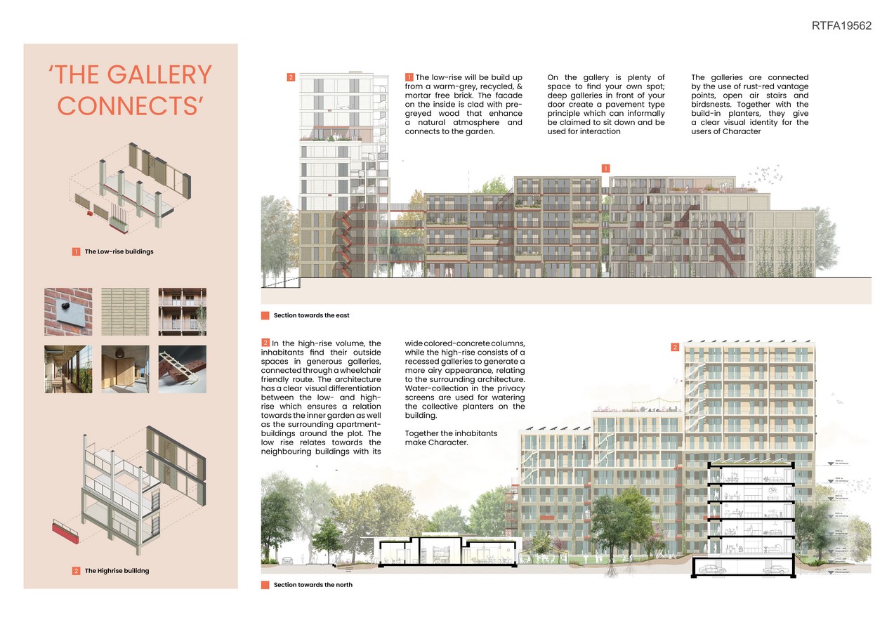 Meeting is central to the architecture of the inner area, resulting in a different form and appearance on this side. The lower levels of the plan aim for a visible connection between the homes, the gallery, and the inner courtyard. In the tall building volume, there are pleasant outdoor spaces on the gallery, connected by a wide wheelchair-friendly route. Even in the two low volumes, there is an opportunity to find your own space; through a pavement like setup in front of your door, there is room to encounter and linger with each other.