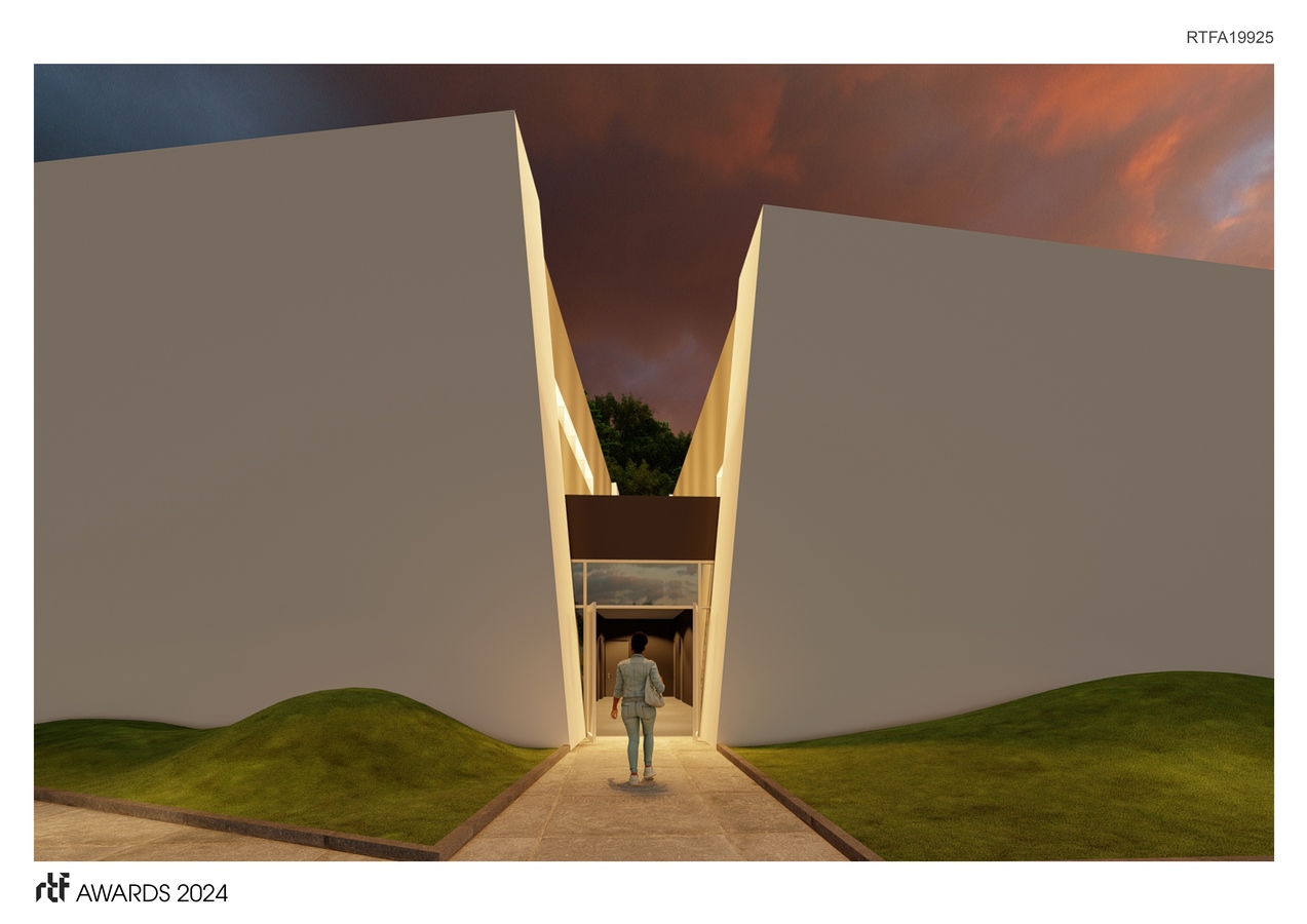 It is a formal gesture that depicts an evolving state. Symbolically, the chromatic intensity of the living, breathing core of the iconic structure is encased within light-colored exterior walls similar in hue and texture to the ash of the volcano. Megalithic planes preside over the western aspect, promising resilience, and protection, yet the fissures separating them offers intrigue and invitation to venture within.
