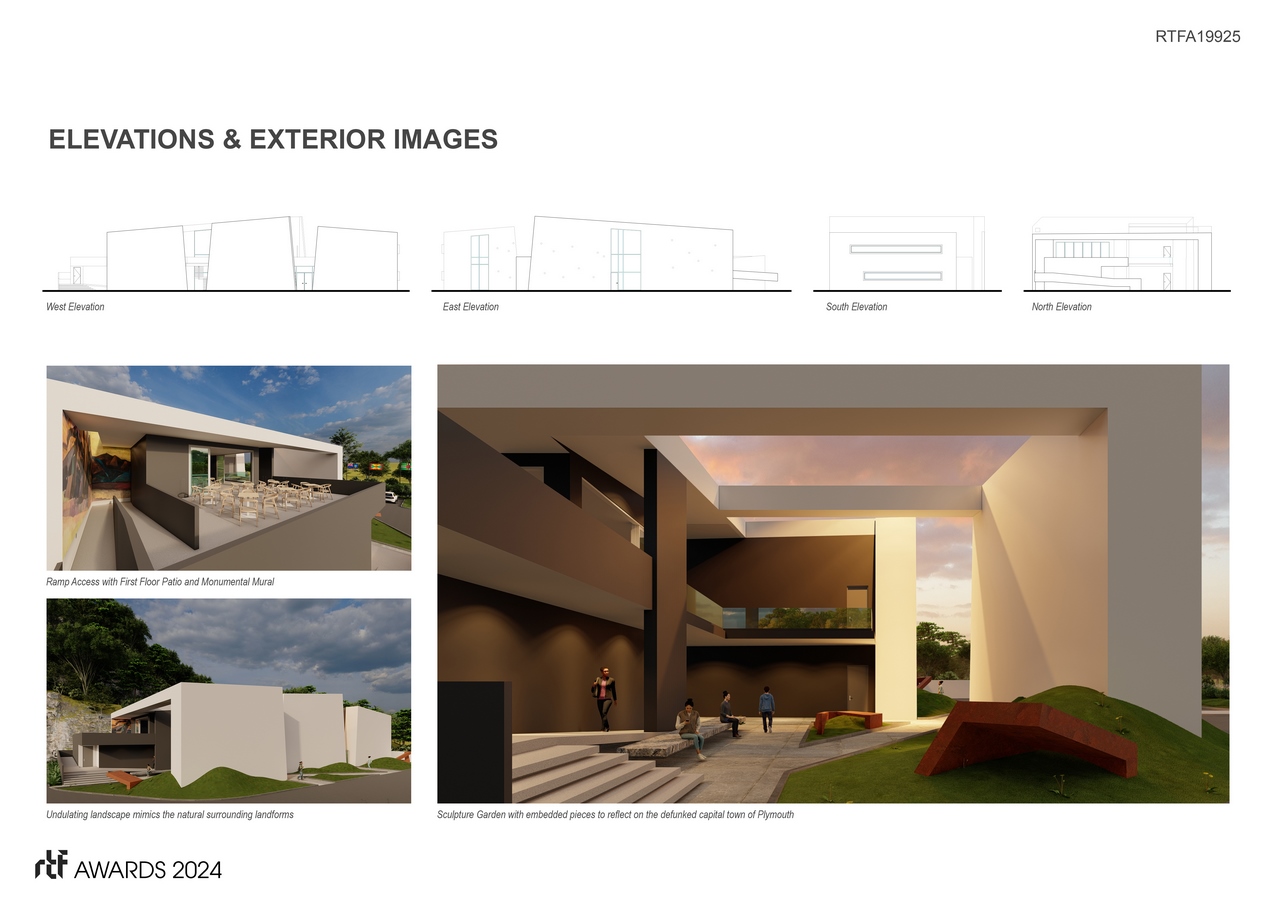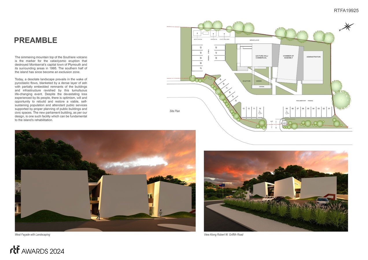 Affirming a sense of a people, a place and an experience, the design for the Montserrat Parliament Building embodies a site for reflection and transformation – aiming to galvanize the island’s collective spirit for development and continued engagement with the ever-present volcano. Conceptually, three dissimilar, interlocking volumes emerge from the terrain, unified by material, landscape circulatory spaces to form a cohesive whole.