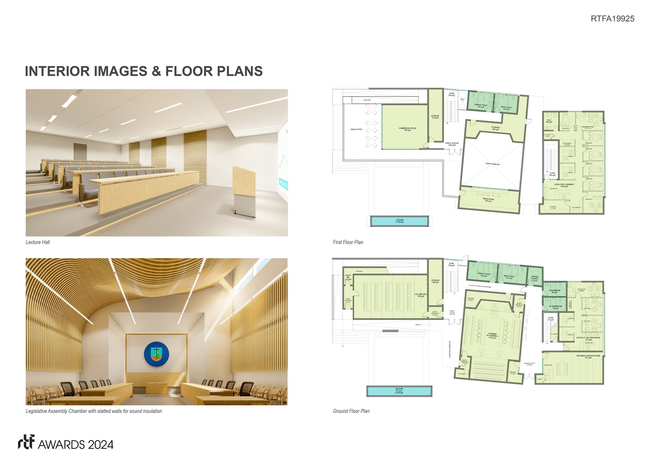 The organizing principle of the plan defines efficient zones of operation for government business while welcoming the public as ‘participatory observers’ in the democratic process of governance. The Chamber Assembly is seated centrally within the composition. It is flanked by secure spaces for administrative offices in the south while the Lecture Hall and commercial space are set within an expanded frame to the north.